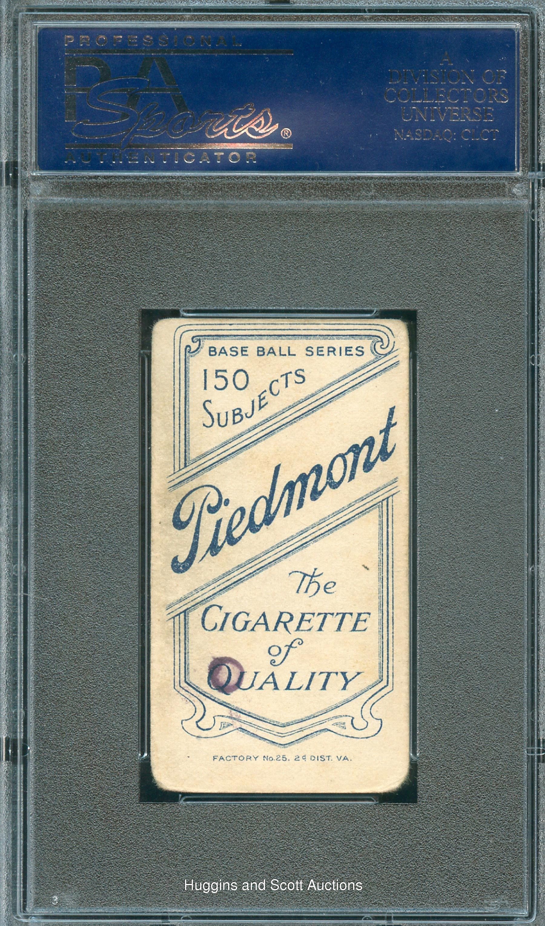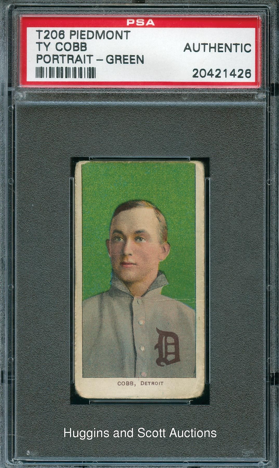 Graded Authentic by PSA. The budget conscious "T" collector seeking to add a quality Ty Cobb to their collection will be hard-pressed to find a superior example than the offered 1909-11 T206 White Border (green portrait) pose. With deference to slight trimming along the upper edge, the obverse presents (Good) with moderate surface wear commensurate with the grade. The Piedmont 150 Subjects advertising back is absent of any paper loss or writing.