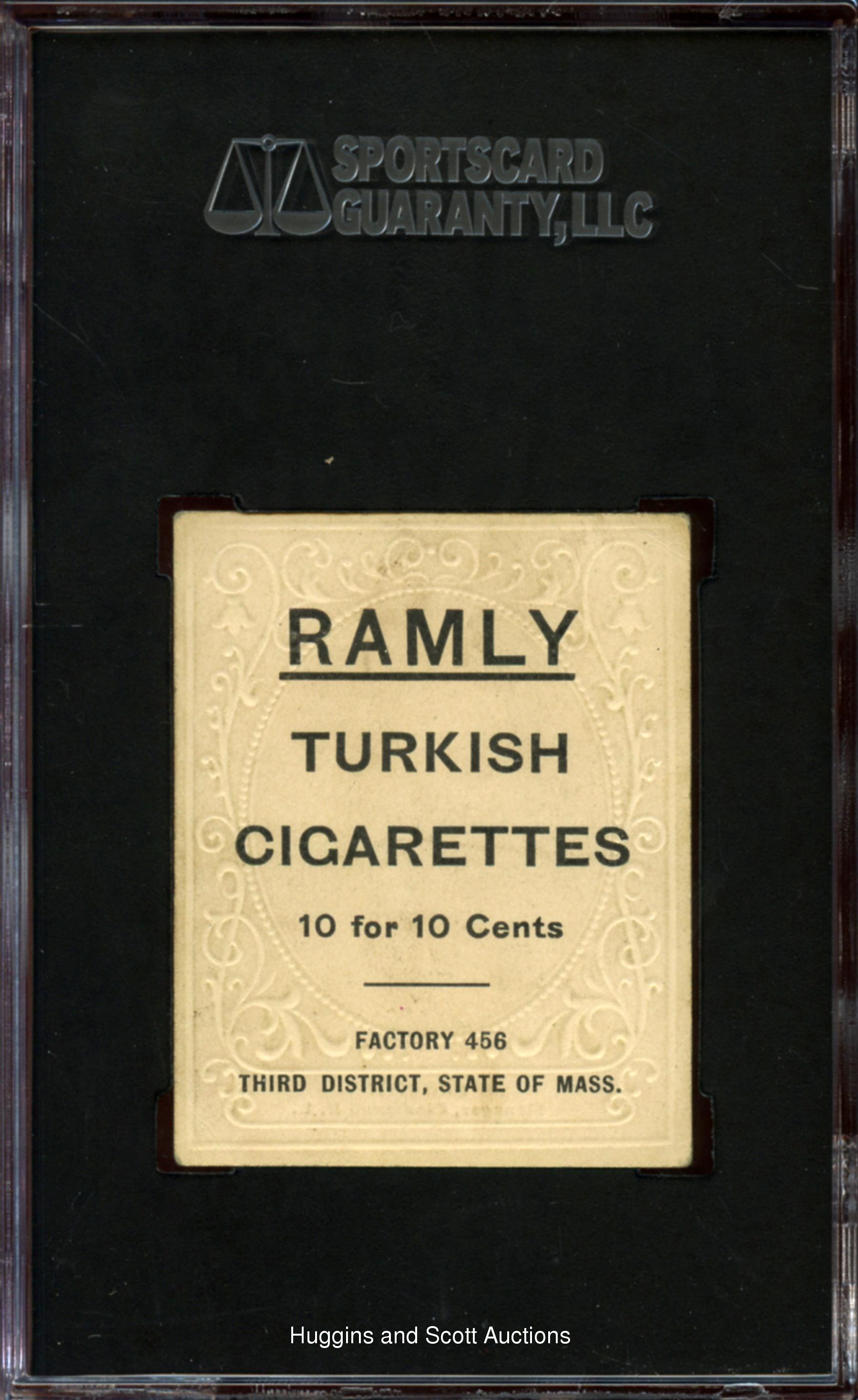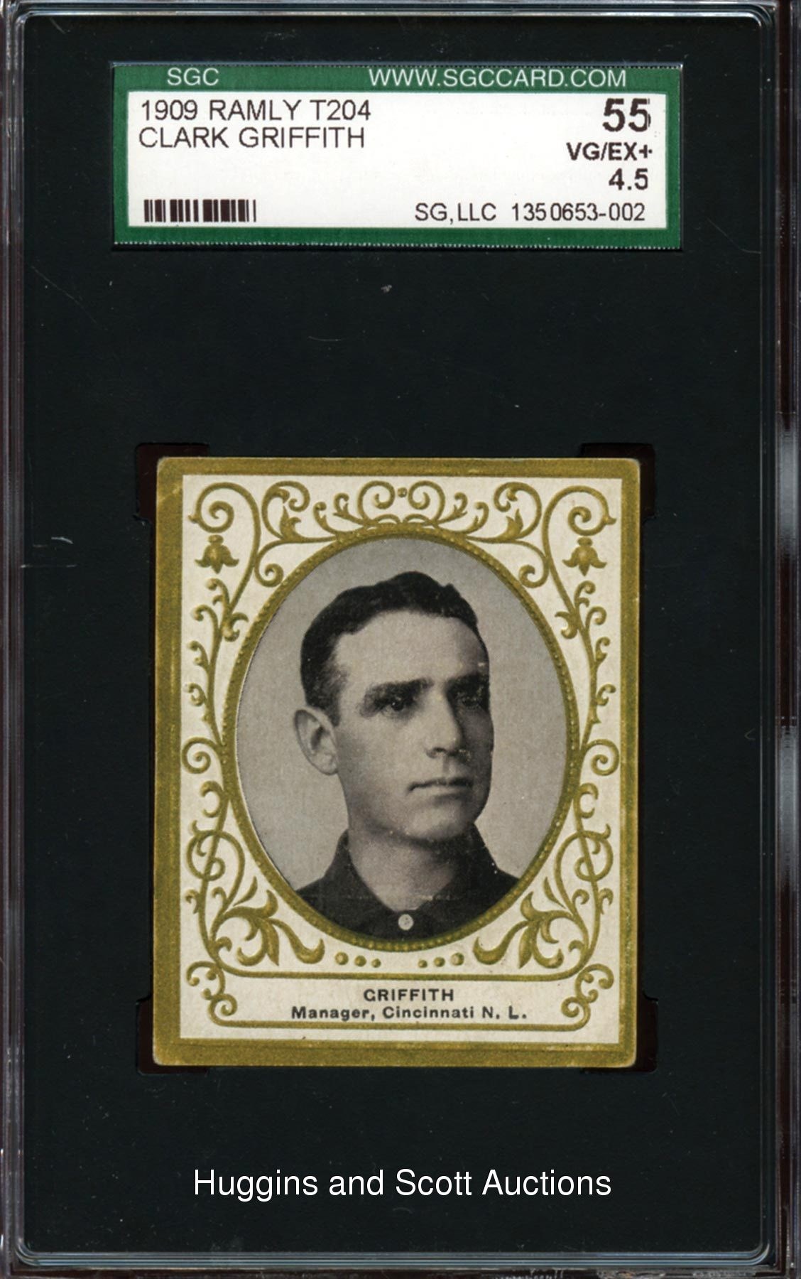 Graded 55 VG-EX+ by SGC. The turn-of-the-century tobacco card specialist will be pleased with the offered 1909 T204 Ramly Clark Griffith portrait. The Hall of Fame skipper for the Cincinnati Reds stands apart from a crease-free surface with only limited peripheral wear associated with the technical assessment. The bright advertising back is clean. The sole representative at the grading level with only two better.