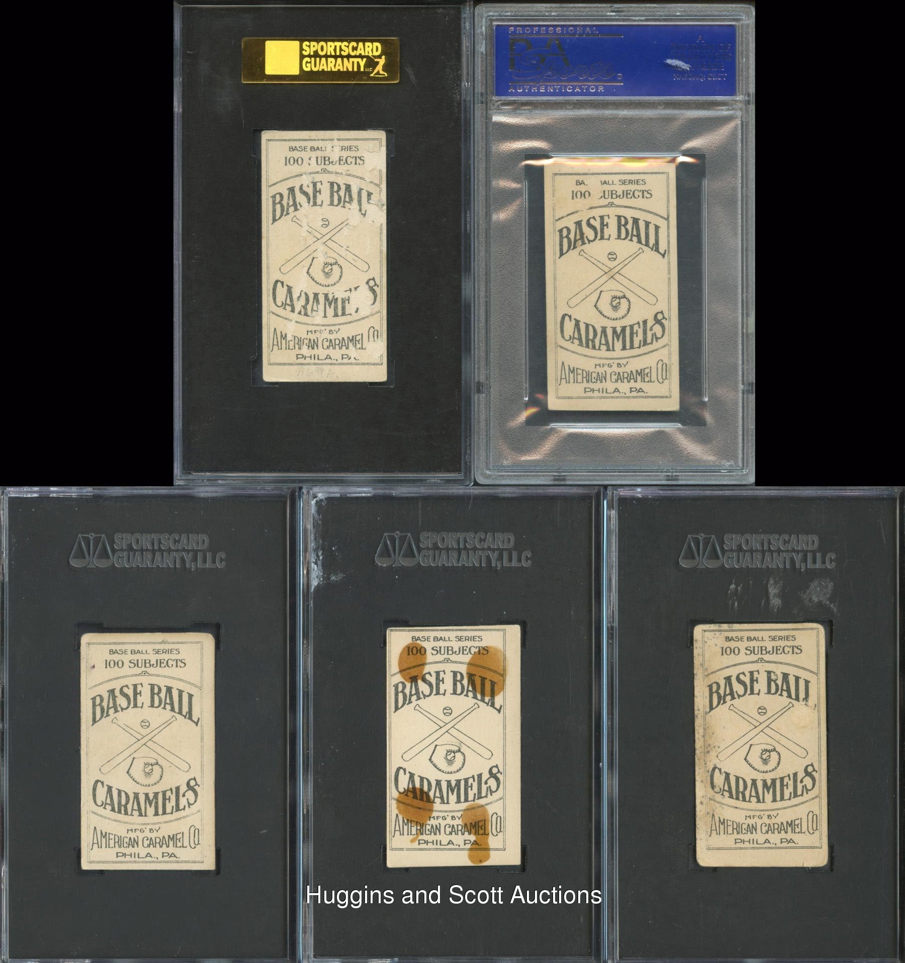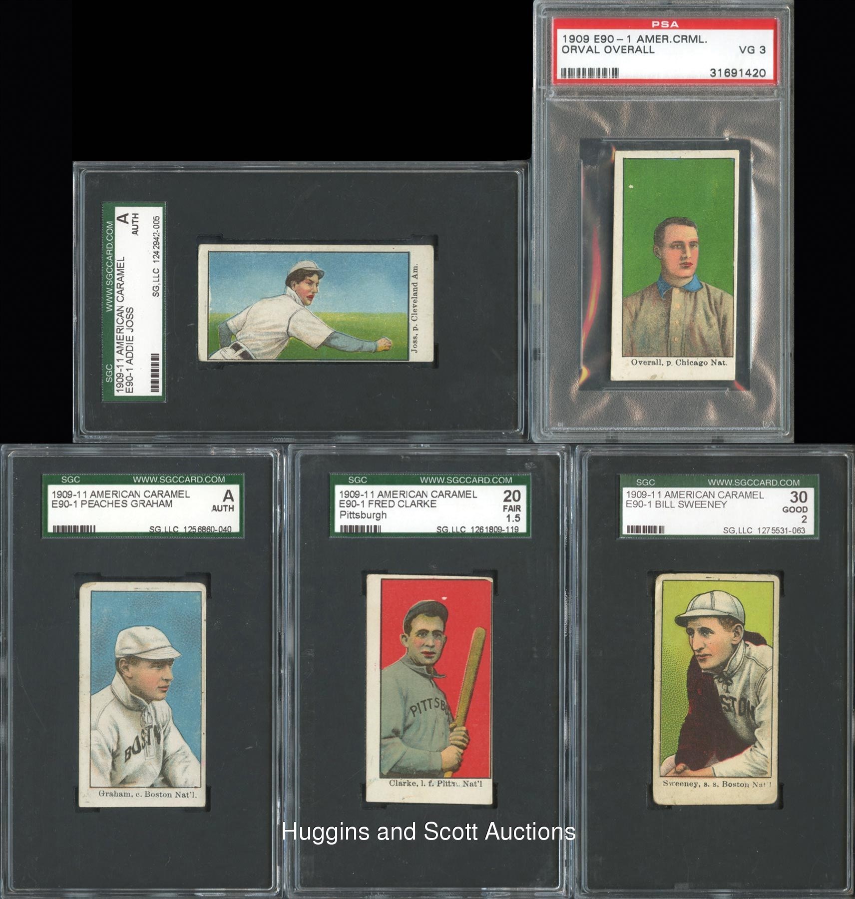 Those pursuing the underrated 1909-11 E90-1 American Caramel series will want to place a strong bid on these (5) Hall of Famers and shortprints. Each graded by either PSA or SGC. Included are PSA 3: Overall SP (reverse paper loss); SGC 30: B. Sweeney SP; SGC 20: Clarke SP (Pittsburgh, reverse residue); SGC Authentic: (2 cards) with P. Graham SP and Joss SP (Pitching, reverse paper loss).