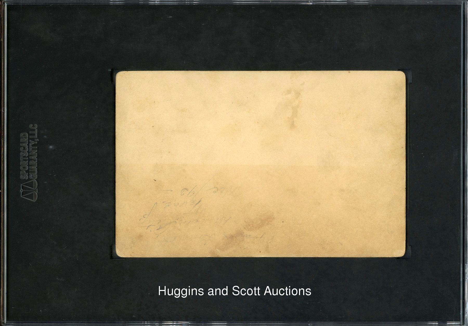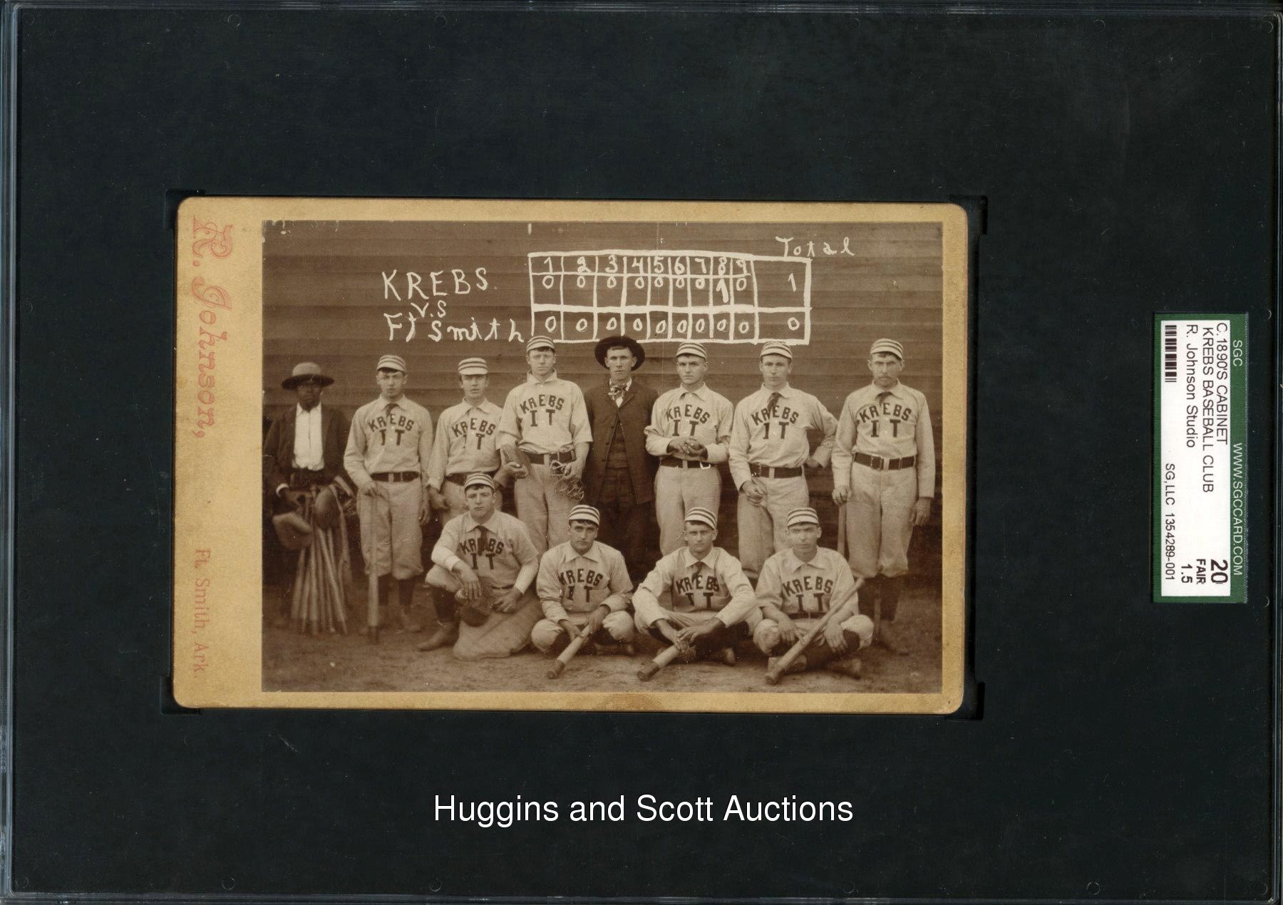 Predating the previously first known Joe McGinnity baseball image by two years is this circa 1892 Krebs (Oklahoma) vs. Ft. Smith (Arkansas) team cabinet. Graded 20 Fair 1.5 by SGC, the gelatin print measures 6-3/8 x 4-1/4” and was produced by R. Johnson of Fort Smith. The 21 year-old future Hall of Famer is pictured with ball in hand standing third front right. Was produced in commemoration of a Krebs vs. Ft. Smith contest which resulted in McGinnity fanning 21 batters while future big league rival Pink Hawley whiffed 24 Arkansans. A pencil inscribed notation on the reverse reads "Frank Barnett, Denison City, Texas Rec./93". Otherwise, the sturdy cabinet is crease-free with a combination of moderate perimeter wear and reverse fingertip impressions. More details on our website. The 1892 Krebs (Oklahoma) vs. Ft. Smith (Arkansas) was the first duel between Joe McGinnity and Emerson (Pink) Hawley but was far from their last meeting. This amateur rivalry would ultimately carry over to the big leagues as Hawley made his debut for the St. Louis Browns in 1892 while McGinnity ended up making his first appearance for the 1899 Baltimore Orioles. Had McGinnity shared the same fate as 100 of his coal-mining comrades in 1892, baseball history might never have been the same. McGinnity, an Illinois native, moved to Krebs to work in the mines and narrowly escaped death in the Krebs No. 11 mine on Jan. 7. 1892, according to the work Baseball in Oklahoma. Oklahoma’s first organized baseball game was played in Krebs on July 4, 1882. However, it was not until McGinnity arrived in the territory that the Krebs team became a force. Rival squads soon sprouted throughout the Indian Territory’s coal country, lining up for a shot at McGinnity and his squad. Iron Man McGinnity later moved on to play for Brooklyn, Baltimore and the New York Giants. He compiled a 247-144 ledger over ten seasons with a career earned-run average of 2.64. McGinnity passed away in 1929 and was inducted into the National Baseball Hall of Fame in 1946.