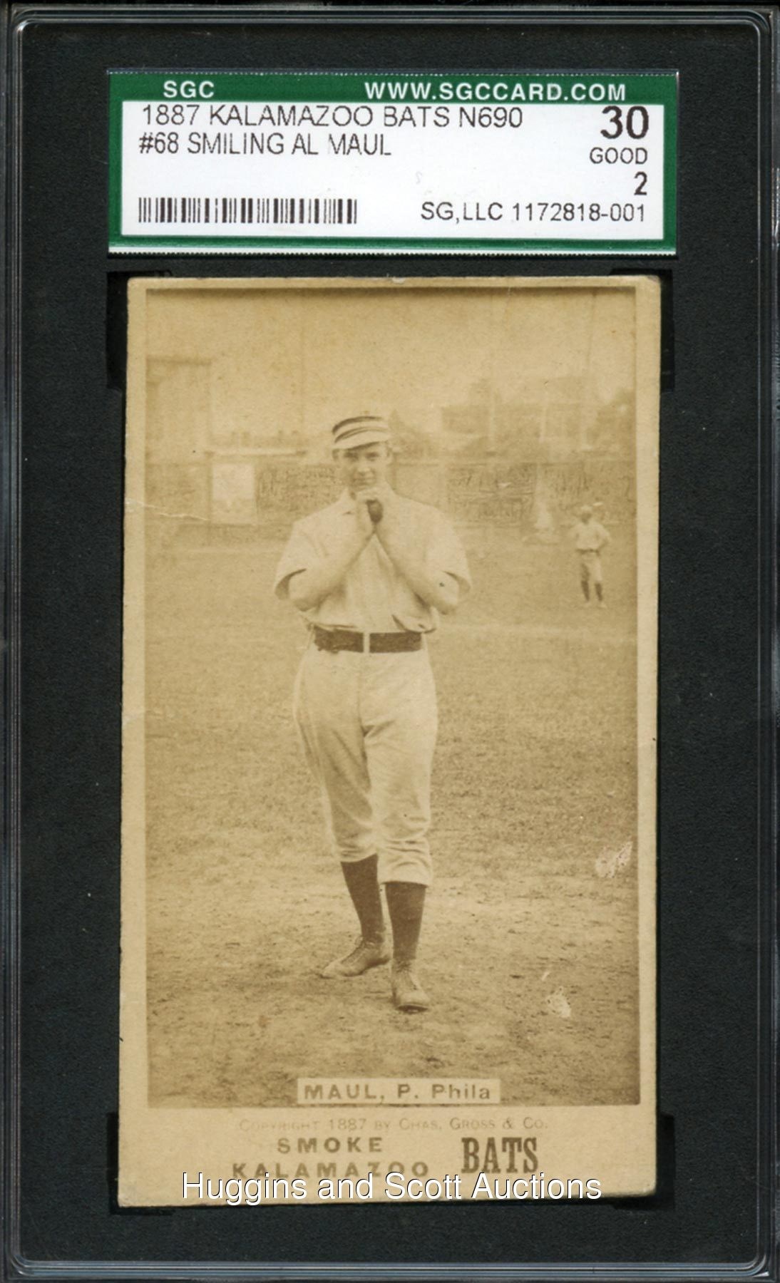 Graded 30 Good 2 by SGC. Only seven copies of the offered 1887 N690 Kalamazoo Bats (Smiling) Al Maul have been judged by the grading service. The pitcher for the Philadelphia Quakers is clearly pictured in a season in which he posted a 4-2 ledger. The Keystone native exhibits a strong sepia-toned image against a period ballpark setting. The reverse of the sturdy slab of antique cardboard exhibits moderate creasing which barely protrudes the surface and does not seriously impact the overall presentation. Presents at the peak of the assigned technical appraisal.