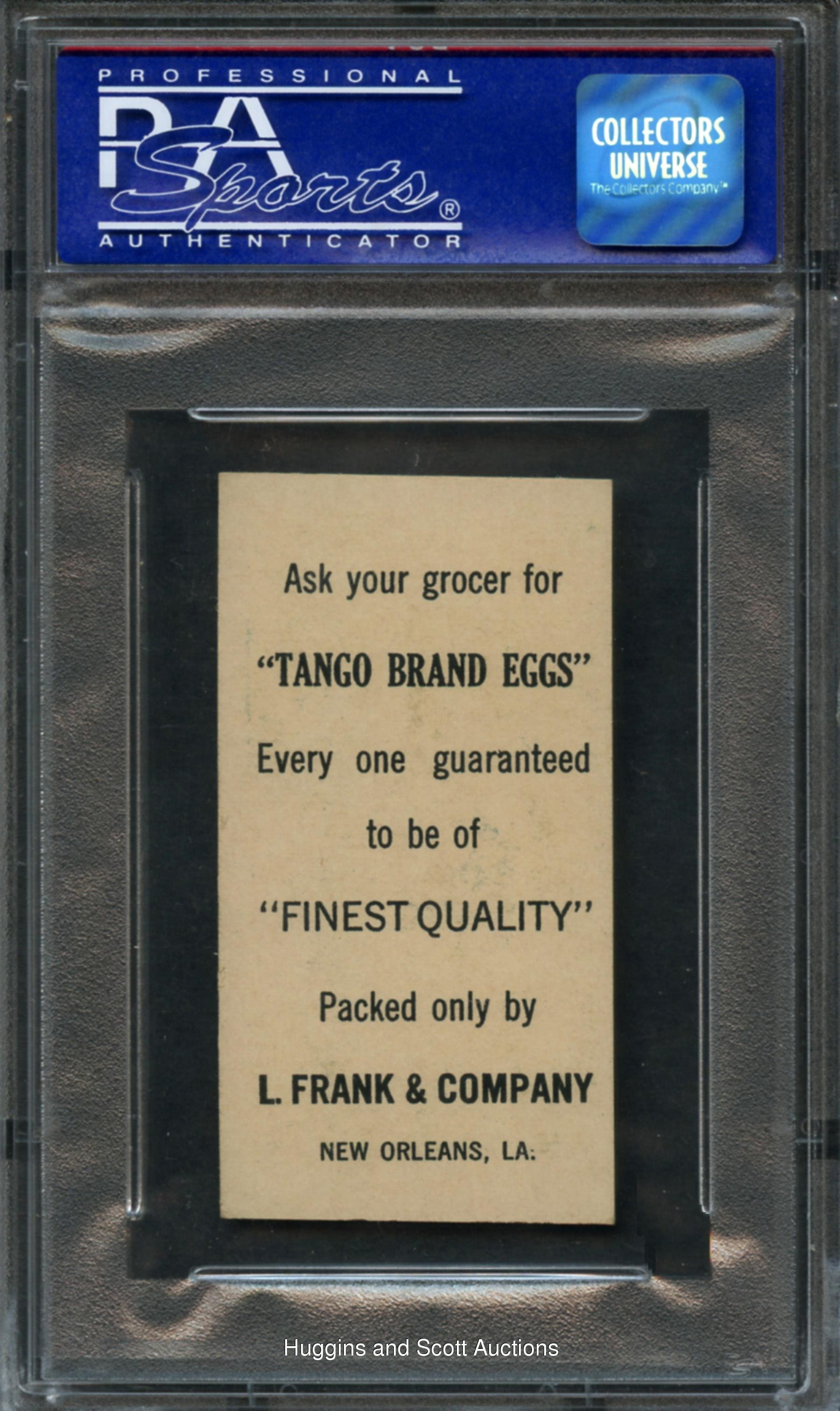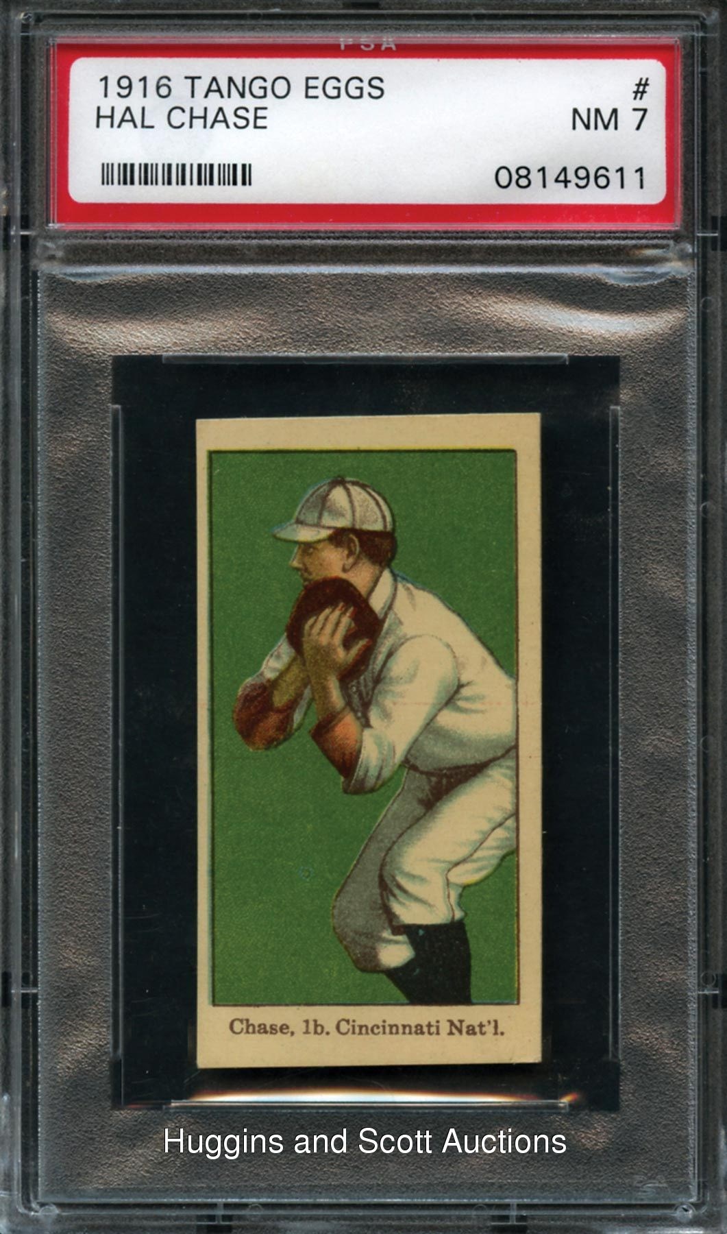 Graded NM 7 by PSA. The controversial and undeniably talented Hal Chase presides on the offered 1916 Tango Eggs example. This Louisiana Type was part of a large find of such advertising backs in the New Orleans area. The Cincinnati first baseman exhibits strong corners, vivid imagery, clean back and a peculiar factory cut associated with the issue. None better.