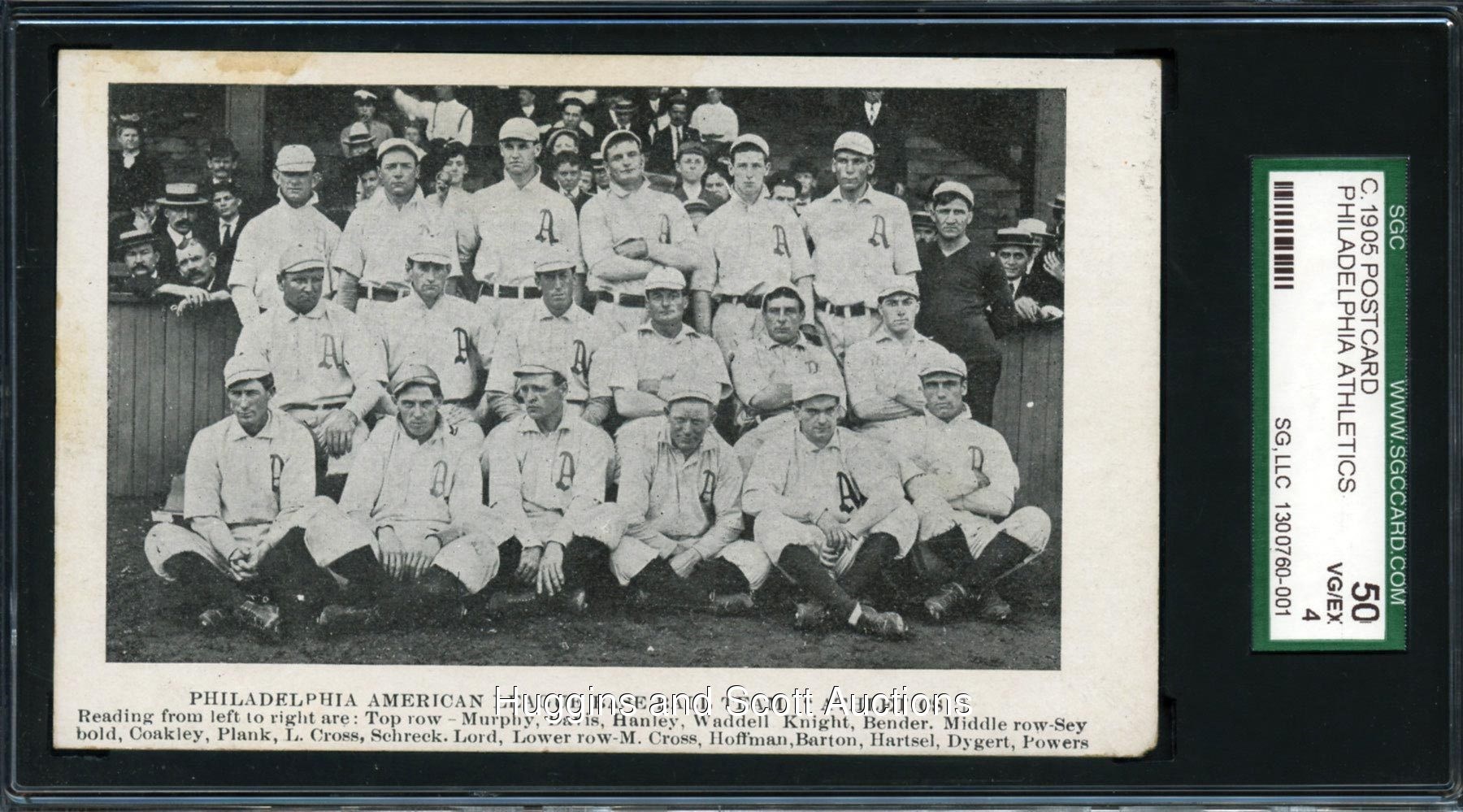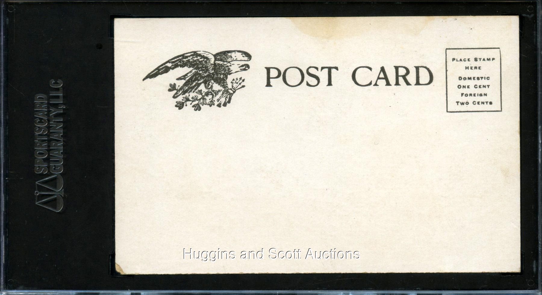 Graded 50 VG-EX 4 by SGC. The 1905 American League Champion Philadelphia Athletics are pictured in all of their splendor with the offered team postcard. The black-and-white correspondence is entirely crease-free and absent of any writing. Moderate corner wear along with age-induced foxing is commensurate with the technical appraisal. A trio of Hall of Famers including Bender, Plank and Waddell are portrayed. The lone specimen at the grading level with only two better.