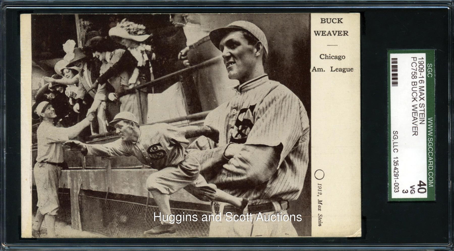 Graded 40 VG 3 by SGC. Black Sox historians will desire the offered 1909-16 PC758 Max Stein Postcards Buck Weaver. The horizontal depiction of the "Windy City" star portrays Weaver engaging in various facets of his game, including that of interfacing with female fans. A moderate crease traces across the upper middle edge while the correspondence section is absent of any writing. The highest graded example of this scarce postcard judged by either PSA or SGC.
