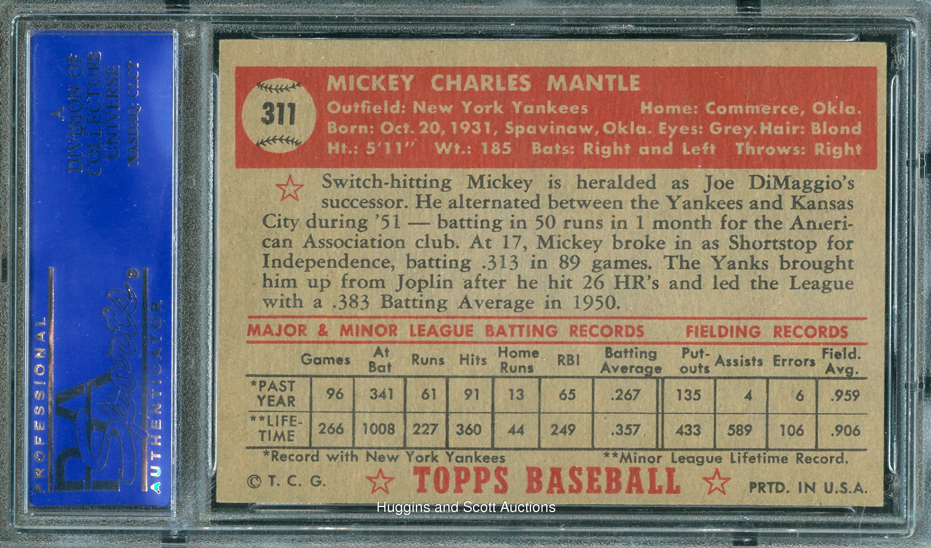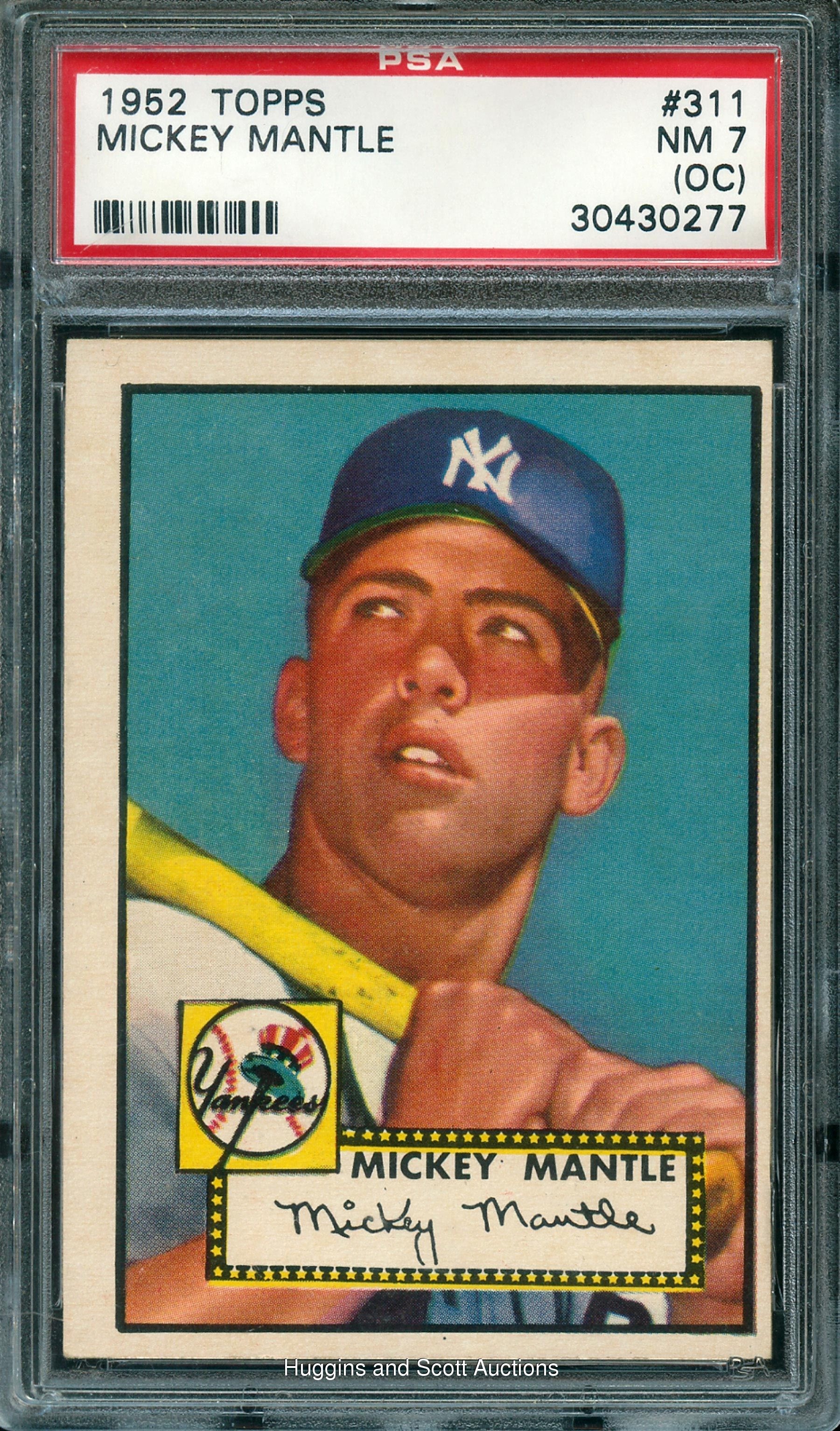 A standard of collecting excellence. Acknowledged as “the greatest prospect ever” by multiple sources including Joe DiMaggio and Branch Rickey, the switch-hitting Mickey Charles Mantle refused to wilt under the intense scrutiny of the “Big Apple.” Despite early growing pains and a return trip to the minors, within years Mantle would be a Triple Crown winner and one of the most feared sluggers in baseball history. With a determined gaze, the youthful Oklahoman is showcased on this matchless 1952 Topps #311 rookie card. Graded NM 7 with an (oc) qualifier by PSA, this breathtaking crease-free depiction is heralded by a crisp perimeter, precise surface registration and bold color detailing. Right justified centering does not adversely impact the captivating image. The reverse, on which Mantle is “heralded as Joe DiMaggio’s successor,” is clean with crisp red-and-white text. Undoubtedly, this bona fide Mantle rookie is rightly esteemed by legions of collectors as the "holy grail" of the post-war hobby.