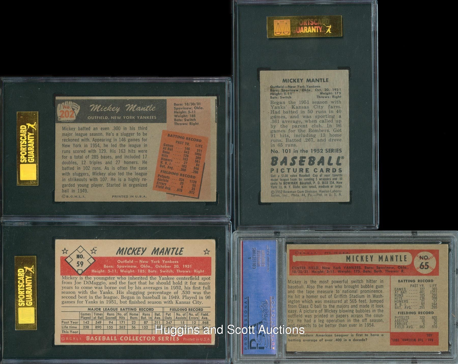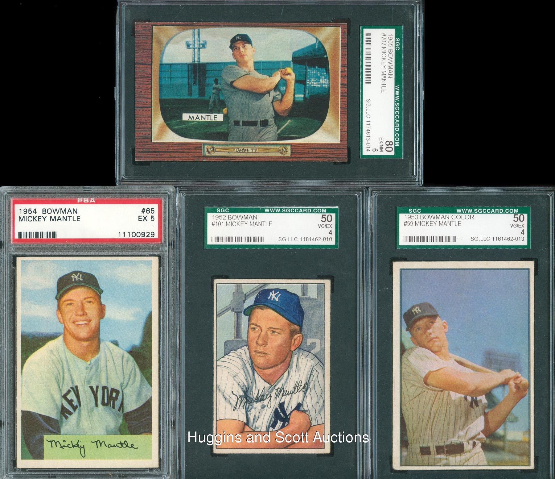 Round the bases with Mickey Mantle on this run of (4) 1952-1955 Bowman Baseball graded cards. Included are 1.) 1952 Bowman #101 (SGC 50); 2.) 1953 Bowman Color #59 (SGC 50); 3.) 1954 Bowman #65 (PSA 5) and 4.) 1955 Bowman #202 (SGC 80).
