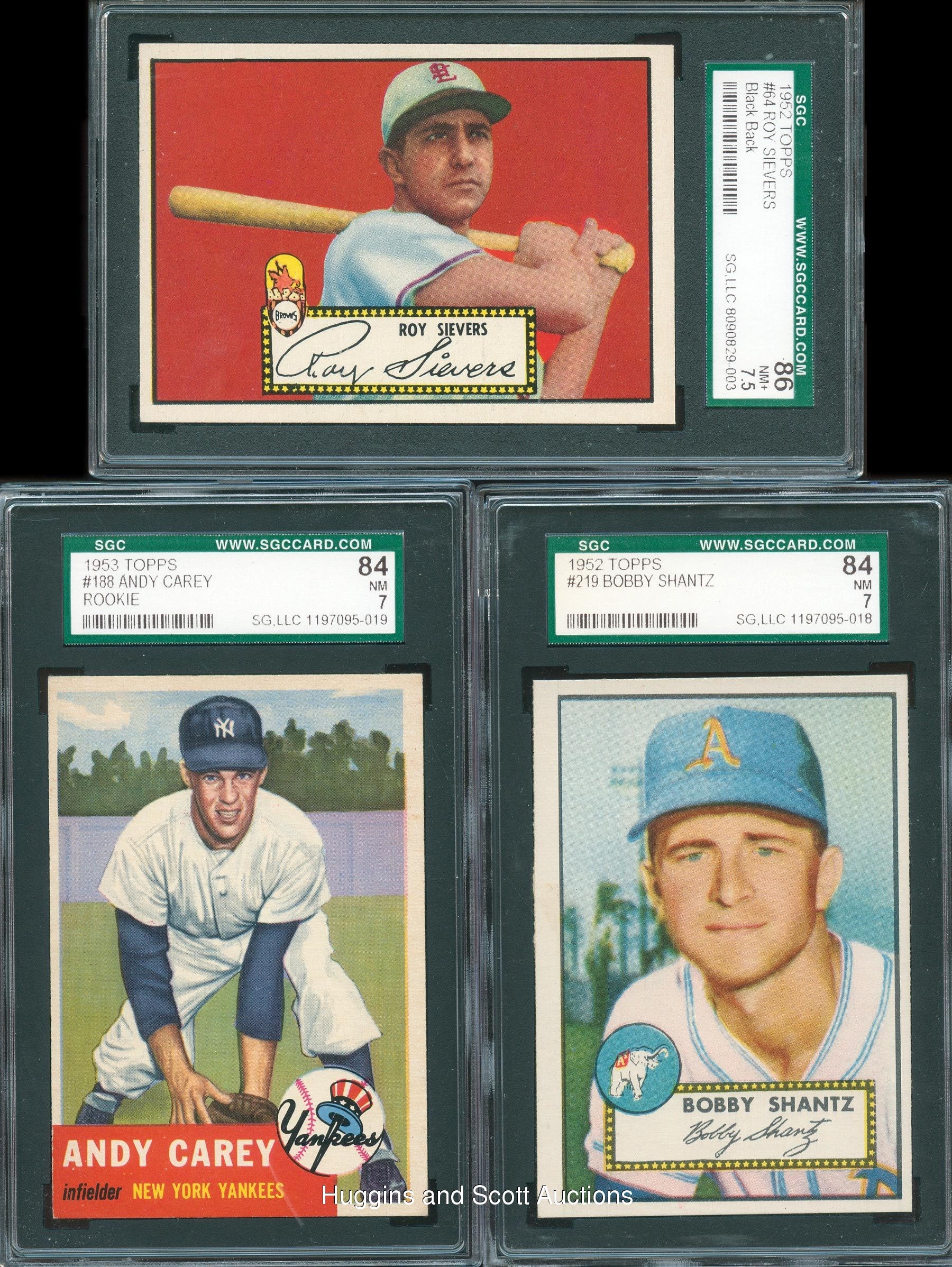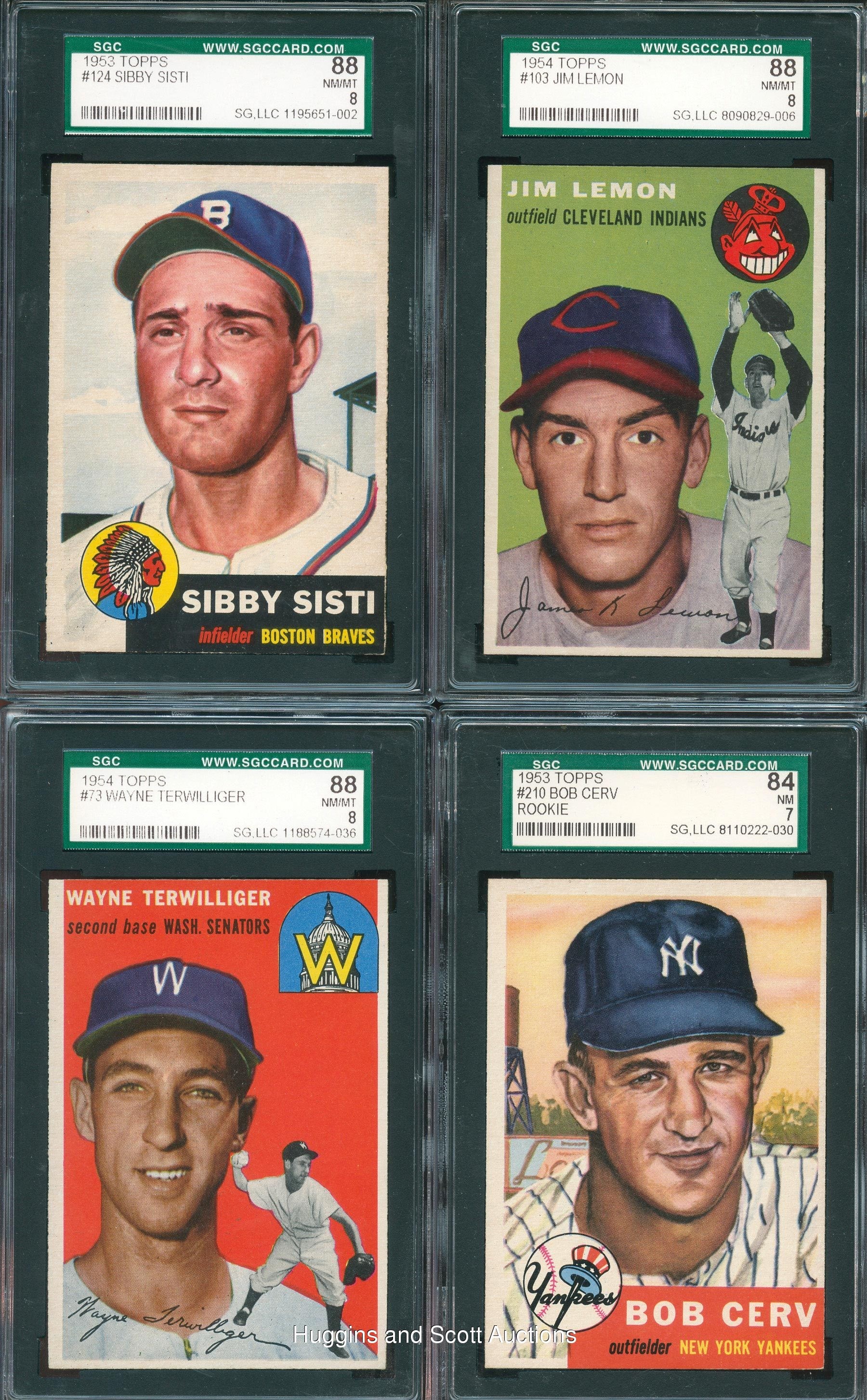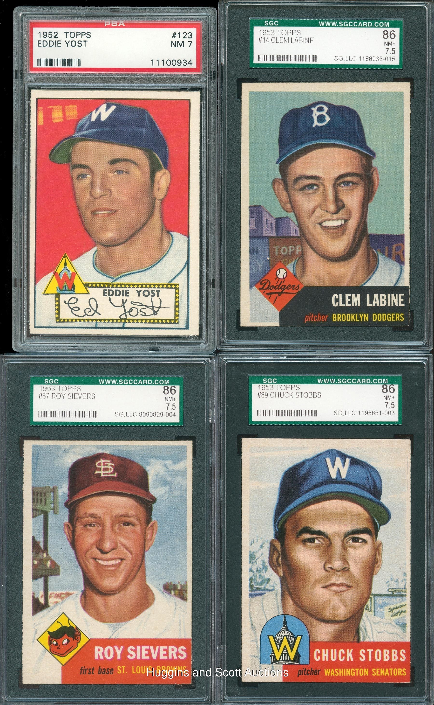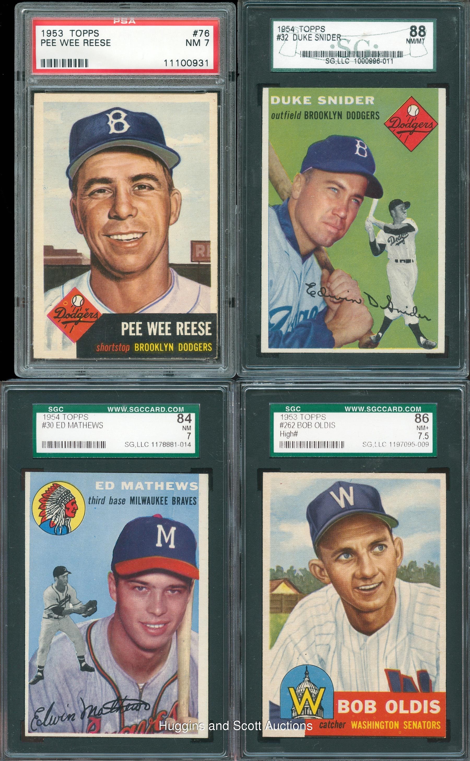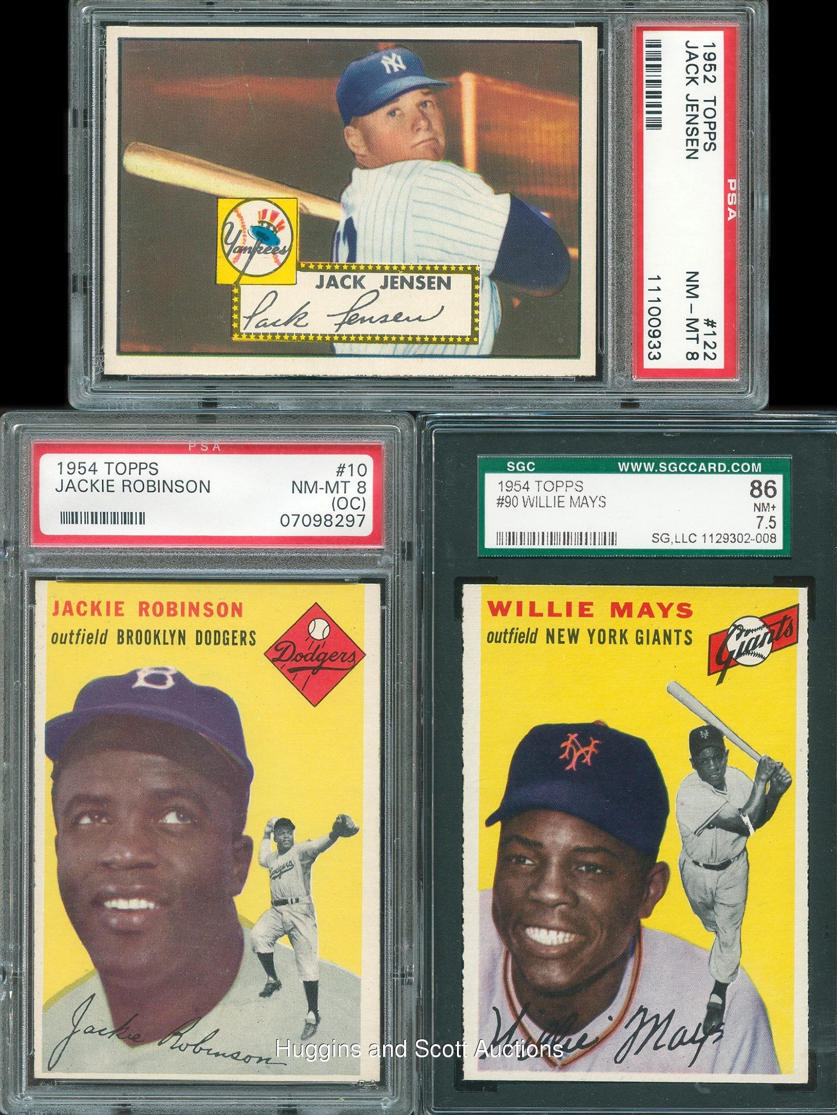 Those with discriminating collecting tastes will be delighted by these (18) 1952-1954 Topps Baseball graded singles, all of which have technical grades of (NM to NM-MT). Included are investment quality examples of 1952 Topps: (4 cards) with #64 (SGC 86, bb), #123 Jensen (PSA 8), 123 (PSA 7), 219 (SGC 84); 1953 Topps: (8 cards) with #14 (SGC 86), 67 (SGC 86), #76 Reese (PSA 7), 89 (SGC 86), 124 (SGC 88), 188 (SGC 84), 210 (SGC 84), 262 (SGC 86); 1954 Topps: (6 cards) with #10 J. Robinson (PSA 8, oc), #30 Mathews (SGC 84), #32 Snider (SGC 88), 73 (SGC 88), #90 Mays (SGC 86) and 103 (SGC 88).