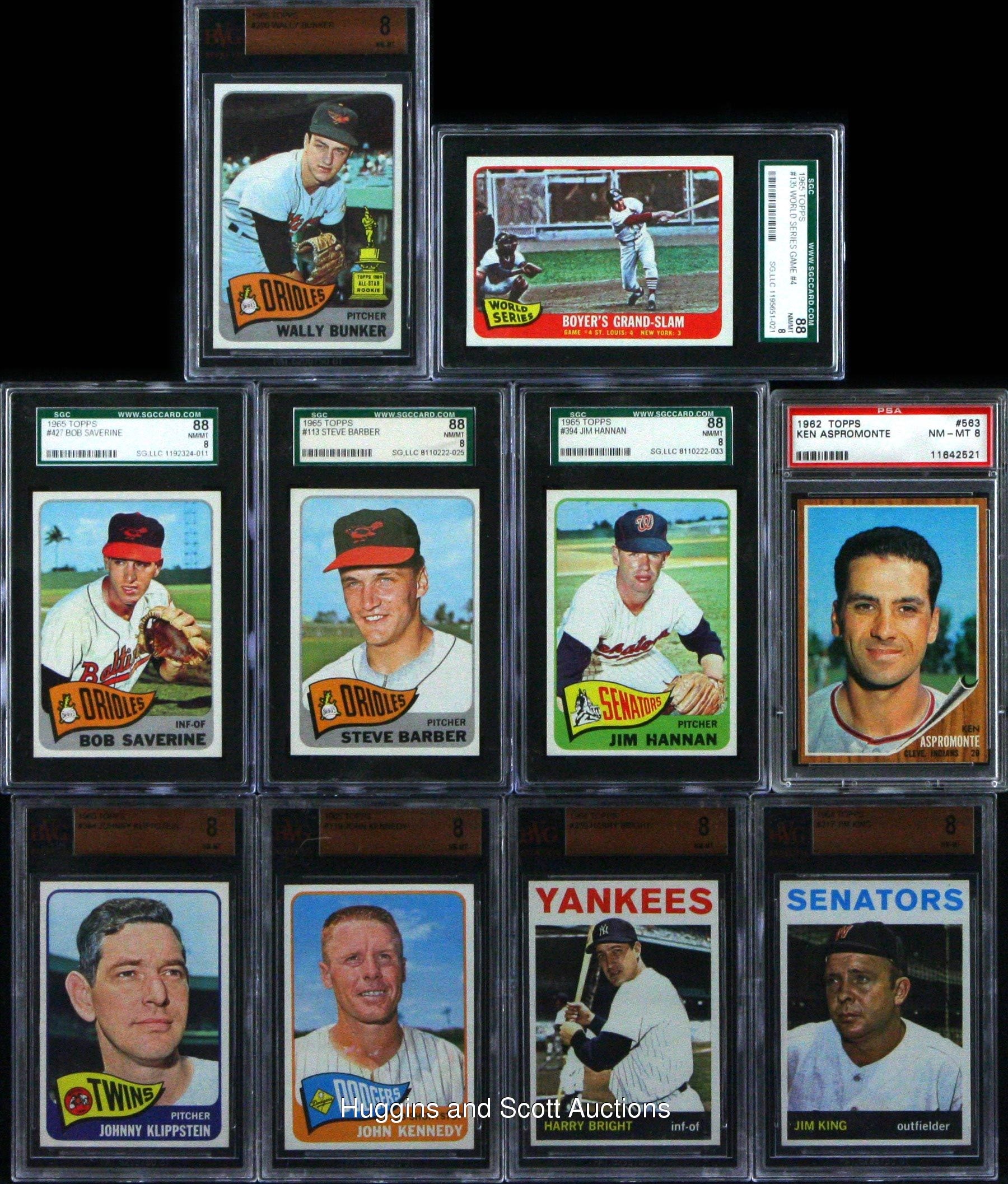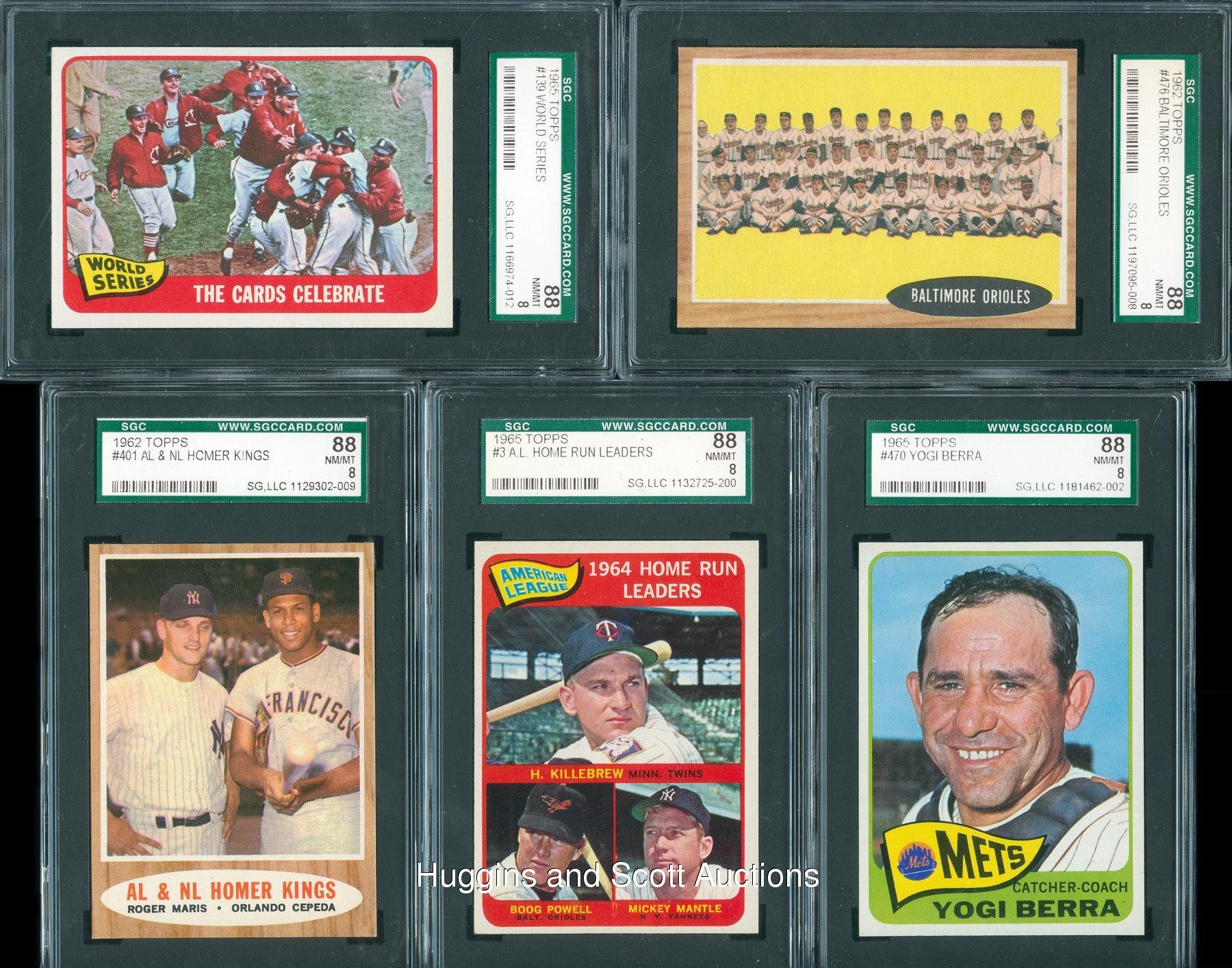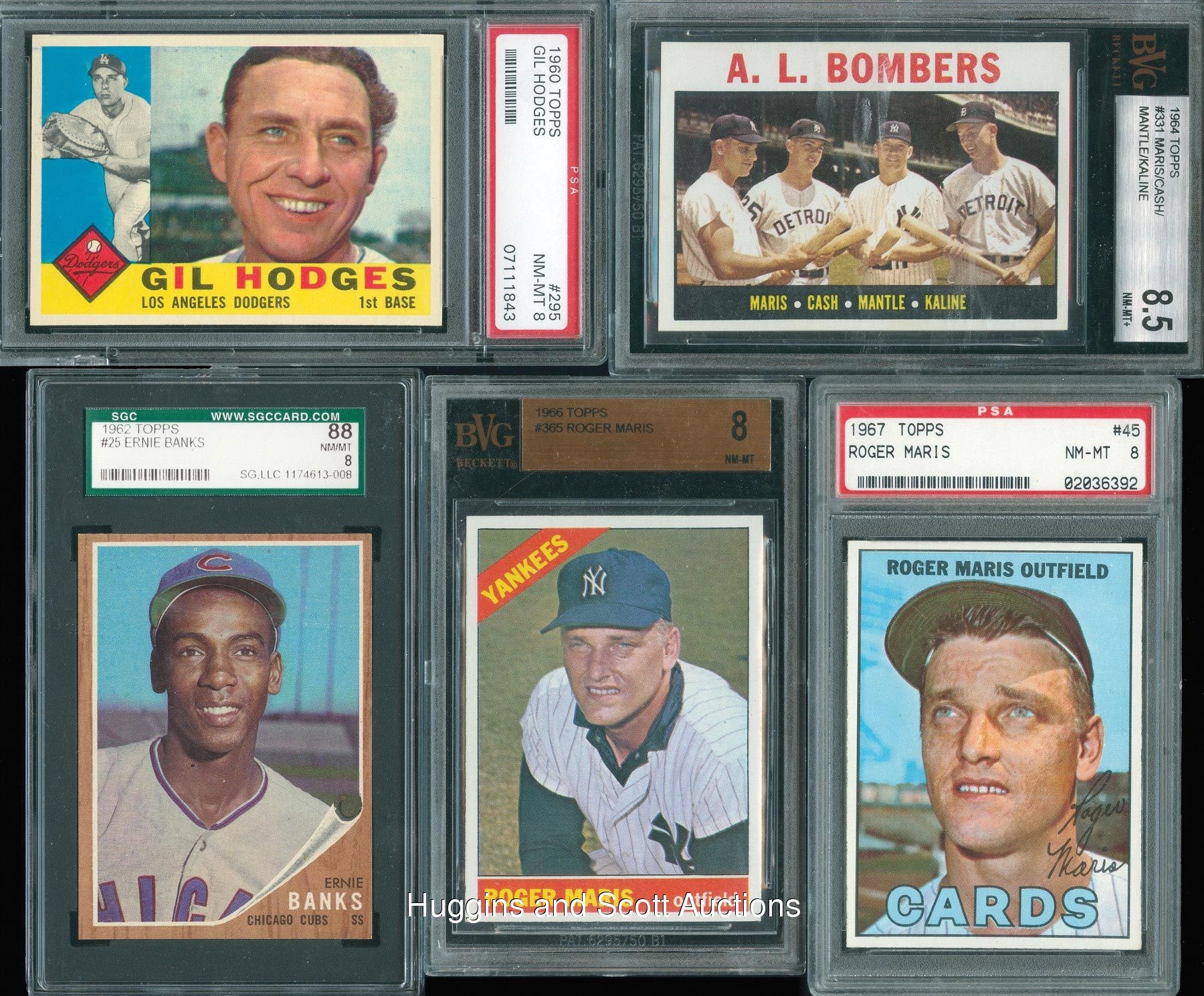 Investment caliber selection of (31) 1960-1967 Topps Baseball graded cards featuring razor-sharp corners, snow white edges and pinpoint centering. Included are 1960 Topps: (2 cards) with #221 (SGC 88), #295 Hodges (PSA 8); 1961 Topps: #568 Skowron AS; 1962 Topps: (6 cards) with BVG 8.5: #180; PSA 8: #65, 563; SGC 88: #25 Banks, #401 Maris/Cepeda, 476; 1963 Topps: (2 cards) with #123 (SGC 88), #398 Powell (PSA 8); 1964 Topps: (5 cards) with BVG 8.5: #217, #331 A.L. Bombers; BVG 8: #217, 259; SGC 88: #262; 1965 Topps: (13 cards) with BVG 8.5: #172, #485 Fox, 523; BVG 8: #119, 290, 384; PSA 8: #120 F. Robinson; SGC 88: #3 Mantle/Killer/Powell HR LL, 113, 135, 139, 394, 427, #470 Berra; 1966 Topps: #365 Maris (BVG 8) and 1967 Topps: #45 Maris (PSA 8).