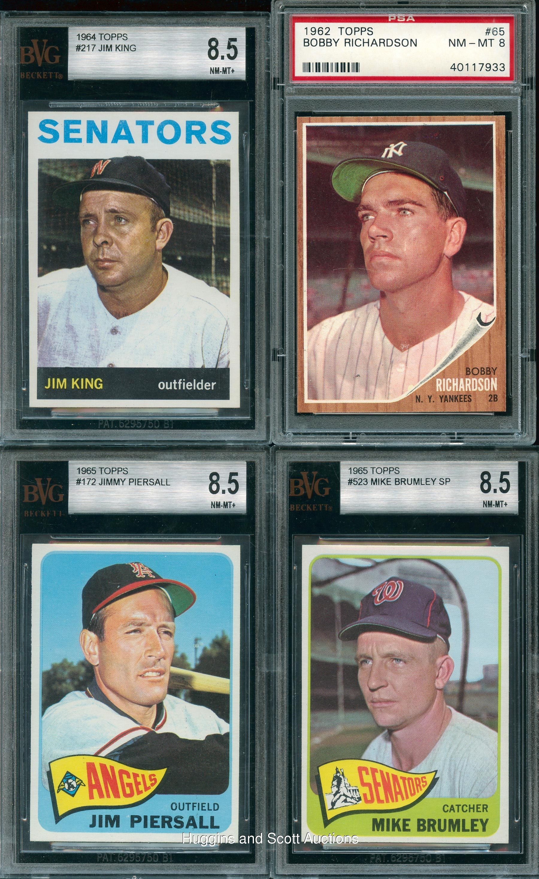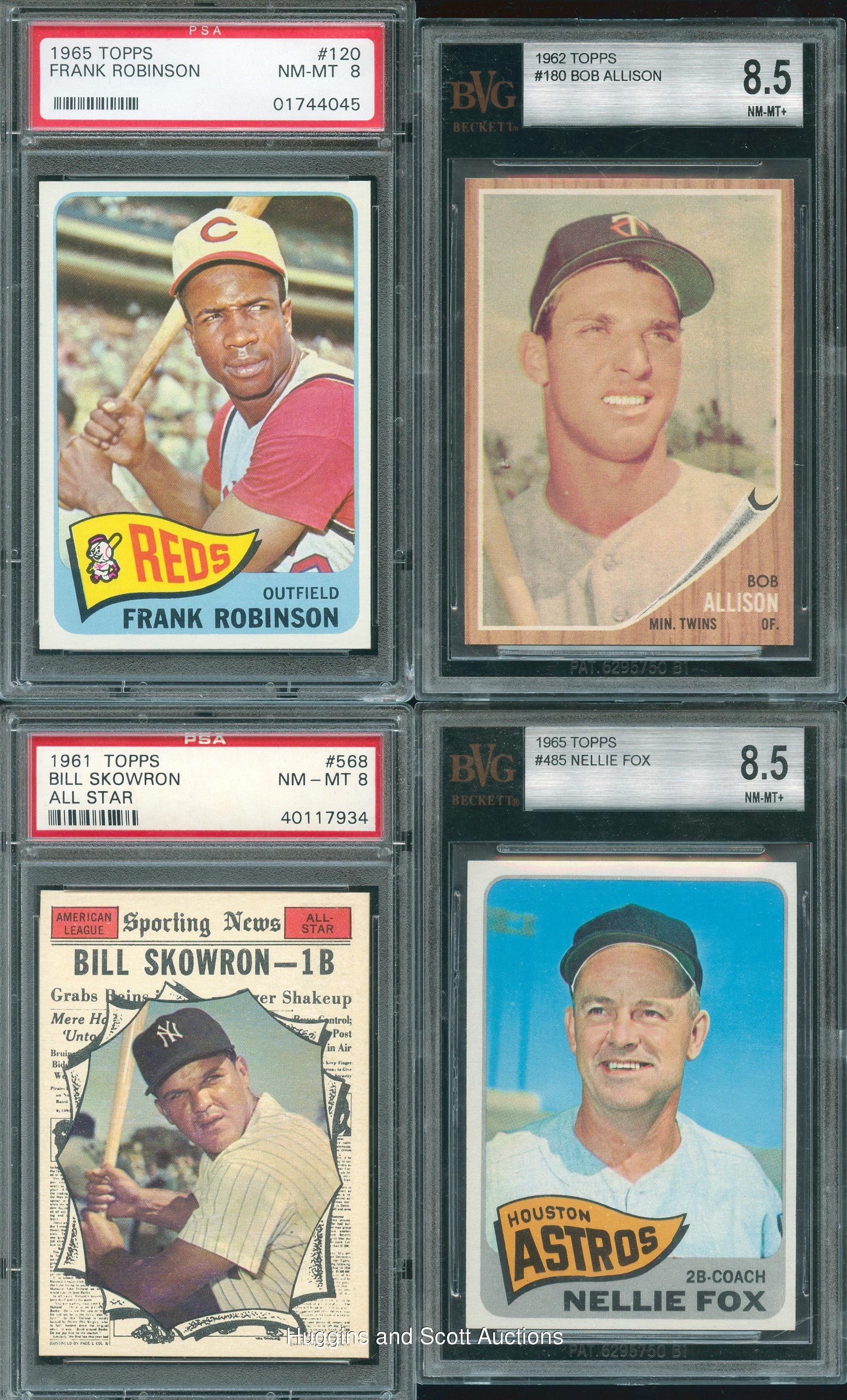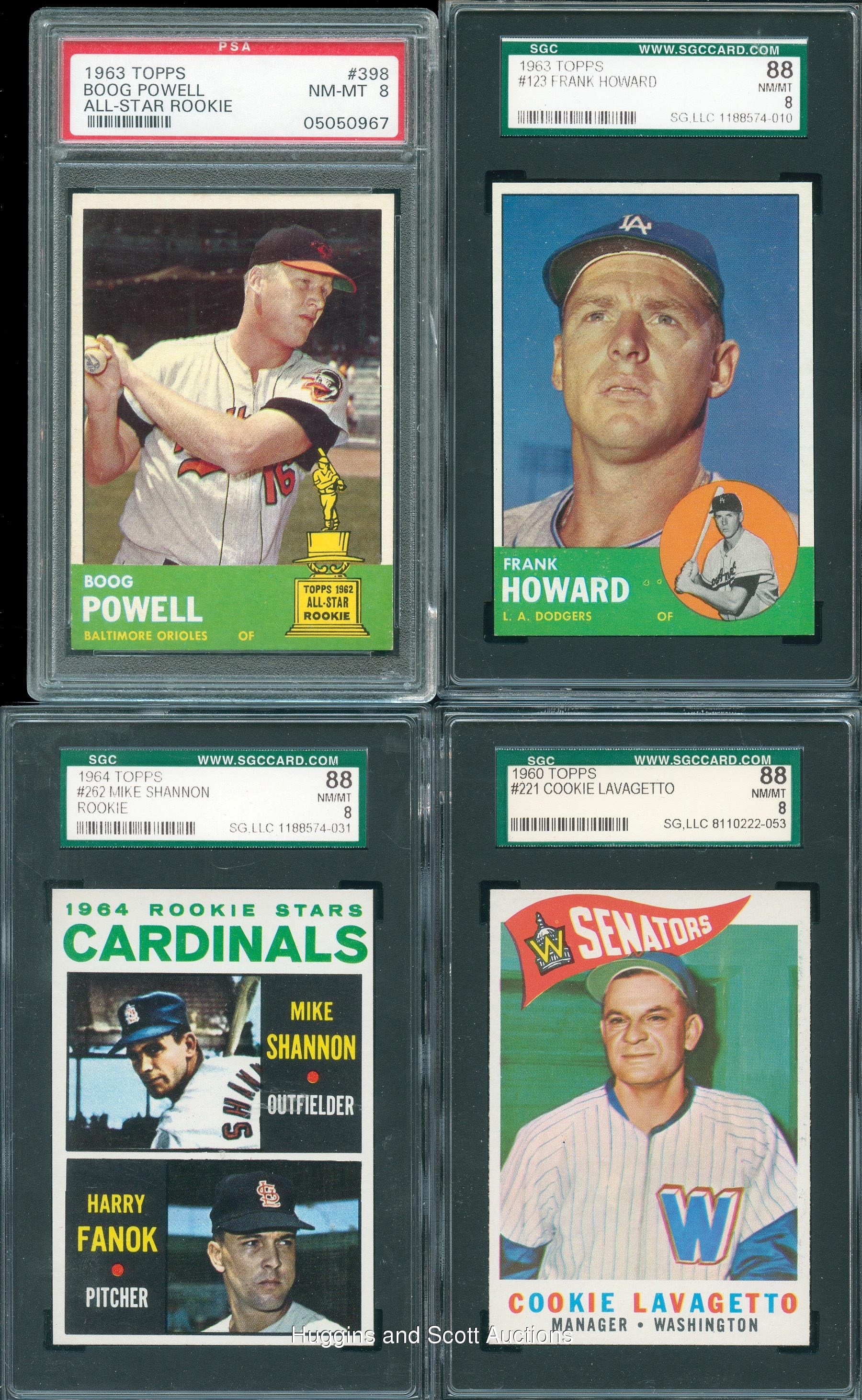 Investment caliber selection of (31) 1960-1967 Topps Baseball graded cards featuring razor-sharp corners, snow white edges and pinpoint centering. Included are 1960 Topps: (2 cards) with #221 (SGC 88), #295 Hodges (PSA 8); 1961 Topps: #568 Skowron AS; 1962 Topps: (6 cards) with BVG 8.5: #180; PSA 8: #65, 563; SGC 88: #25 Banks, #401 Maris/Cepeda, 476; 1963 Topps: (2 cards) with #123 (SGC 88), #398 Powell (PSA 8); 1964 Topps: (5 cards) with BVG 8.5: #217, #331 A.L. Bombers; BVG 8: #217, 259; SGC 88: #262; 1965 Topps: (13 cards) with BVG 8.5: #172, #485 Fox, 523; BVG 8: #119, 290, 384; PSA 8: #120 F. Robinson; SGC 88: #3 Mantle/Killer/Powell HR LL, 113, 135, 139, 394, 427, #470 Berra; 1966 Topps: #365 Maris (BVG 8) and 1967 Topps: #45 Maris (PSA 8).