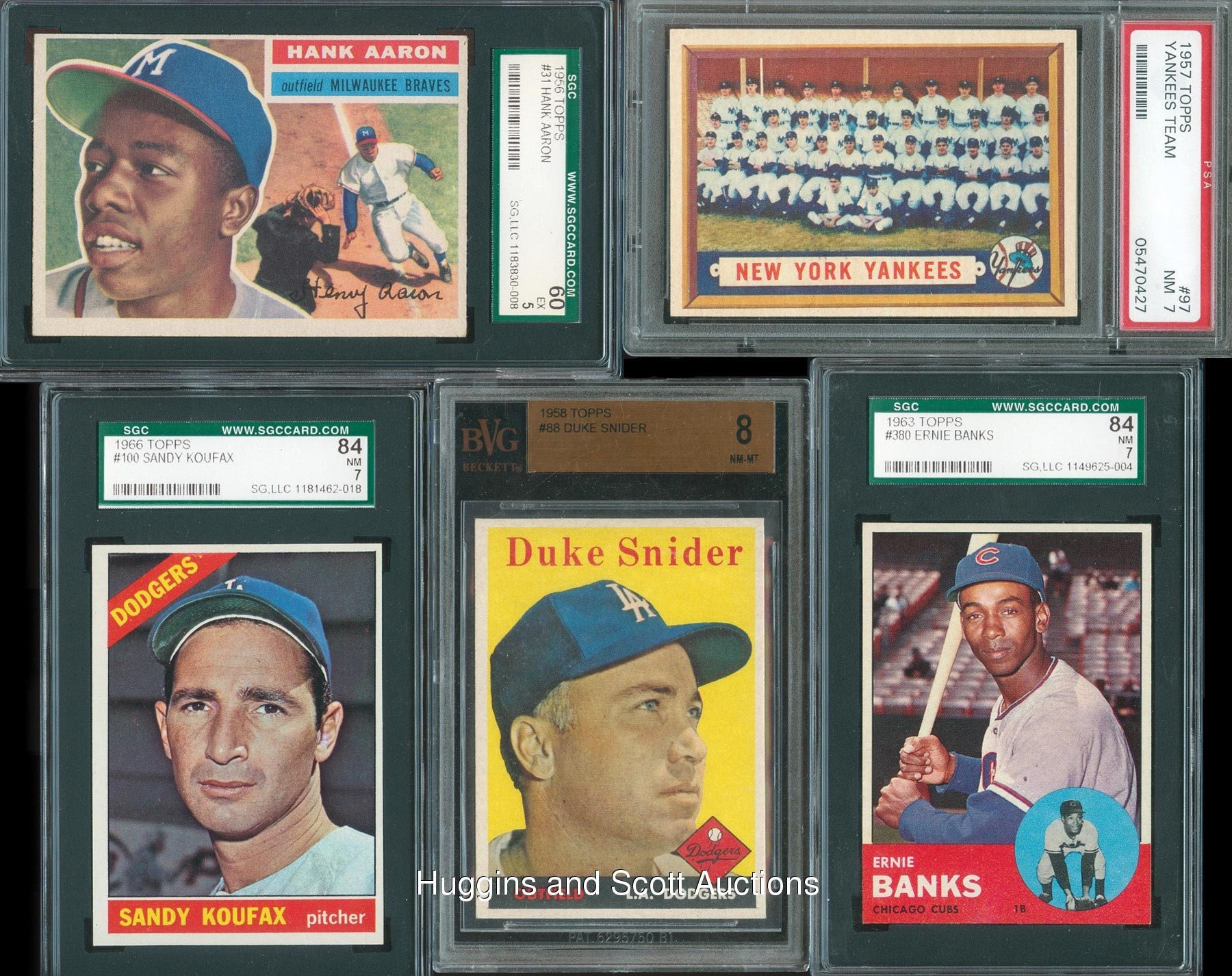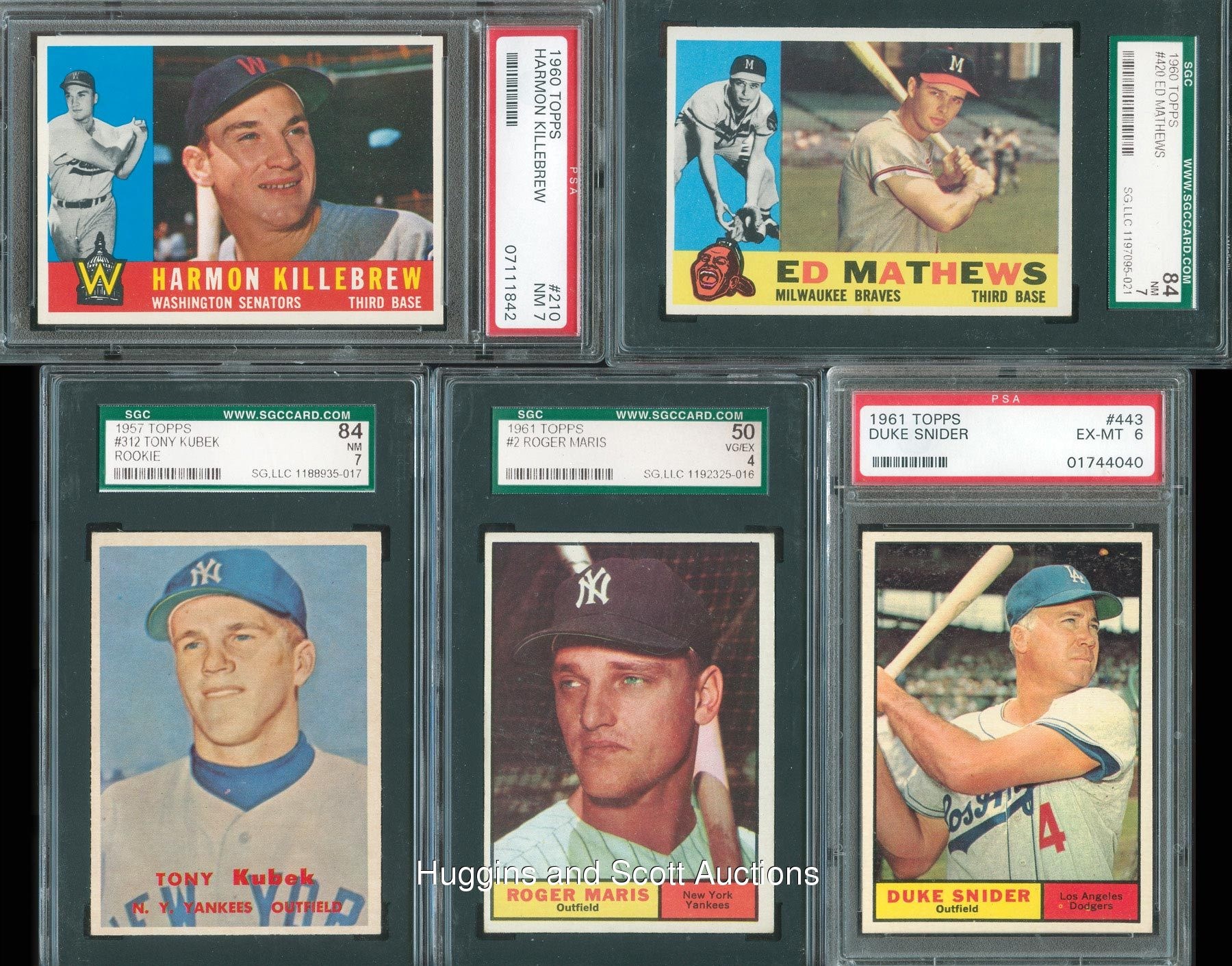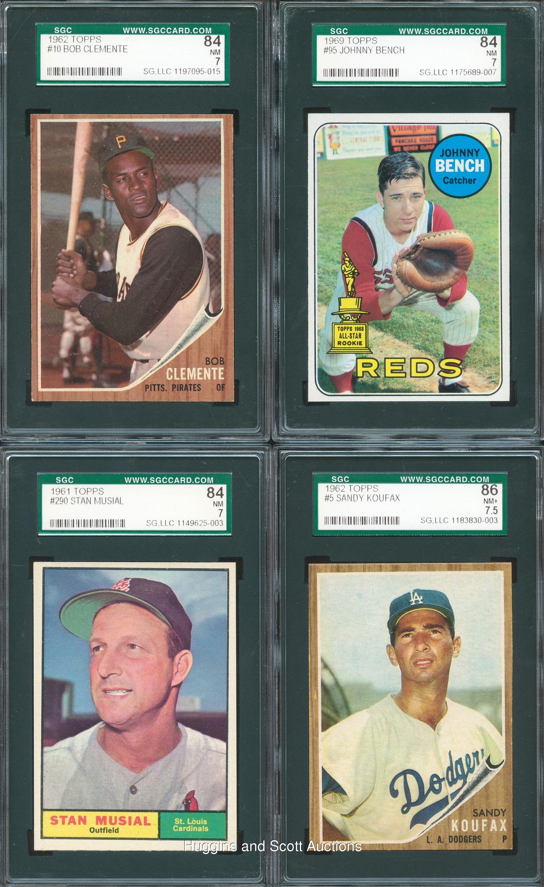 Vintage Graded Dealers! Take note of this loaded 1956-1975 Topps Baseball graded collection of (75) cards featuring a slew of sharp Hall of Famers and stars such as Clemente, Koufax, Musial and many more. Highlights include 1956 Topps: #21 Aaron (SGC 60); 1957 Topps: #210 Campanella (GAI 7.5), #212 Colavito RC (SGC 84), #250 Mathews (SGC 80), #312 Kubek RC (SGC 84); 1958 Topps: #88 Snider (BVG 8); 1960 Topps: #210 Killebrew (PSA 7), #420 Mathews (SGC 84); 1961 Topps: #290 Musial (SGC 84), #443 Snider (PSA 6); 1962 Topps: #5 Koufax (SGC 86), #10 Clemente (SGC 84), #30 Mathews (SGC 84); 1963 Topps: #380 Banks (SGC 84); 1965 Topps: #500 Mathews (BVG 7.5); 1966 Topps: #100 Koufax (SGC 84) and 1969 Topps: #95 Bench (SGC 84). More on our website. 1956 Topps: (3 cards) with #21 Aaron (SGC 60), #72 Phillies Team (SGC 80, centered), #116 Jensen (BVG 7.5); 1957 Topps: (12 cards) with GAI 8: #396; SGC 88: #262; GAI 7.5: #210 Campanella; BVG 7: #334; GAI 7: #286 Richardson RC; PSA 7: #97 Yankees Team, #230 Kell; SGC 84: #27, #212 Colavito RC, 255, #312 Kubek RC; SGC 80: #250 Mathews; 1958 Topps: #88 Snider (BVG 8); 1959 Topps: (2 cards, both SGC 86) with #397, 429; 1960 Topps: (5 cards) with (2) #25 (both SGC 84), #210 Killebrew (PSA 7), 348 (SGC 86), #420 Mathews (SGC 84); 1961 Topps: (5 cards) with #2 Maris (SGC 50), 82 (SGC 88), #290 Musial (SGC 84), #409 W. Johnson Thrills (SGC 80), #443 Snider (PSA 6); 1962 Topps: (12 cards) with BVG 7.5: #175; SGC 86: #5 Koufax; BVG 7: #175, #461 Hubbs RC; PSA 7: #110; SGC 84: #10 Clemente, #30 Mathews, #60 NL Strikeout Leaders, 351, #353 Mazeroski, #461 Hubbs RC; BVG 6.5: #163; 1963 Topps: (4 cards) with #15 (SGC 84), 123 (SGC 84), 347 (SGC 86), #380 Banks (SGC 84); 1964 Topps: (4 cards) with #11 NL RBI Leaders (SGC 70), #146 John RC (SGC 84), 371 (SGC 80), 415 (BVG 7.5); 1965 Topps: (8 cards) with BVG 7.5: #95 Mazeroski, #500 Mathews; SGC 86: #95 Mazeroski, 234, 394; PSA 7: #137; SGC 84: #99; SGC 70: #513 Yankees Team; 1966 Topps: (3 cards) with #100 Koufax (SGC 84), 448 (BVG 7.5), 501 (SGC 88); 1967 Topps: (2 cards) with #236 NL Pitching Leaders (SGC 88), #510 Mazeroski (PSA 7); 1968 Topps: (6 cards) with #99 (SGC 92), 234 (PSA 8), 248 (SGC 96), 320 (BVG 8.5), 335 (SGC 84), #390 Mazeroski (BVG 7.5); 1969 Topps: #95 Bench (SGC 84); 1971 Topps: (3 cards) with #183 Hodges (SGC 86)m (2) #620 F. Howard (SGC 86, SGC 84); 1975 Topp Mini: (2 cards) with #20 Munson (BVG 8.5), #201 Howard/Koufax (SGC 92)