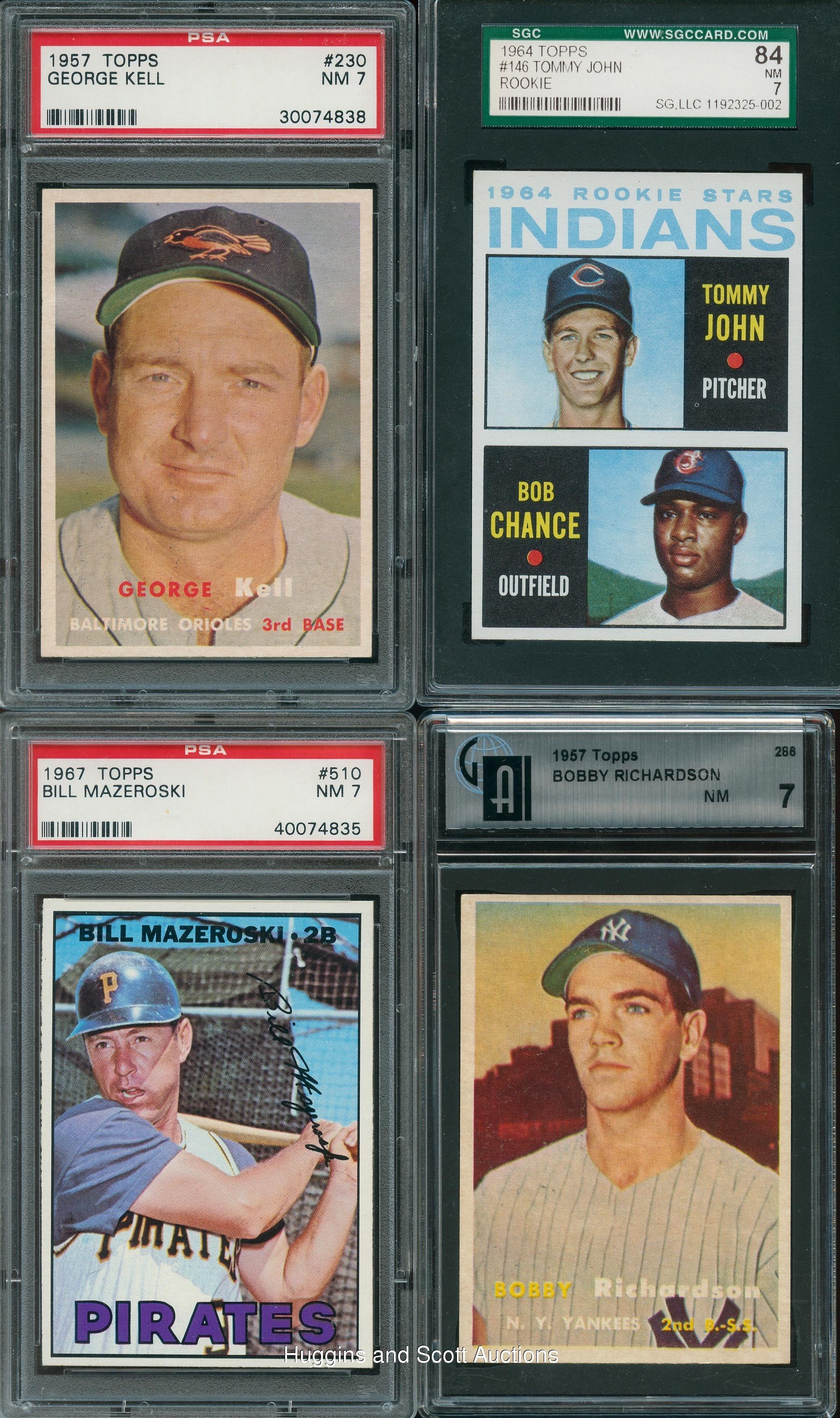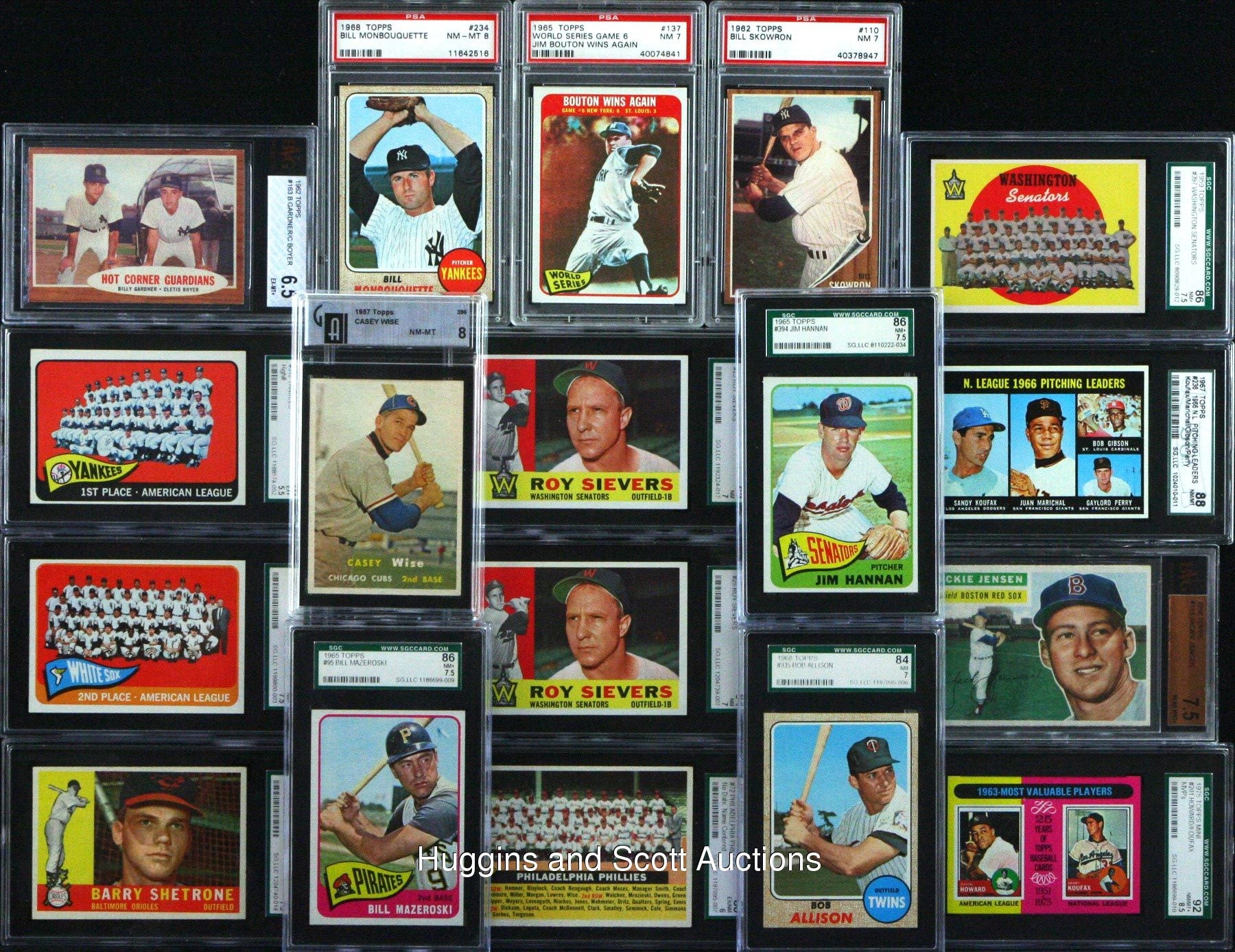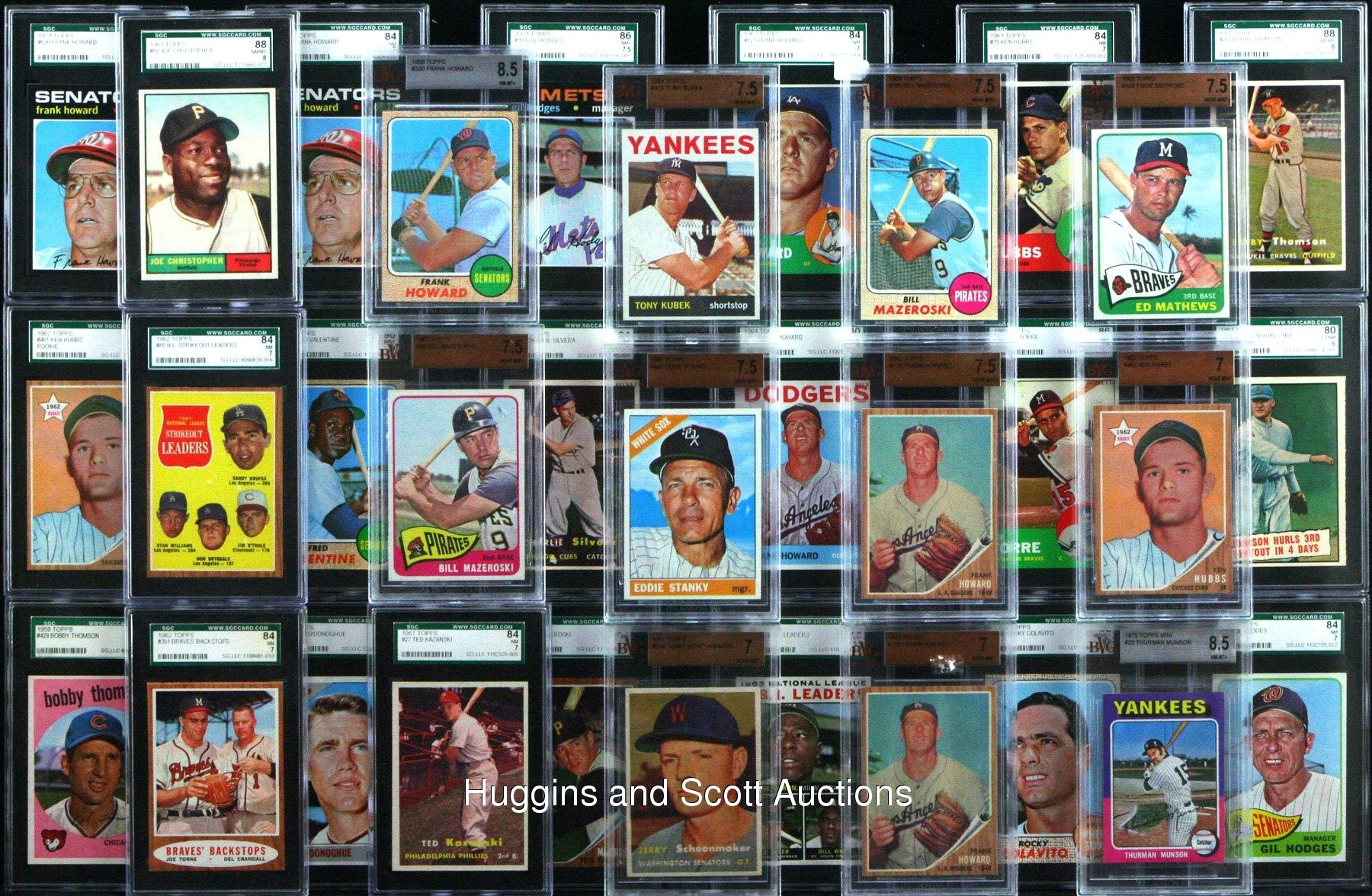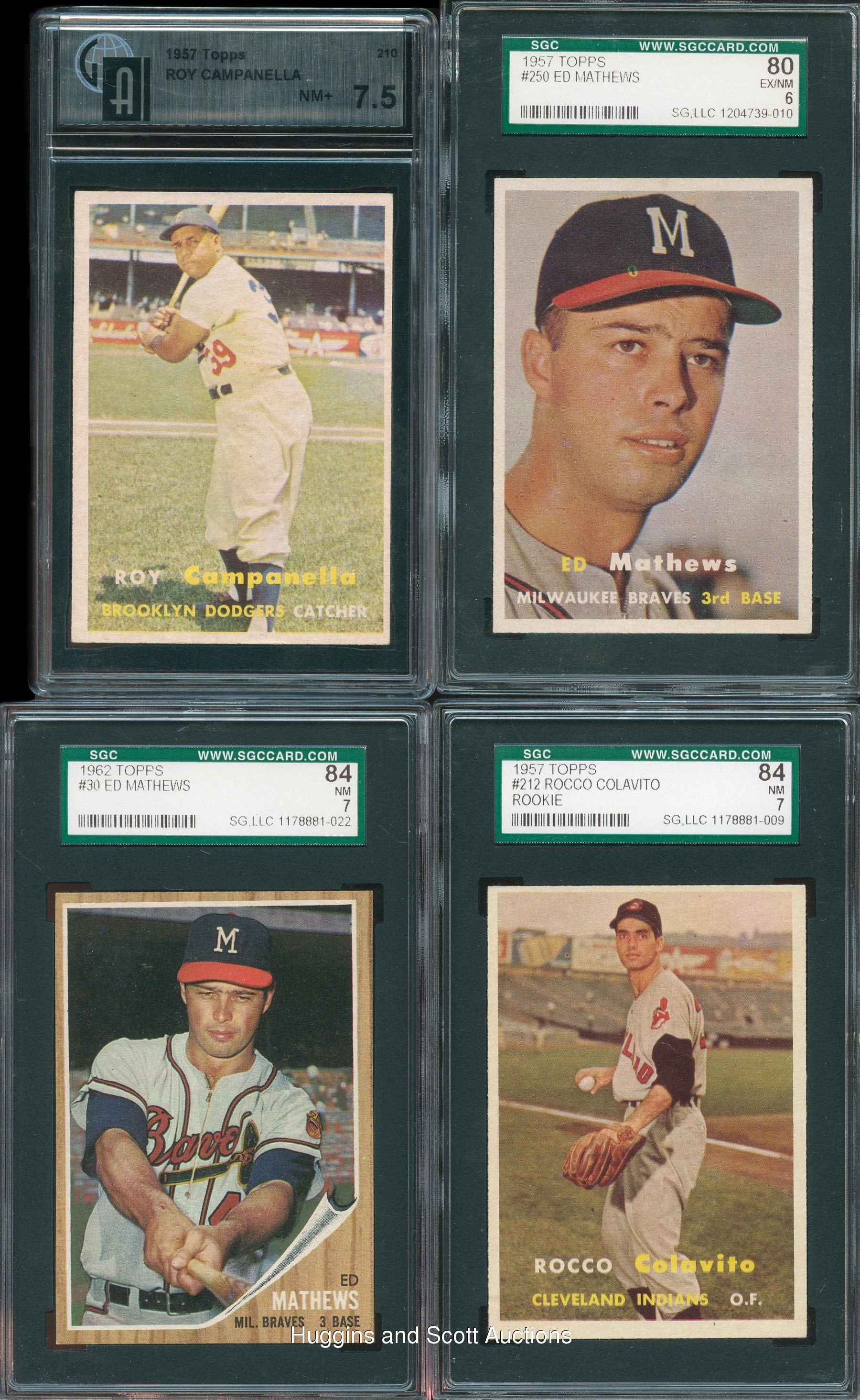 Vintage Graded Dealers! Take note of this loaded 1956-1975 Topps Baseball graded collection of (75) cards featuring a slew of sharp Hall of Famers and stars such as Clemente, Koufax, Musial and many more. Highlights include 1956 Topps: #21 Aaron (SGC 60); 1957 Topps: #210 Campanella (GAI 7.5), #212 Colavito RC (SGC 84), #250 Mathews (SGC 80), #312 Kubek RC (SGC 84); 1958 Topps: #88 Snider (BVG 8); 1960 Topps: #210 Killebrew (PSA 7), #420 Mathews (SGC 84); 1961 Topps: #290 Musial (SGC 84), #443 Snider (PSA 6); 1962 Topps: #5 Koufax (SGC 86), #10 Clemente (SGC 84), #30 Mathews (SGC 84); 1963 Topps: #380 Banks (SGC 84); 1965 Topps: #500 Mathews (BVG 7.5); 1966 Topps: #100 Koufax (SGC 84) and 1969 Topps: #95 Bench (SGC 84). More on our website. 1956 Topps: (3 cards) with #21 Aaron (SGC 60), #72 Phillies Team (SGC 80, centered), #116 Jensen (BVG 7.5); 1957 Topps: (12 cards) with GAI 8: #396; SGC 88: #262; GAI 7.5: #210 Campanella; BVG 7: #334; GAI 7: #286 Richardson RC; PSA 7: #97 Yankees Team, #230 Kell; SGC 84: #27, #212 Colavito RC, 255, #312 Kubek RC; SGC 80: #250 Mathews; 1958 Topps: #88 Snider (BVG 8); 1959 Topps: (2 cards, both SGC 86) with #397, 429; 1960 Topps: (5 cards) with (2) #25 (both SGC 84), #210 Killebrew (PSA 7), 348 (SGC 86), #420 Mathews (SGC 84); 1961 Topps: (5 cards) with #2 Maris (SGC 50), 82 (SGC 88), #290 Musial (SGC 84), #409 W. Johnson Thrills (SGC 80), #443 Snider (PSA 6); 1962 Topps: (12 cards) with BVG 7.5: #175; SGC 86: #5 Koufax; BVG 7: #175, #461 Hubbs RC; PSA 7: #110; SGC 84: #10 Clemente, #30 Mathews, #60 NL Strikeout Leaders, 351, #353 Mazeroski, #461 Hubbs RC; BVG 6.5: #163; 1963 Topps: (4 cards) with #15 (SGC 84), 123 (SGC 84), 347 (SGC 86), #380 Banks (SGC 84); 1964 Topps: (4 cards) with #11 NL RBI Leaders (SGC 70), #146 John RC (SGC 84), 371 (SGC 80), 415 (BVG 7.5); 1965 Topps: (8 cards) with BVG 7.5: #95 Mazeroski, #500 Mathews; SGC 86: #95 Mazeroski, 234, 394; PSA 7: #137; SGC 84: #99; SGC 70: #513 Yankees Team; 1966 Topps: (3 cards) with #100 Koufax (SGC 84), 448 (BVG 7.5), 501 (SGC 88); 1967 Topps: (2 cards) with #236 NL Pitching Leaders (SGC 88), #510 Mazeroski (PSA 7); 1968 Topps: (6 cards) with #99 (SGC 92), 234 (PSA 8), 248 (SGC 96), 320 (BVG 8.5), 335 (SGC 84), #390 Mazeroski (BVG 7.5); 1969 Topps: #95 Bench (SGC 84); 1971 Topps: (3 cards) with #183 Hodges (SGC 86)m (2) #620 F. Howard (SGC 86, SGC 84); 1975 Topp Mini: (2 cards) with #20 Munson (BVG 8.5), #201 Howard/Koufax (SGC 92)