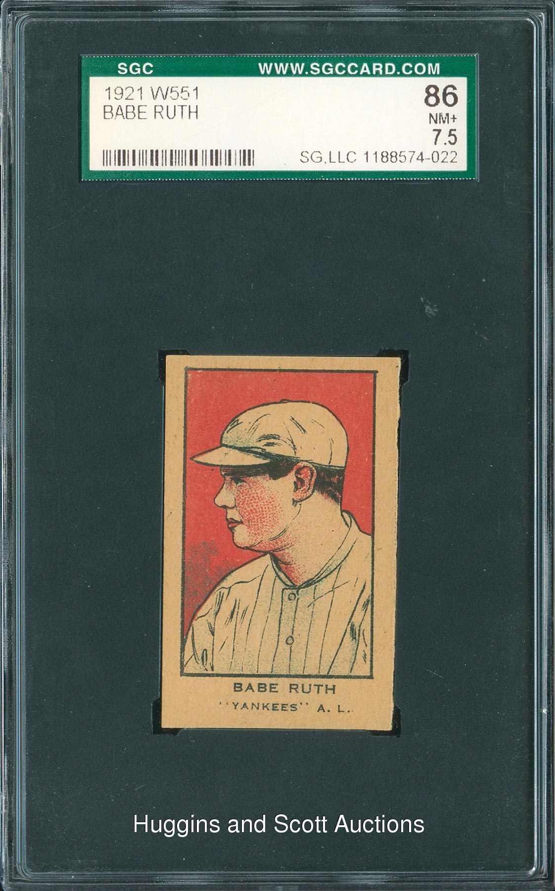 Graded 86 NM+ 7.5 by SGC. Not only is the offered 1921 W551 strip card of Babe Ruth among the first depictions of "The Bambino" as a Yankee but it also is one of his highest graded renderings of the slugger for the designation. Meticulously extracted from a period strip, this bold heirloom resides as the lone copy at the grading level with only three better. Presides in the upper 93% of all similar copies evaluated by the third-party grading service.