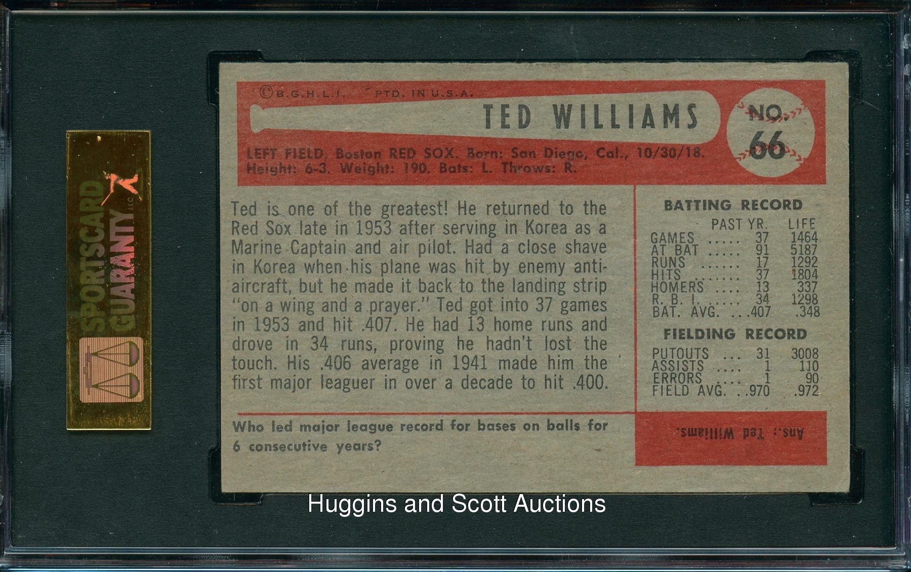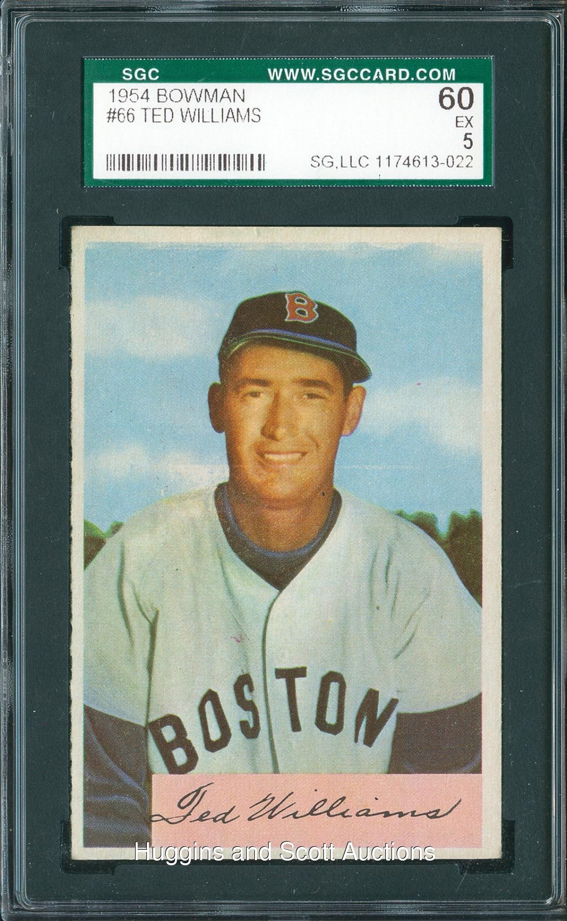 Graded 60 EX 5 by SGC. Essential 1954 Bowman Baseball #66 Ted Williams shortprint that was pulled early in production due to a contract dispute with Topps. This mid-grade portrait of the Hall of Fame hero exhibits relatively crisp corners, solid edges and mostly accurate centering. The obverse color schemes are crisp and vibrant and the biographical reverse proclaiming "Ted is one of the greatest!" is clean.