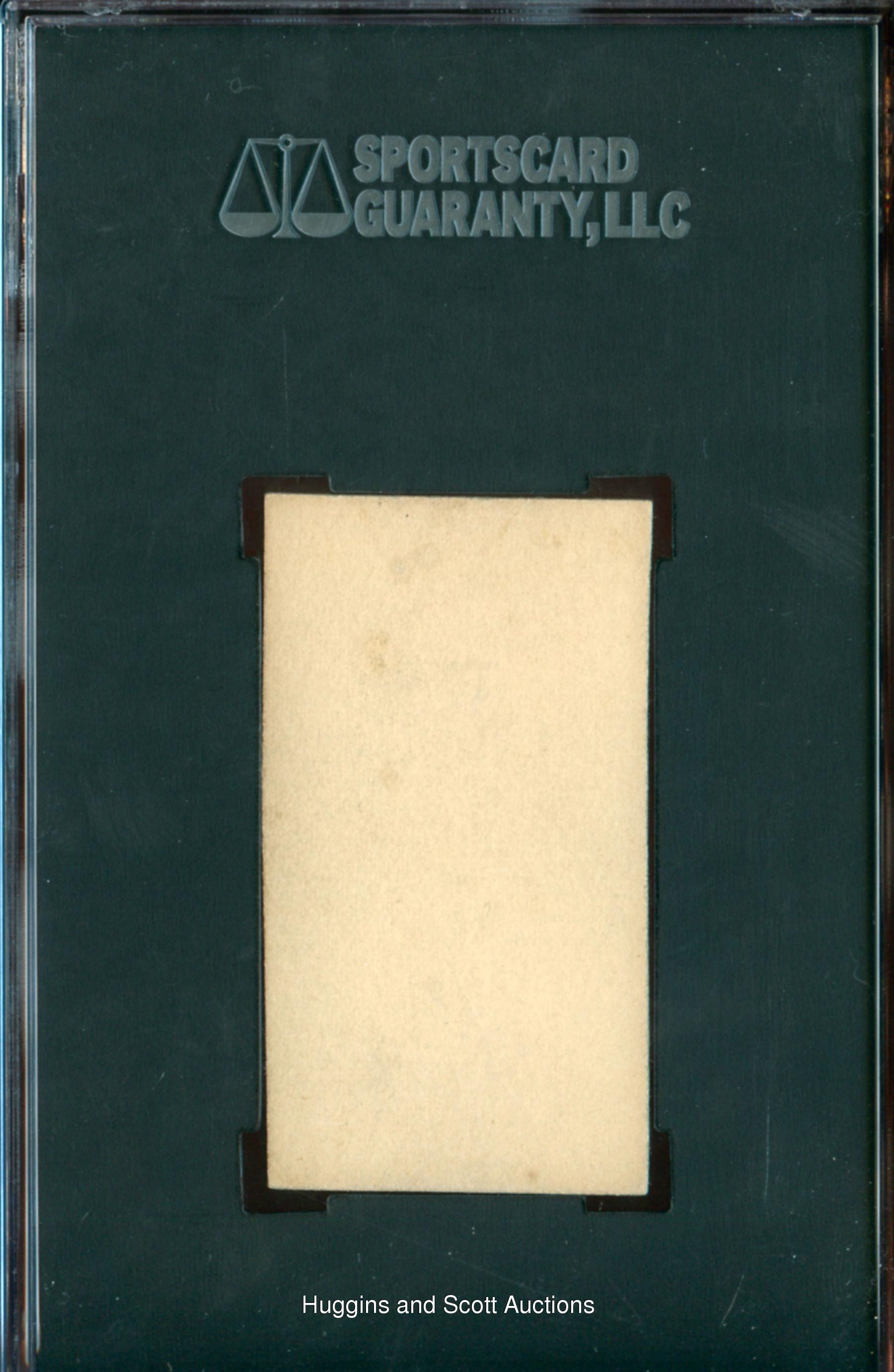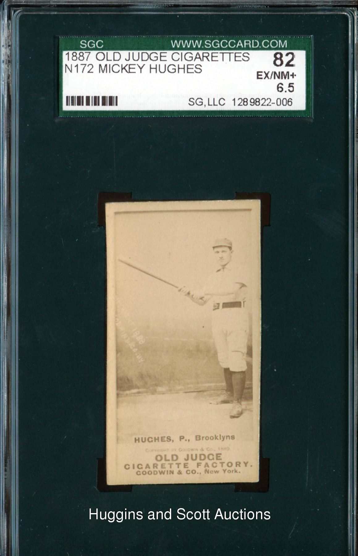 Graded 82 EX/NM+ 65 by SGC. Fill the voids in your nineteenth century collection with this clean 1887 N172 Old Judge Mickey Hughes specimen. The Brooklyn Bridegrooms hurler displays his lumber of choice on this pint-sized treasure. Despite a factory tilt, the appropriately judged antique otherwise exhibits strong corners, clean edges and a crisp image. The blank reverse is clean.