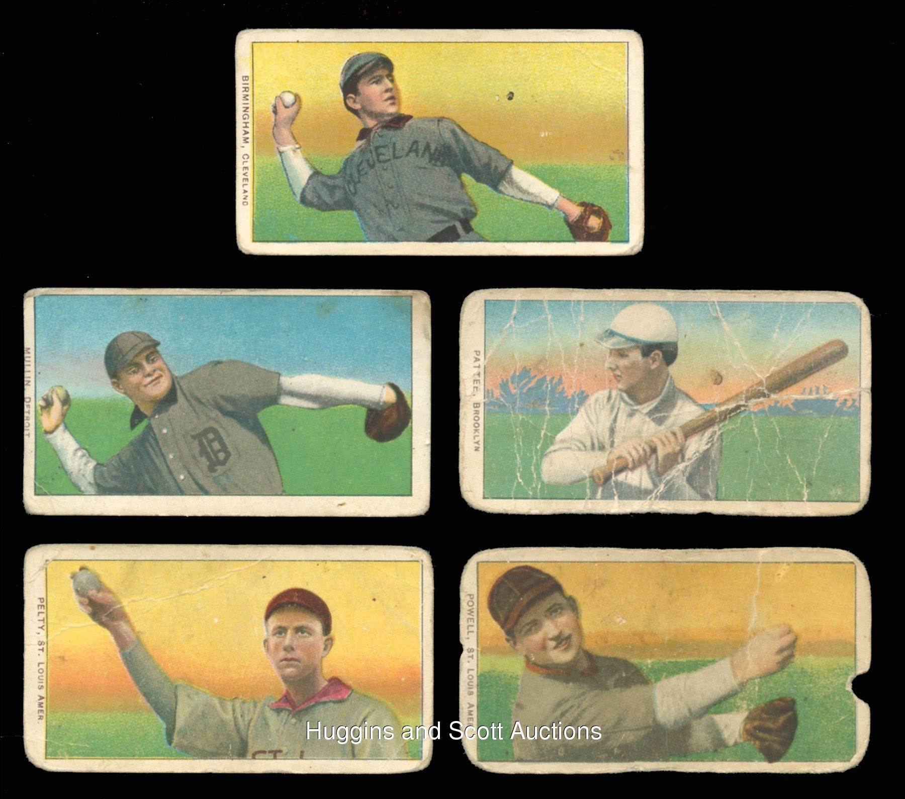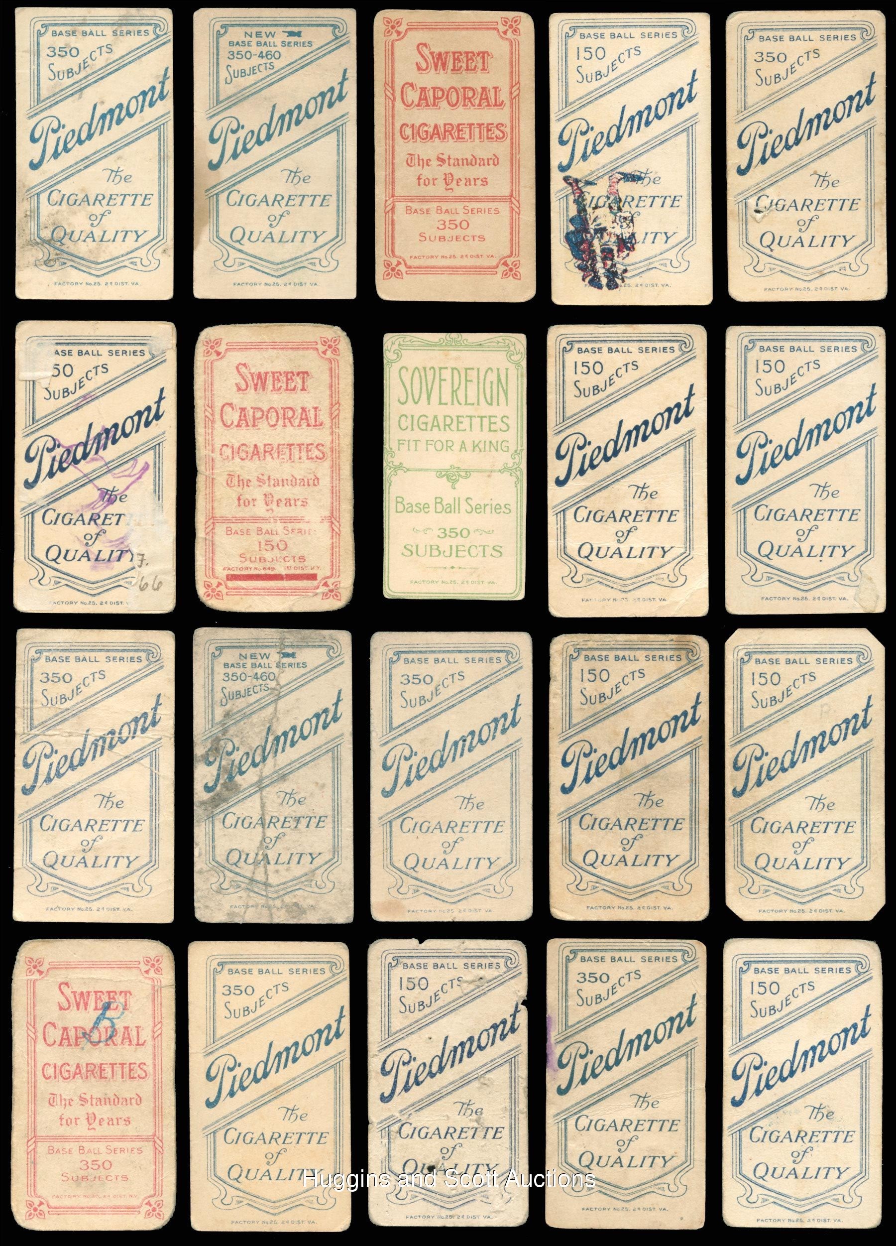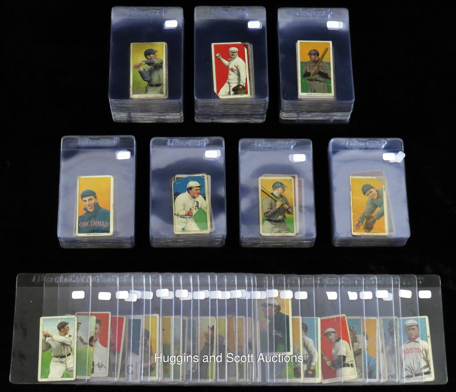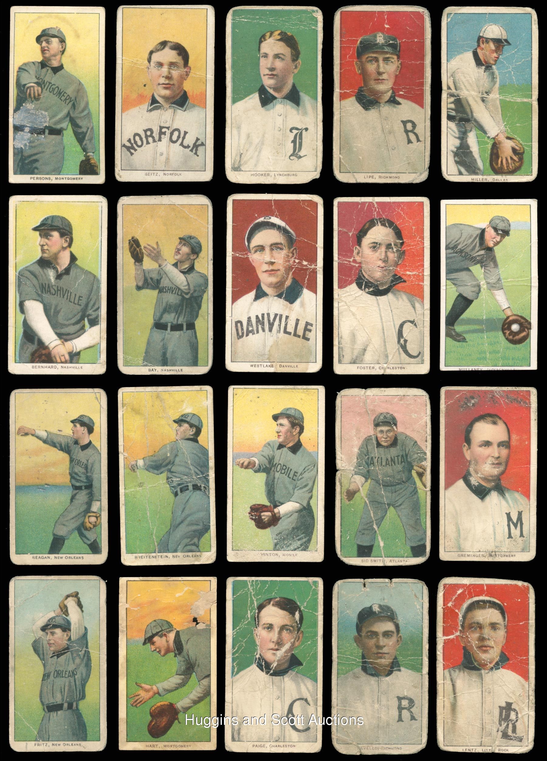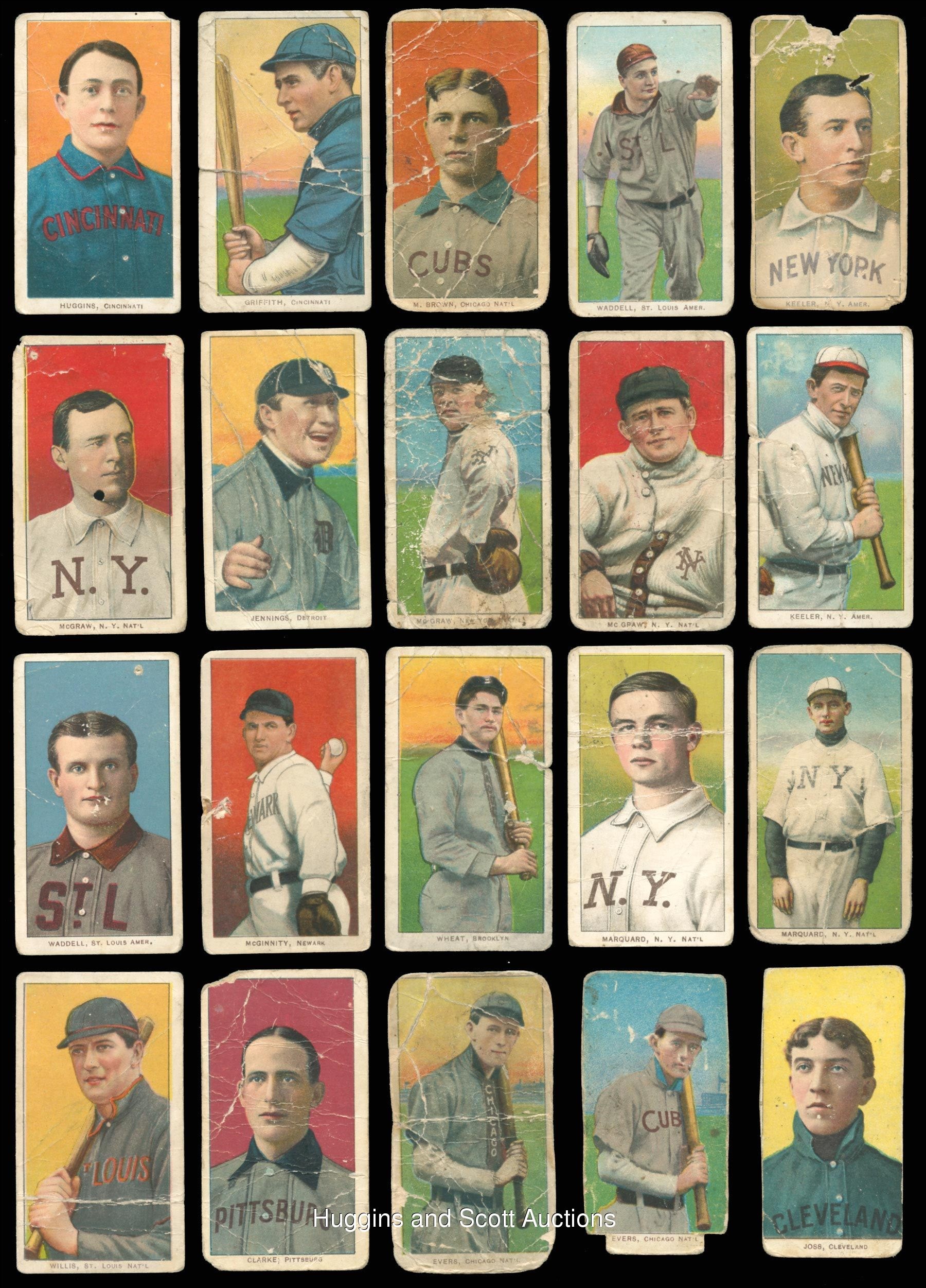 The standard bearer for the pre-war collecting hobby is undoubtedly the 1909-1911 T206 White Borders series. So popular is “The Monster”, that many hobbyists make this ACC designation their lifelong collecting pursuit. Over 90% of the acclaimed century-old set is available with the offered near set of (475/524) different cards. These pint-sized treasures have been well handled over the decades and are ideal for the budget conscious enthusiast. The approximate condition breakdown is as follows: 10% (GD or better), 40% (FR) and 50% (PR) with the majority displaying a combination of acute wear including significant creasing, paper loss, tape residue, trimming, writing or missing pieces. The advertising back breakdown is as follows: (323) Piedmont, (88) Sweet Caporal, (25) Old Mill, (23) Polar Bear, (11) Sovereign, (2) American Beauty (both trimmed), (2) Tolstoi (both trimmed) and (1) El Principe De Gales. Highlights include: Hall of Famers/Stars: (53 cards, all common backs, unless noted) with Bender (FR, No Trees), Bender (FR, with Trees), Bresnahan (GD, Portrait), Breshanan (GD, with Bat), M. Brown (FR, reverse stamp, Cubs on Shirt), M. Brown (PR, Portrait), Chance (PR, Batting), Chance (PR, pin holes, Red Portrait), Chance (PR, Yellow Portrait), Evers (PR, with Bat, Chicago on Shirt, Polar Bear), Evers (trimmed, Cubs on Shirt), Jennings (GD, Both Hands Showing), Lajoie (PR, writing, Throwing), Marquard (FR, Hands at Thighs), Mathewson (trimmed, Dark Cap, Sovereign 350), Mathewson (PR, White Cap), McGraw (GD, Finger in Air), Tinker (PR, Bat Off Shoulder), Tinker (FR, Portrait), Waddell (GD, Throwing); Southern Leaguers near: (46/48 cards, (18) Old Mill); Key Variations/Errors: (4 cards, all common backs) with Lundgren (FR, Chicago) and Horizontal Cards: (5/6 cards, all common backs). More on our website. Hall of Famers/Stars: (53 cards, all common backs, unless noted) with Bender (FR, No Trees), Bender (FR, with Trees), Bresnahan (GD, Portrait), Breshanan (GD, with Bat), M. Brown (FR, reverse stamp, Cubs on Shirt), M. Brown (PR, Portrait), Chance (PR, Batting), Chance (PR, pin holes, Red Portrait), Chance (PR, Yellow Portrait), Chase (PR, reverse paper loss, Blue Portrait), Chase (PR, writing, Dark Cap), Chase (PR, Holding Trophy), Chase (PR, reverse glue residue, Pink Portrait), Chesbro (PR, pinhole), Cicotte (PR), F. Clarke (PR, Portrait), F. Clarke (FR, with Bat), J. Collins (FR), Crawford (PR, pin holes, with Bat), G. Davis (PR, reverse writing), Duffy (FR), Evers (PR, with Bat, Chicago on Shirt, Polar Bear), Evers (trimmed, Cubs on Shirt), Flick (PR, paper loss), Gandil (PR, reverse writing), Griffith (PR, Batting), Griffith (PR, paper residue, Portrait), Huggins (PR, Portrait), Jennings (GD, Both Hands Showing), Jennings (PR, paper loss, One Hand Showing), Jennings (FR, Portrait), Joss (PR, reverse writing, Pitching), Joss (trimmed, Portrait), Keeler (PR, Portrait), Keeler (PR, pin hole, with Bat), Kelley (PR, Old Mill), Lajoie (PR, writing, Throwing), Marquard (FR, Hands at Thighs), Marquard (PR, Portrait), Mathewson (trimmed, Dark Cap, Sovereign 350), Mathewson (PR, White Cap), McGinnity (PR, pin hole), McGraw (GD, Finger in Air), McGraw (PR, Glove at Hip), McGraw (PR, pin holes, Portrait, no Cap), McGraw (PR, writing, Portrait, with Cap), Tinker (PR, Bat Off Shoulder), Tinker (FR, Portrait), Waddell (PR, pinhole, Portrait), Waddell (GD, Throwing), Walsh (trimmed), Wheat (PR), Willis (PR, back stamp, with Bat); Southern Leaguers near: (46/48 cards, (18) Old Mill) with Bastian (PR), Bay (PR, reverse writing), Bernhard (FR), Breitenstein (PR), Carey (trimmed), Coles (PR, paper loss, Old Mill), Cranston (FR, Old Mill), Ellam (PR, paper loss, Old Mill), Foster (PR), Fritz (PR), Greminger (PR), Guiheen (FR), B. Hart (FR, Old Mill), J. Hart (PR, pin hole), Helm (GD), Hickman (GD), Hooker (PR), E. Howard (FR), A. Jordan (trimmed), Kiernan (PR, paper loss, Old Mill), LaFitte (FR, stain), Lentz (PR), Lipe (PR, reverse writing, Old Mill), Mannion (PR, paper loss, Old Mill), McCauley (FR, reverse writing, Old Mill), M. Miller (PR, taped, Old Mill), Molesworth (PR, reverse writing, Old Mill), Mullaney (trimmed), Orth (FR), Otey (PR), Paige (PR), Perdue (PR, Old Mill), Persons (PR, stain), Reagan (FR), Revelle (PR, Old Mill), Rockenfeld (PR, Old Mill), Ryan (PR, Old Mill), Seitz (FR), Shaughnessy (GD), C. Smith (FR, Old Smith, reverse writing), S. Smith (PR, Old Mill), Thebo (PR, Old Mill), Thornton (PR, paper loss), Violat (FR, Old Mill), Westlake (PR), F. White (PR, paper loss); Key Variations/Errors: (4 cards, all common backs) with Dahlen (PR, writing, Brooklyn), Kleinow (FR, Boston), Lundgren (FR, Chicago), F. Smith (PR, Chicago & Boston); Horizontal Cards: (5/6 cards, all common backs) with Birmingham (GD), Mullin (FR), Pattee (PR), Pelty (FR), Powell (PR); Uncommon Backs: with Old Mill: with L. Doyle (PR, with Bat), H. Hinchman (trimmed), Lake (GD, St. Louis, Ball in Hand), Livingston (PR), Leifield (FR, Batting), Titus (PR); Polar Bear: with Abbott (PR), Adkins (GD), Ball (FR, Cleveland), Brain (PR, pin hole), Casey (PR), Downey (PR, Batting), Evans (FR), Grimshaw (PR), S. Hofman (PR, paper loss), Lake (PR, reverse glue residue, St. Louis, No Ball in Hand), Latham (PR, paper loss), Leach (PR, Bending Over, McIntyre (FR, BKLN.), Merkle (PR, reverse paper loss, Throwing, Merritt (PR), Moriarty (PR), Perring (PR), H. Shaw (FR), Snodgrass (PR, paper loss, Catching), Street (GD, Catching), Willetts (PR), Wright (PR); Sovereign: with Ball (PR, writing, New York, 150 series), Criss (PR, 350 series), Hartsel (PR, paper loss 350 series), Herzog (FR, New York, 150 series), Jackson (FR, 150 series), T. Jones (PR, 150 series), Knight (PR, with Bat, 350 series), O’Brien (PR, 350 series), Seymour (PR, Throwing, 350 series), J. White (PR, 350 series); Tolstoi: with Davidson (trimmed), Payne (trimmed); American Beauty: with Marshall (trimmed, 350 series framed), Schlafly (trimmed, 350 series, fr