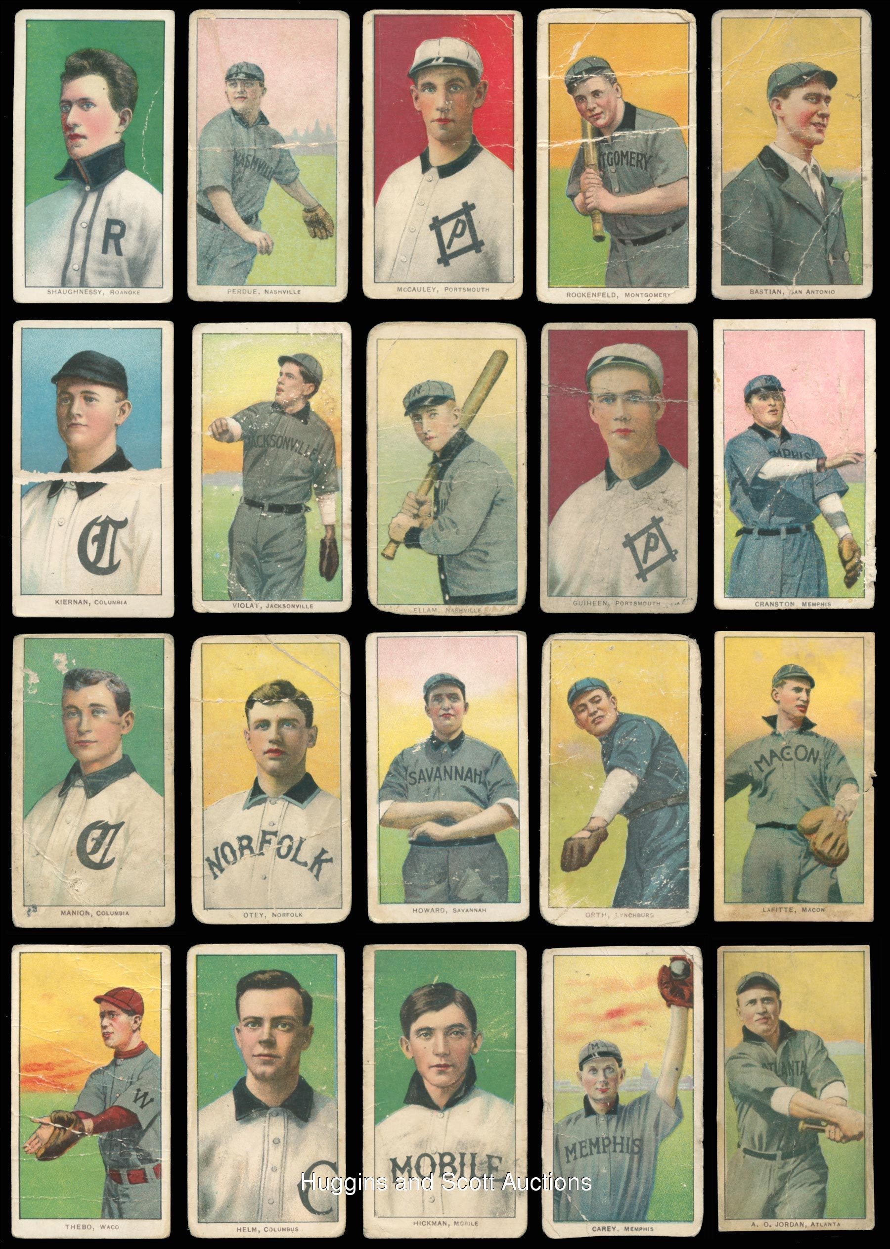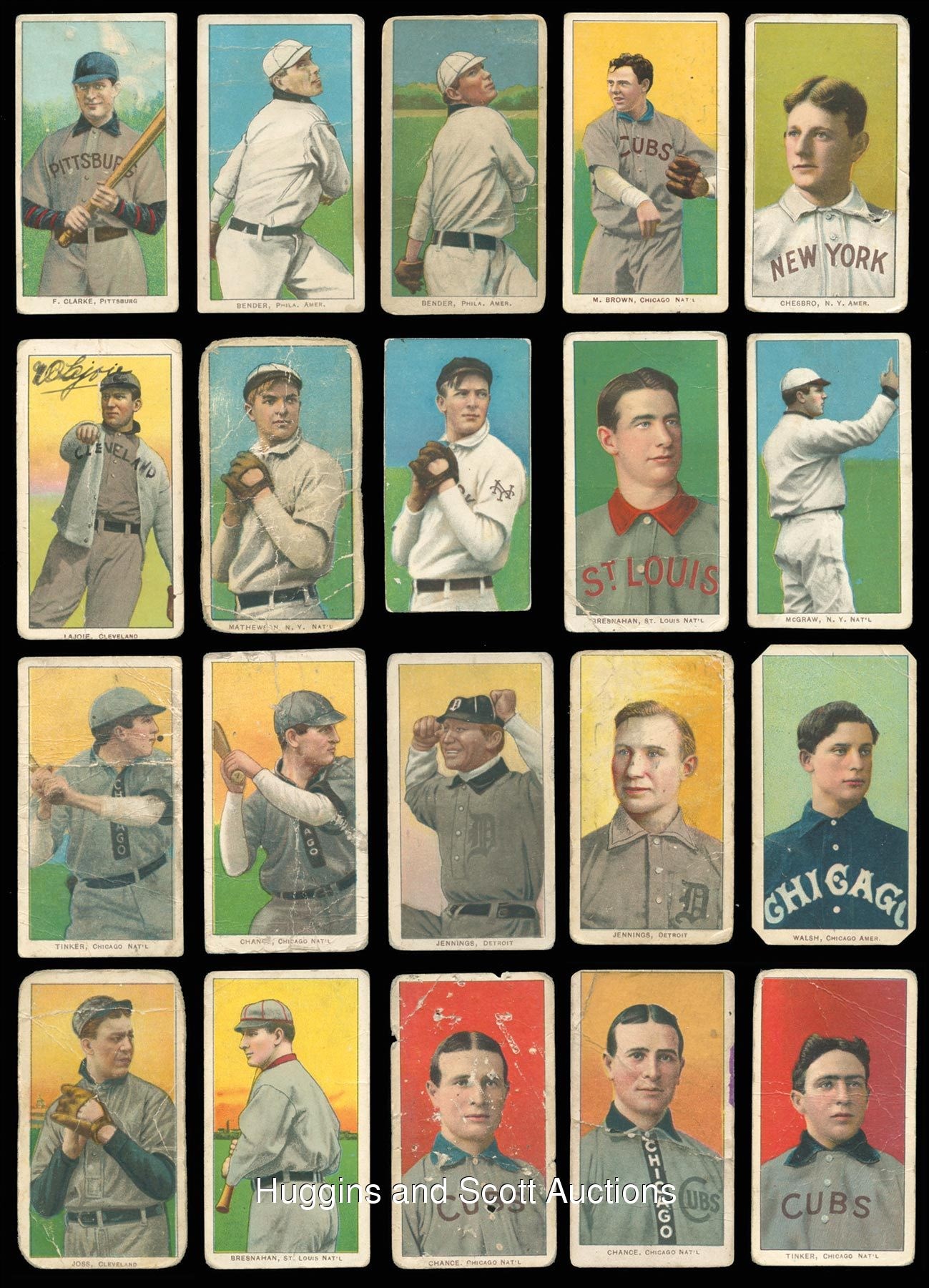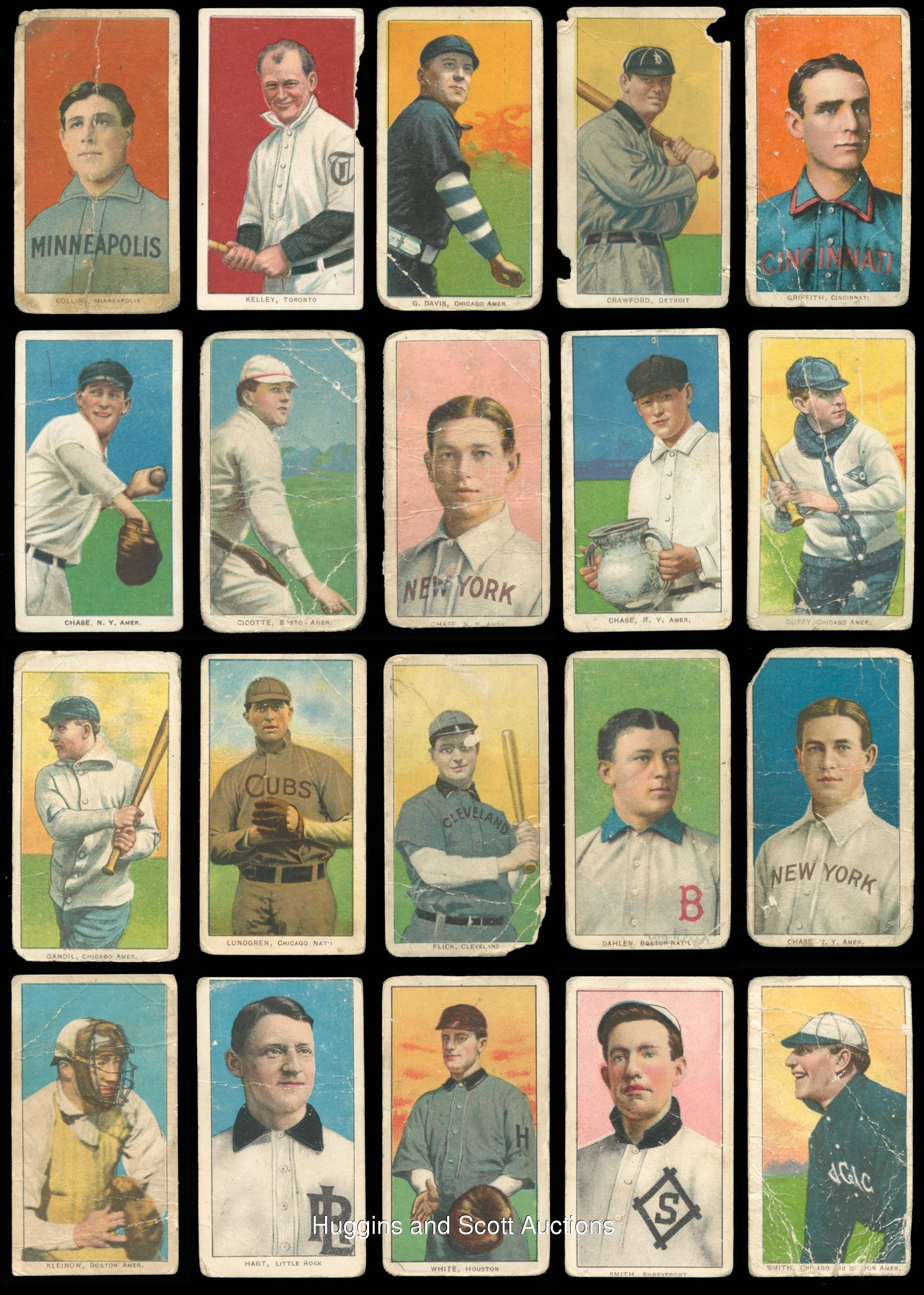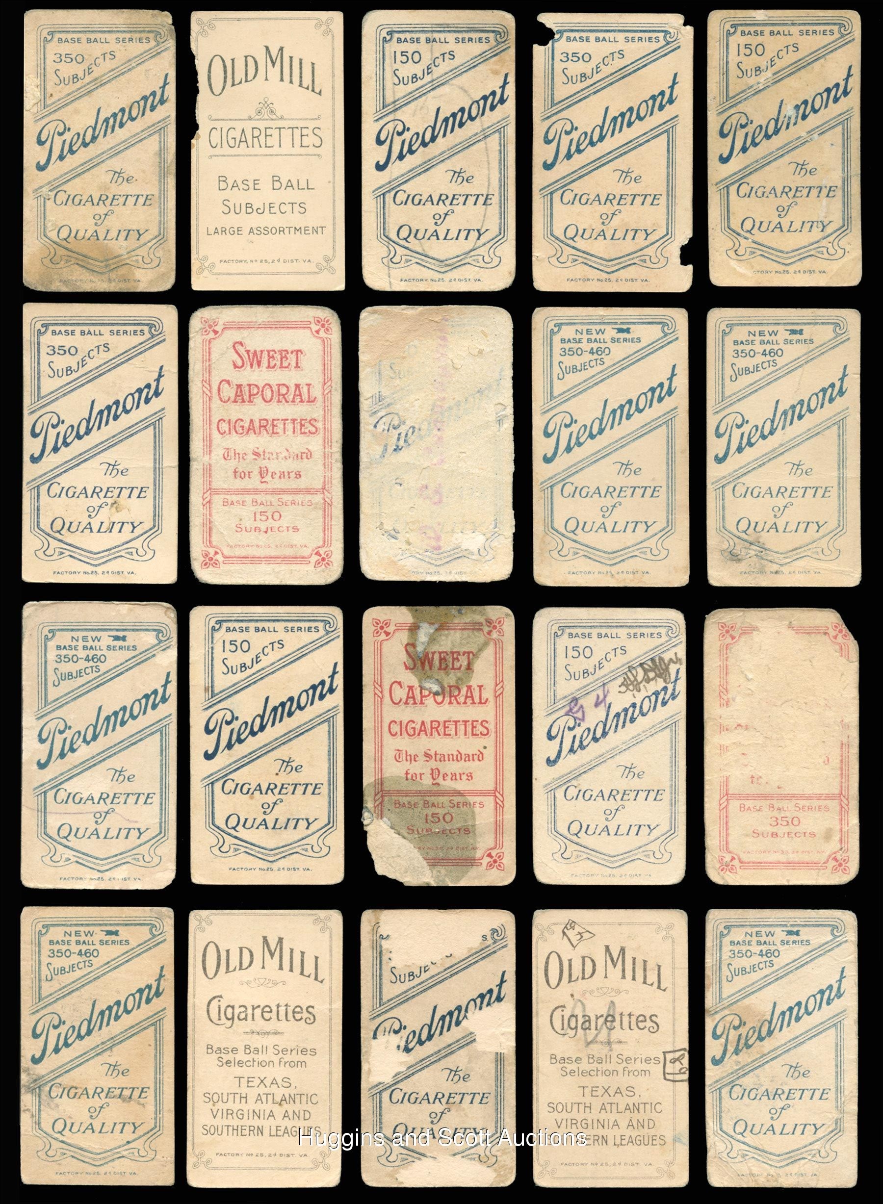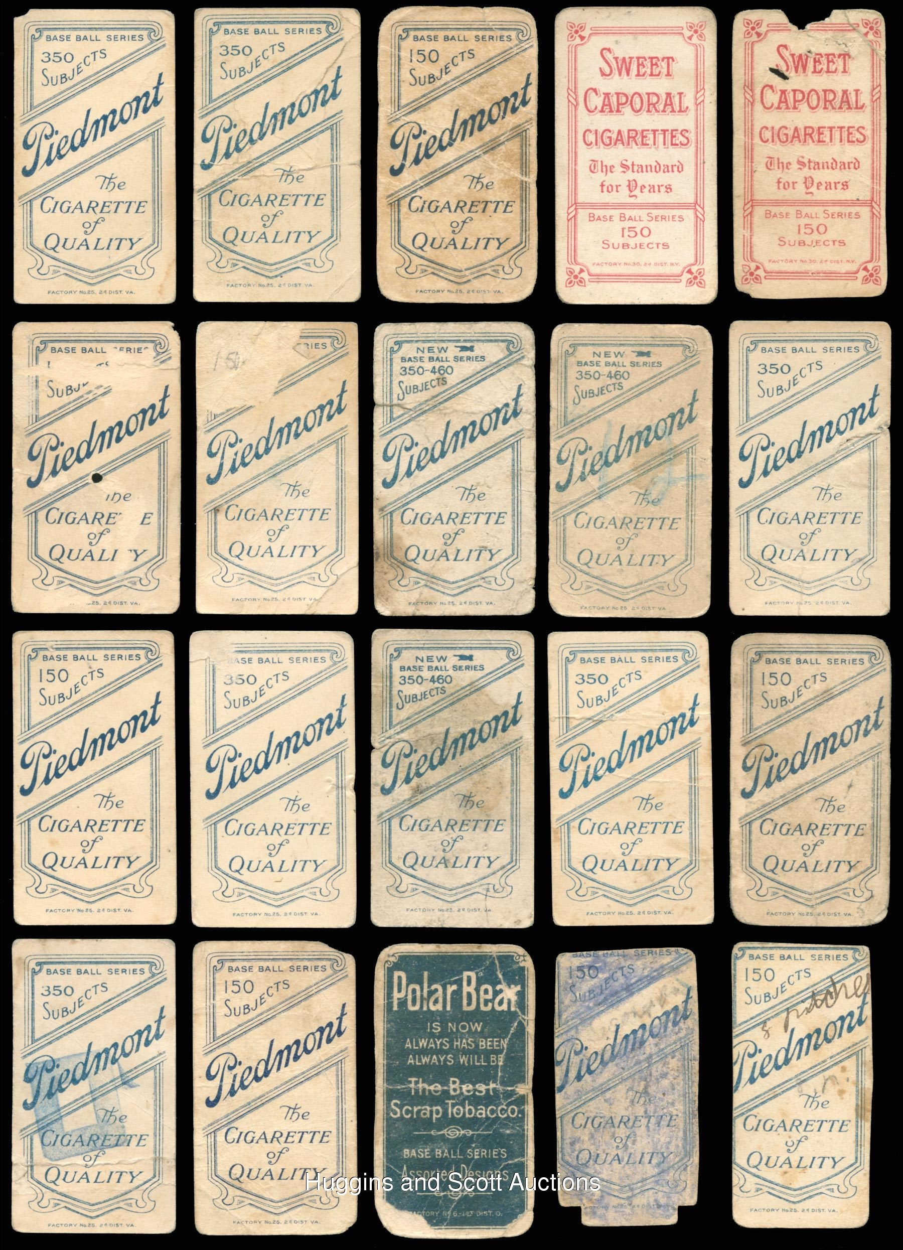 The standard bearer for the pre-war collecting hobby is undoubtedly the 1909-1911 T206 White Borders series. So popular is “The Monster”, that many hobbyists make this ACC designation their lifelong collecting pursuit. Over 90% of the acclaimed century-old set is available with the offered near set of (475/524) different cards. These pint-sized treasures have been well handled over the decades and are ideal for the budget conscious enthusiast. The approximate condition breakdown is as follows: 10% (GD or better), 40% (FR) and 50% (PR) with the majority displaying a combination of acute wear including significant creasing, paper loss, tape residue, trimming, writing or missing pieces. The advertising back breakdown is as follows: (323) Piedmont, (88) Sweet Caporal, (25) Old Mill, (23) Polar Bear, (11) Sovereign, (2) American Beauty (both trimmed), (2) Tolstoi (both trimmed) and (1) El Principe De Gales. Highlights include: Hall of Famers/Stars: (53 cards, all common backs, unless noted) with Bender (FR, No Trees), Bender (FR, with Trees), Bresnahan (GD, Portrait), Breshanan (GD, with Bat), M. Brown (FR, reverse stamp, Cubs on Shirt), M. Brown (PR, Portrait), Chance (PR, Batting), Chance (PR, pin holes, Red Portrait), Chance (PR, Yellow Portrait), Evers (PR, with Bat, Chicago on Shirt, Polar Bear), Evers (trimmed, Cubs on Shirt), Jennings (GD, Both Hands Showing), Lajoie (PR, writing, Throwing), Marquard (FR, Hands at Thighs), Mathewson (trimmed, Dark Cap, Sovereign 350), Mathewson (PR, White Cap), McGraw (GD, Finger in Air), Tinker (PR, Bat Off Shoulder), Tinker (FR, Portrait), Waddell (GD, Throwing); Southern Leaguers near: (46/48 cards, (18) Old Mill); Key Variations/Errors: (4 cards, all common backs) with Lundgren (FR, Chicago) and Horizontal Cards: (5/6 cards, all common backs). More on our website. Hall of Famers/Stars: (53 cards, all common backs, unless noted) with Bender (FR, No Trees), Bender (FR, with Trees), Bresnahan (GD, Portrait), Breshanan (GD, with Bat), M. Brown (FR, reverse stamp, Cubs on Shirt), M. Brown (PR, Portrait), Chance (PR, Batting), Chance (PR, pin holes, Red Portrait), Chance (PR, Yellow Portrait), Chase (PR, reverse paper loss, Blue Portrait), Chase (PR, writing, Dark Cap), Chase (PR, Holding Trophy), Chase (PR, reverse glue residue, Pink Portrait), Chesbro (PR, pinhole), Cicotte (PR), F. Clarke (PR, Portrait), F. Clarke (FR, with Bat), J. Collins (FR), Crawford (PR, pin holes, with Bat), G. Davis (PR, reverse writing), Duffy (FR), Evers (PR, with Bat, Chicago on Shirt, Polar Bear), Evers (trimmed, Cubs on Shirt), Flick (PR, paper loss), Gandil (PR, reverse writing), Griffith (PR, Batting), Griffith (PR, paper residue, Portrait), Huggins (PR, Portrait), Jennings (GD, Both Hands Showing), Jennings (PR, paper loss, One Hand Showing), Jennings (FR, Portrait), Joss (PR, reverse writing, Pitching), Joss (trimmed, Portrait), Keeler (PR, Portrait), Keeler (PR, pin hole, with Bat), Kelley (PR, Old Mill), Lajoie (PR, writing, Throwing), Marquard (FR, Hands at Thighs), Marquard (PR, Portrait), Mathewson (trimmed, Dark Cap, Sovereign 350), Mathewson (PR, White Cap), McGinnity (PR, pin hole), McGraw (GD, Finger in Air), McGraw (PR, Glove at Hip), McGraw (PR, pin holes, Portrait, no Cap), McGraw (PR, writing, Portrait, with Cap), Tinker (PR, Bat Off Shoulder), Tinker (FR, Portrait), Waddell (PR, pinhole, Portrait), Waddell (GD, Throwing), Walsh (trimmed), Wheat (PR), Willis (PR, back stamp, with Bat); Southern Leaguers near: (46/48 cards, (18) Old Mill) with Bastian (PR), Bay (PR, reverse writing), Bernhard (FR), Breitenstein (PR), Carey (trimmed), Coles (PR, paper loss, Old Mill), Cranston (FR, Old Mill), Ellam (PR, paper loss, Old Mill), Foster (PR), Fritz (PR), Greminger (PR), Guiheen (FR), B. Hart (FR, Old Mill), J. Hart (PR, pin hole), Helm (GD), Hickman (GD), Hooker (PR), E. Howard (FR), A. Jordan (trimmed), Kiernan (PR, paper loss, Old Mill), LaFitte (FR, stain), Lentz (PR), Lipe (PR, reverse writing, Old Mill), Mannion (PR, paper loss, Old Mill), McCauley (FR, reverse writing, Old Mill), M. Miller (PR, taped, Old Mill), Molesworth (PR, reverse writing, Old Mill), Mullaney (trimmed), Orth (FR), Otey (PR), Paige (PR), Perdue (PR, Old Mill), Persons (PR, stain), Reagan (FR), Revelle (PR, Old Mill), Rockenfeld (PR, Old Mill), Ryan (PR, Old Mill), Seitz (FR), Shaughnessy (GD), C. Smith (FR, Old Smith, reverse writing), S. Smith (PR, Old Mill), Thebo (PR, Old Mill), Thornton (PR, paper loss), Violat (FR, Old Mill), Westlake (PR), F. White (PR, paper loss); Key Variations/Errors: (4 cards, all common backs) with Dahlen (PR, writing, Brooklyn), Kleinow (FR, Boston), Lundgren (FR, Chicago), F. Smith (PR, Chicago & Boston); Horizontal Cards: (5/6 cards, all common backs) with Birmingham (GD), Mullin (FR), Pattee (PR), Pelty (FR), Powell (PR); Uncommon Backs: with Old Mill: with L. Doyle (PR, with Bat), H. Hinchman (trimmed), Lake (GD, St. Louis, Ball in Hand), Livingston (PR), Leifield (FR, Batting), Titus (PR); Polar Bear: with Abbott (PR), Adkins (GD), Ball (FR, Cleveland), Brain (PR, pin hole), Casey (PR), Downey (PR, Batting), Evans (FR), Grimshaw (PR), S. Hofman (PR, paper loss), Lake (PR, reverse glue residue, St. Louis, No Ball in Hand), Latham (PR, paper loss), Leach (PR, Bending Over, McIntyre (FR, BKLN.), Merkle (PR, reverse paper loss, Throwing, Merritt (PR), Moriarty (PR), Perring (PR), H. Shaw (FR), Snodgrass (PR, paper loss, Catching), Street (GD, Catching), Willetts (PR), Wright (PR); Sovereign: with Ball (PR, writing, New York, 150 series), Criss (PR, 350 series), Hartsel (PR, paper loss 350 series), Herzog (FR, New York, 150 series), Jackson (FR, 150 series), T. Jones (PR, 150 series), Knight (PR, with Bat, 350 series), O’Brien (PR, 350 series), Seymour (PR, Throwing, 350 series), J. White (PR, 350 series); Tolstoi: with Davidson (trimmed), Payne (trimmed); American Beauty: with Marshall (trimmed, 350 series framed), Schlafly (trimmed, 350 series, fr