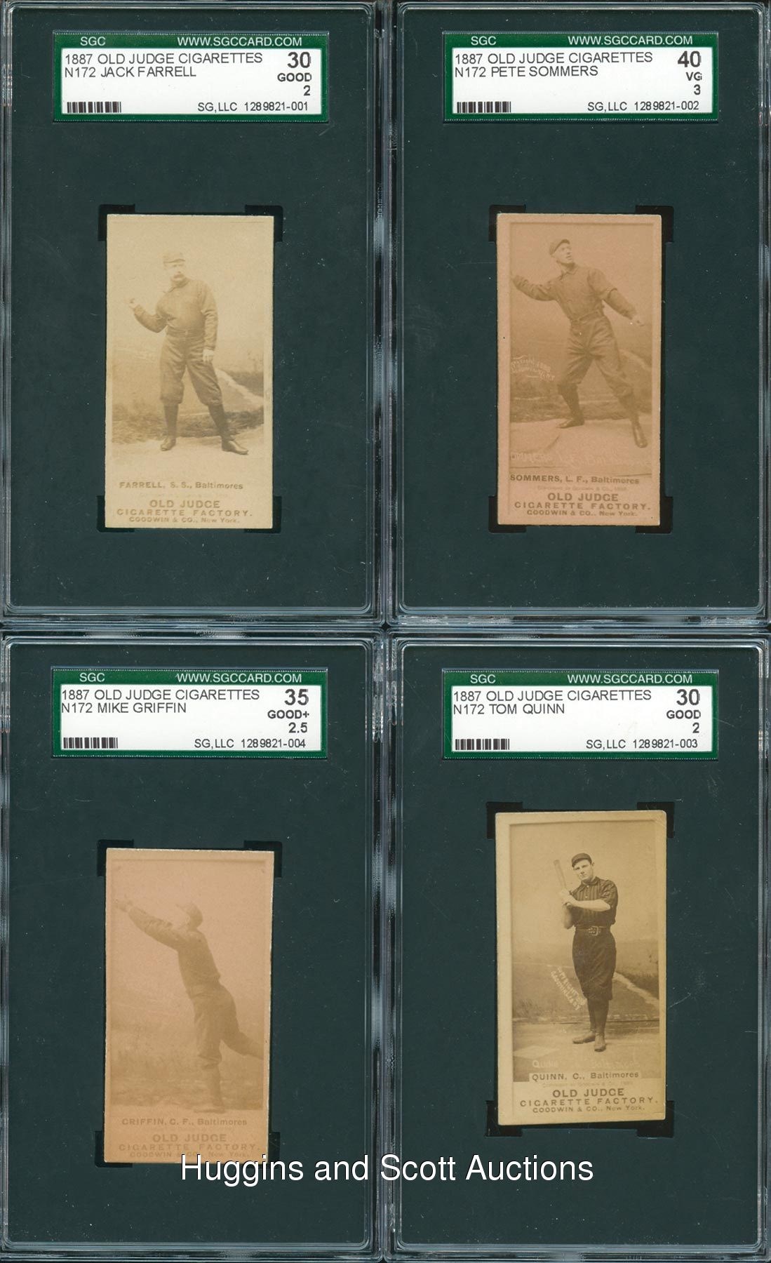 The early bird collector will get these (4) 1887 N172 Old Judge Baltimore Orioles singles. Each graded between 40 VG 3 and 30 Good 2 by SGC. These 126 year-old treasures each display (EX-MT) surfaces with clear images and enchanting captions. Slight reverse paper pulling or residue imperfections account for the technical assessments. Included are SGC 40: Sommers; SGC 35: Griffin; SGC 30: (2 cards) with Farrell and Quinn.