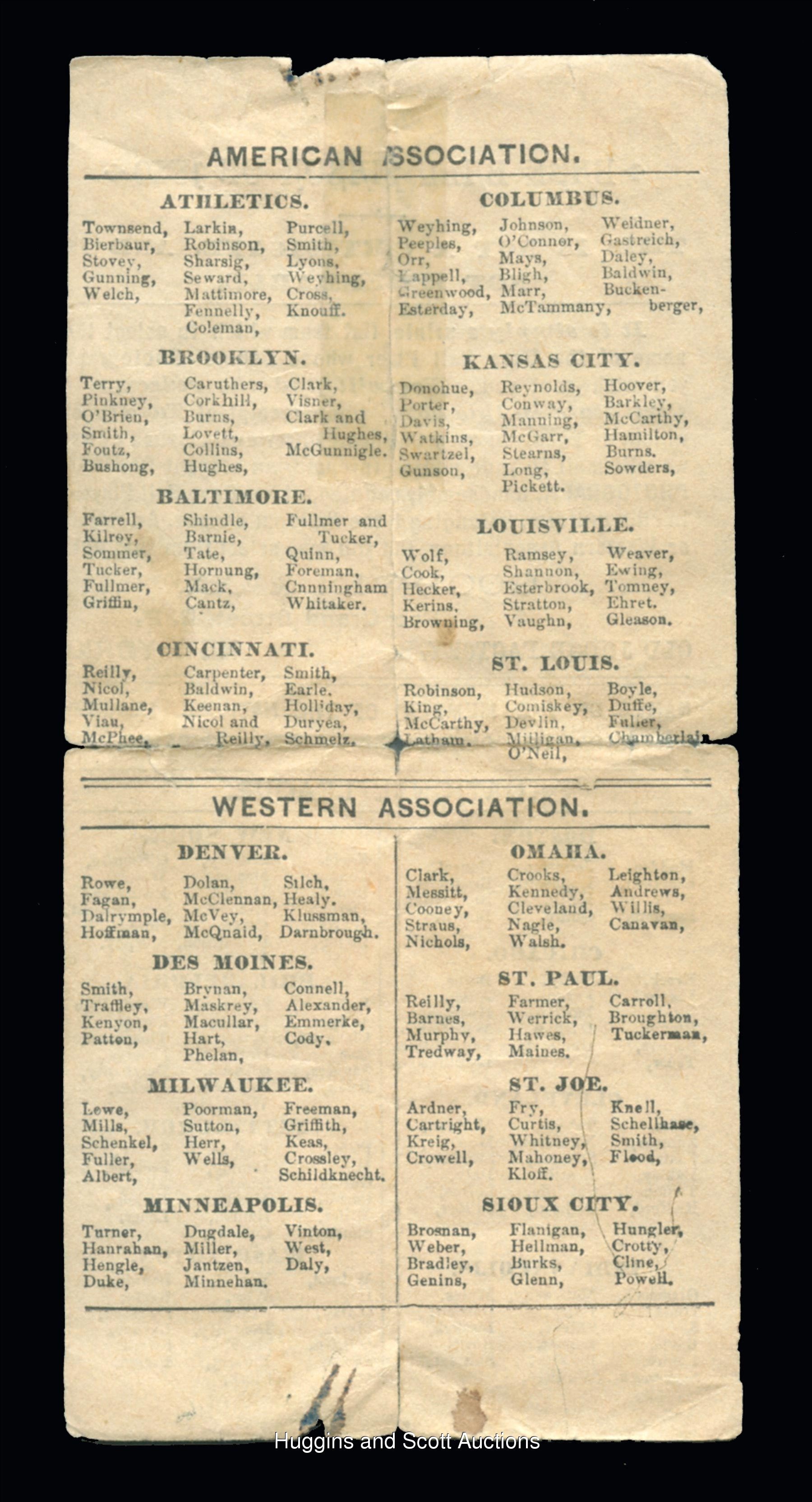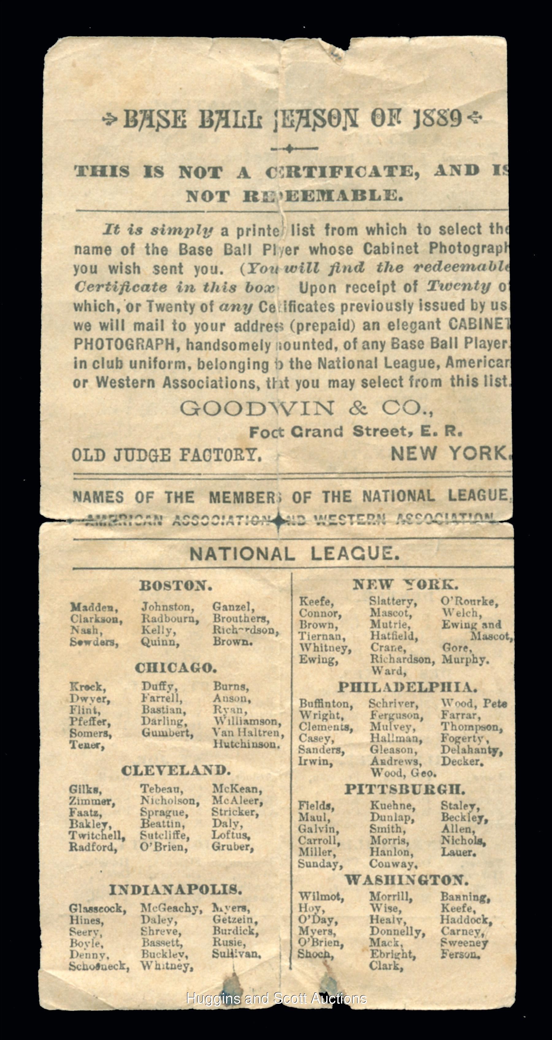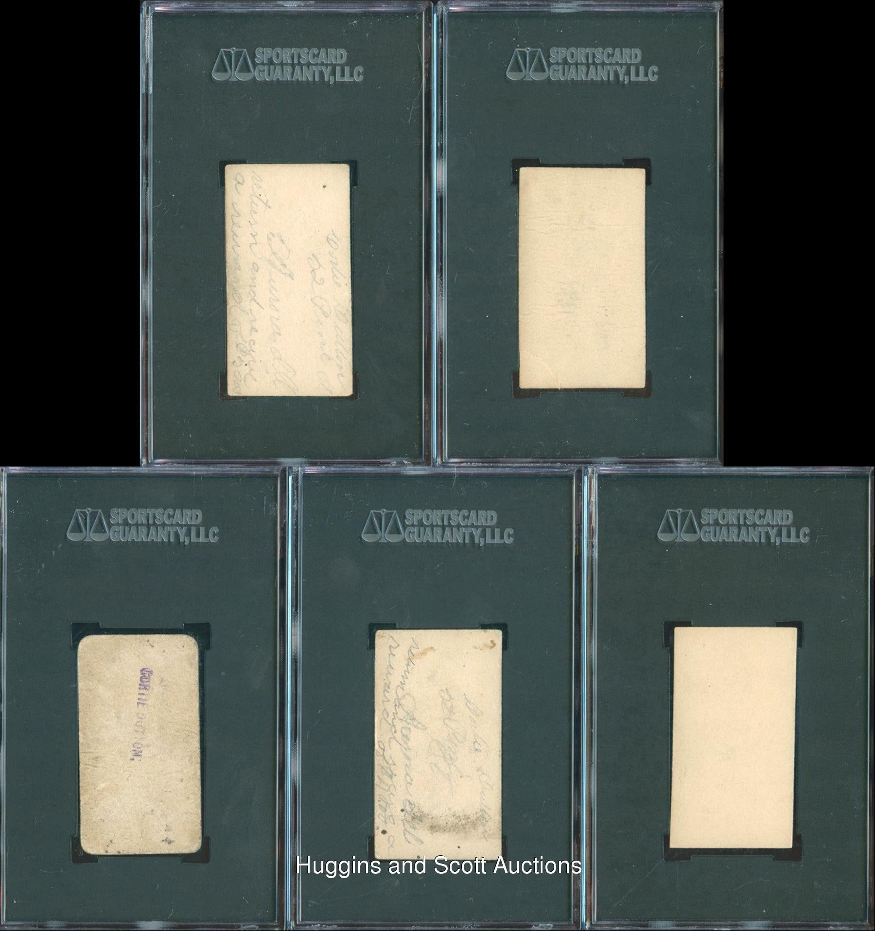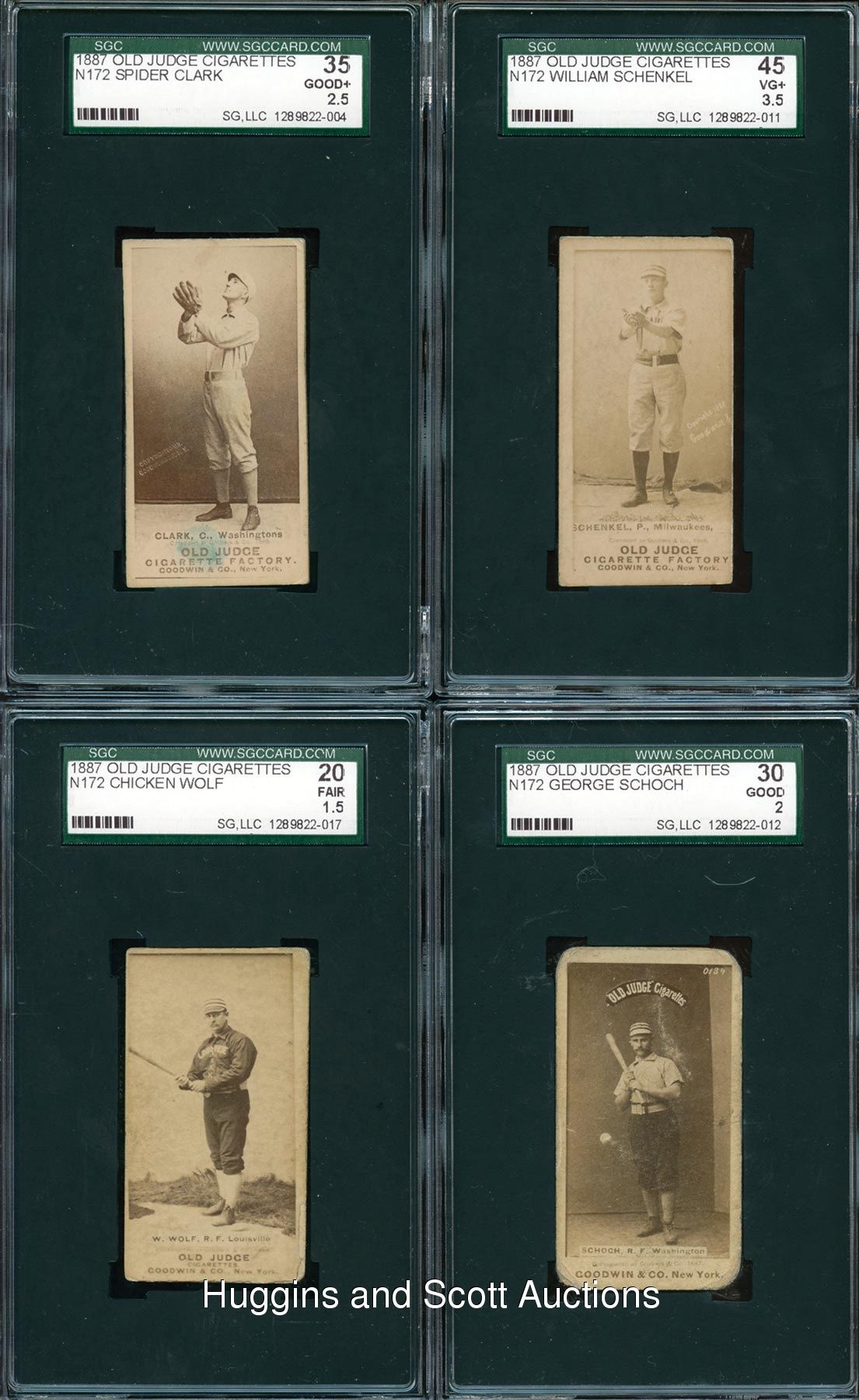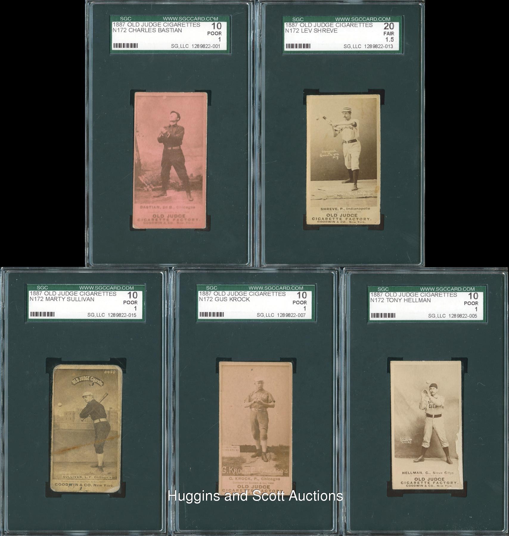Formidable starting nine of 1887 N172 Old Judge singles. Each graded by SGC. Included are SGC 45: Schenkel (Milwaukee); SGC 35: Clark (Washington); SGC 30: Schoch (Washington); SGC 20: (2 cards) with Chicken Wolf (Louisville), Shreve (Indianapolis); SGC 10: (4 cards) with Bastian (Chicago, reverse writing), Hellman (Sioux City), Krock (Chicago, reverse writing) and M. Sullivan (Chicago, reverse stamp). Accompanying this lot is an Old Judge cigarettes checklist. Item is complete with compacting folds and clear tape on the reverse.
