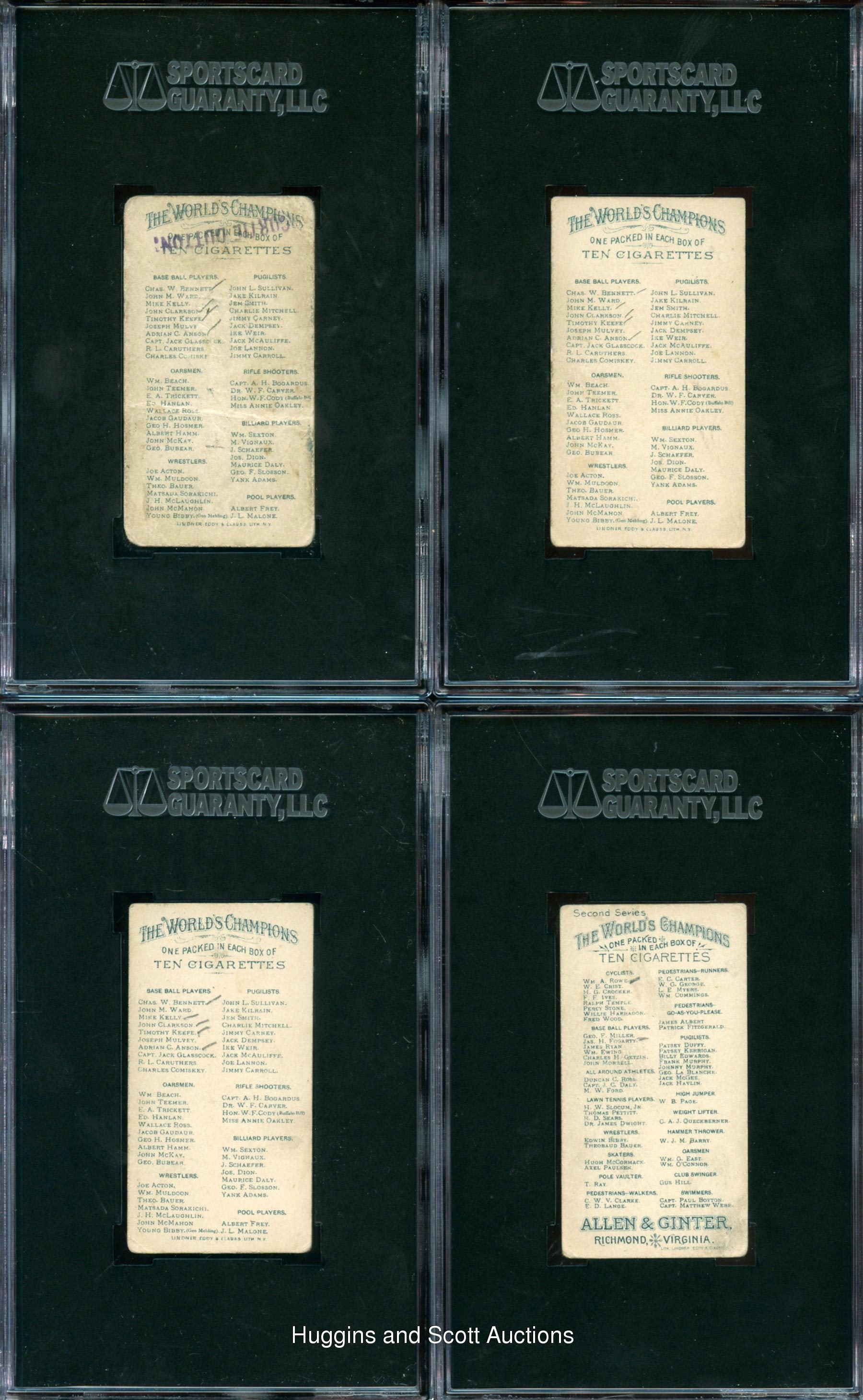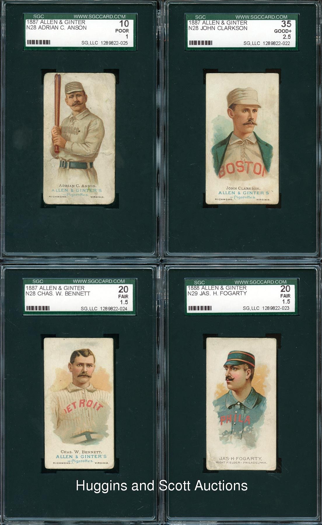 Those with an eye for the nineteenth century will appreciate this quartet of baseball players from the 1887-1888 N27 and N28 Allen & Ginter series. Each graded by SGC. Included are 1887 N27 Allen & Ginter: (2 cards) with Anson (SGC 10, reverse check marks), Clarkson (SGC 35, reverse check marks); 1888 N28 Allen & Ginter: (2 cards) with Bennett (SGC 20, reverse check marks) and Fogarty (SGC 20, reverse check marks).