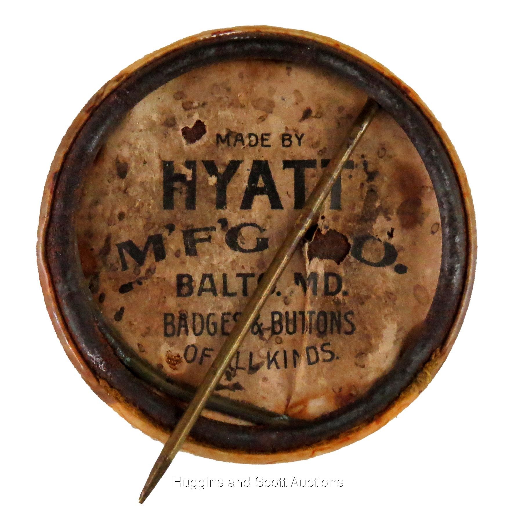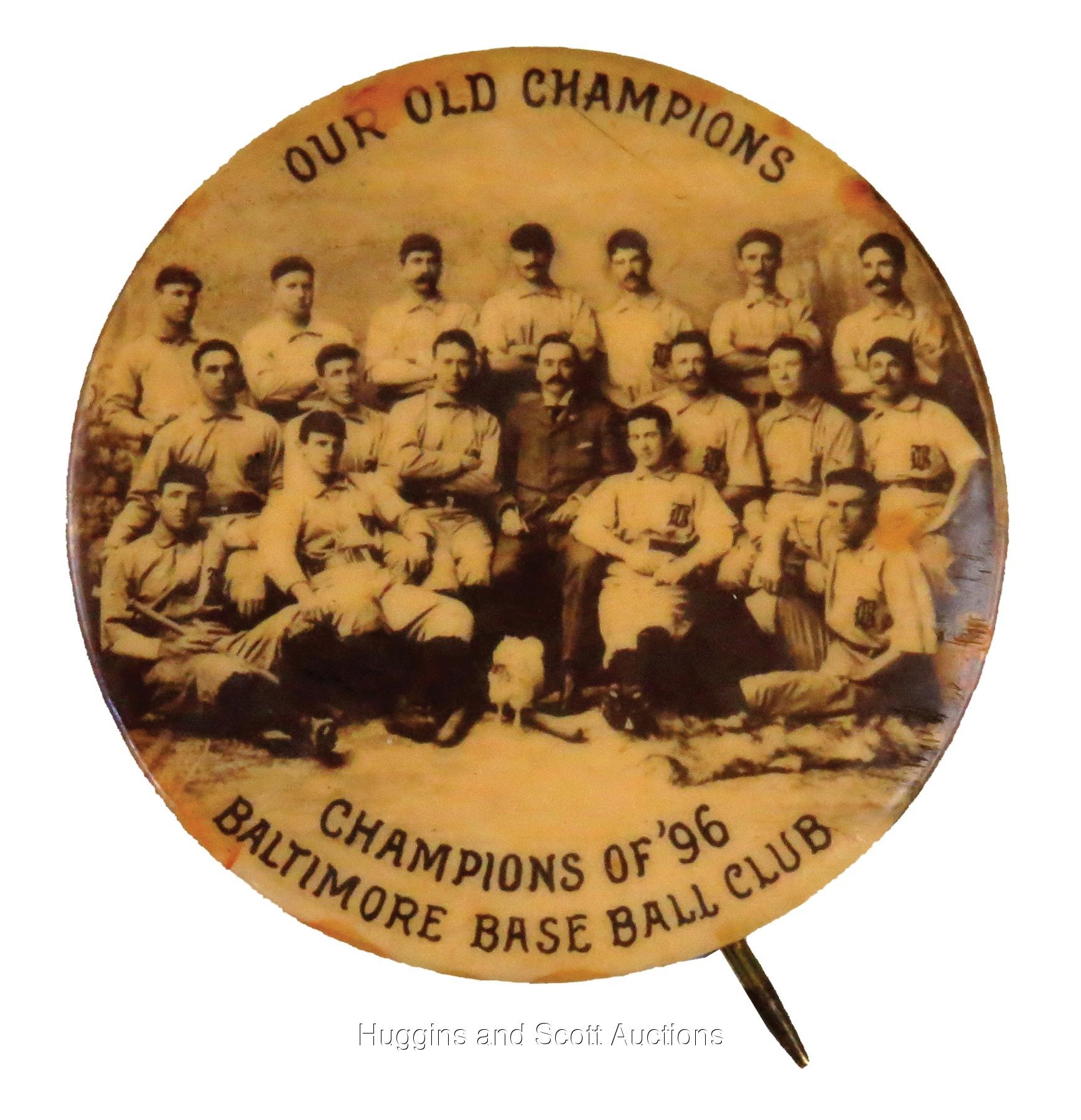 Released by Hyatt Manufacturing in commemoration of the decade since the 1896 Baltimore Orioles conquered the National League, this 1906 “Our Old Champions” pinback is a remarkable artifact from a bygone era. The 1-3/4” heirloom displays clear sepia images of the squad including Hall of Famers Hanlon, Jennings, Keeler, Kelley, McGraw and W. Robinson along with dark text. Presents in (EX to Mint) condition with only superficial abrasions to the celluloid finish and a moderately worn, but tightly attached paper liner. Moderate perimeter staining does not adversely affect the overall presentation of this antiquity. The metallic pin is sharp, tightly intact and must have been worn as a “badge of honor” by its original owner.