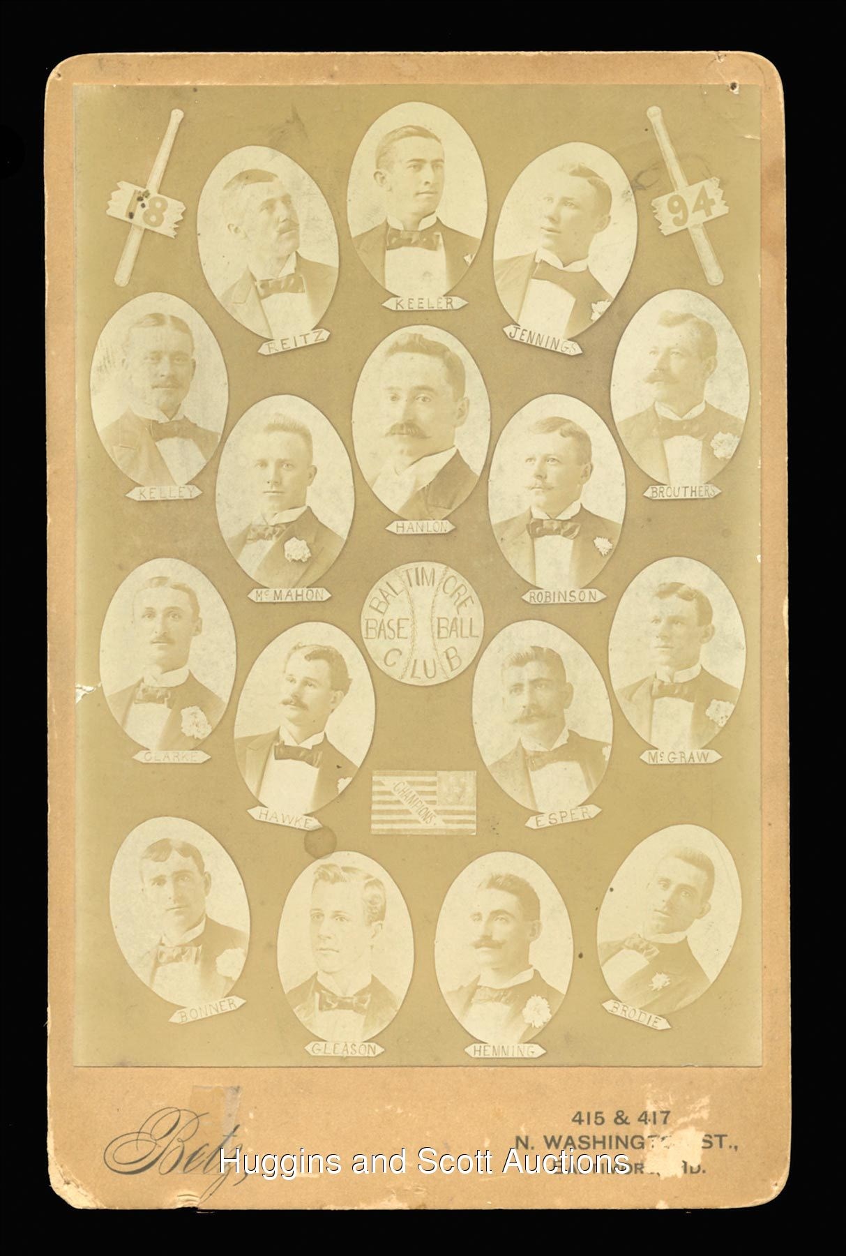 The 1890s Baltimore Orioles were a dynasty which fielded numerous Hall of Famers and used “small ball” along with sound defensive principles to appear in four straight Temple Cup series. Produced by the Betz Studio of N. Washington St. in Baltimore, the offered 1894 Baltimore Baseball Club cabinet was released during their first title appearance. The 4-1/4 x 6-1/2” antiquity pictures sixteen members of the championship squad, eight of whom would later be enshrined at Cooperstown. The cameos depict the players in formal attire complete with identifiers beneath their oval images. Subjects include: Bonner, Brodie, Brouthers, Clarke, Esper, Gleason, Hanlon, Hawke, Hemning, Jennings, Keeler, Kelley, McGraw, McMahon, Reitz and W. Robinson. With exception to a mild fraying to the left of Clarke’s portrait, the crisp sepia images are unobstructed by limited surface and reverse paper loss and tape residue. Two pin holes along the upper corners do not seriously disrupt the overall design scheme. The ornate canvas is crease-free with only minimal surface imperfections. More on our website. Interestingly, the poses are exact replicas of the decidedly scarce 1894 Alpha Engraving issue. An impressive nineteenth century “Charm City” diamond artifact from a season in which the Orioles first captured the hearts of their home city.