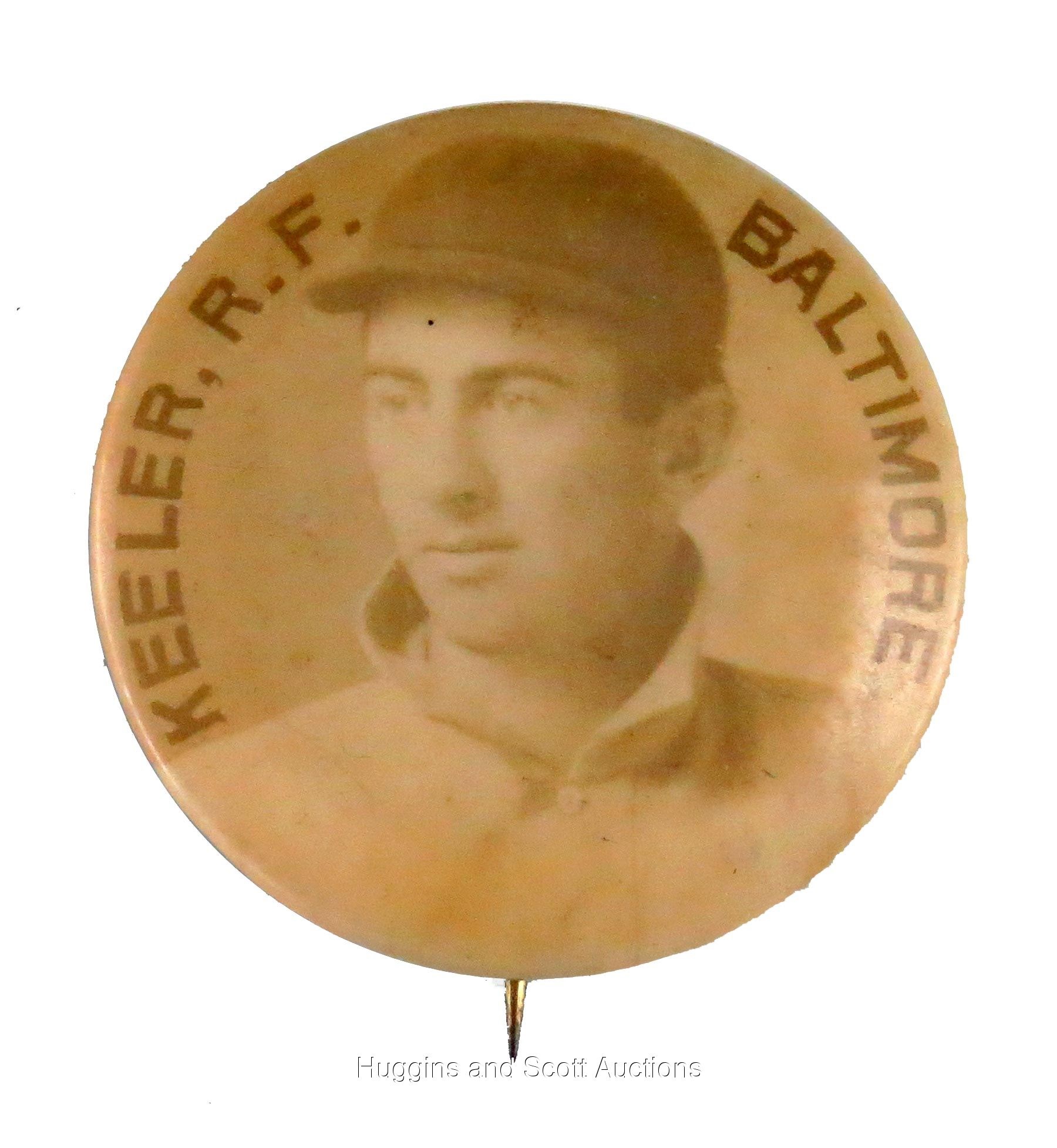 Exquisite 1898 Cameo Pepsin Gum Willie Keeler pin, perhaps the finest extant. While period “Wee Willie” material from the latter portion of his Hall of Famer career is not particularly difficult to locate, nineteenth century examples from his five-season tenure with the famed Baltimore Orioles of the National League is nearly impossible. The 1-1/4” “heads and shoulders” sepia portrait is absent of any crazing, significant abrasions or other discernible wear. Unlike many of his peers from this elusive issue, the prolific subject has survived the past 116 years with remarkably strong contrast and is instantly recognizable from afar. The bold text wrapped around Keeler’s image confirms his identity. Of utmost important, the reverse advertising liner is tightly attached and exhibits bold black typeface. It is difficult to conceive of a superior example from the 1898 Cameo Pepsin Gum issue than this curator of “The Baltimore Chop.”