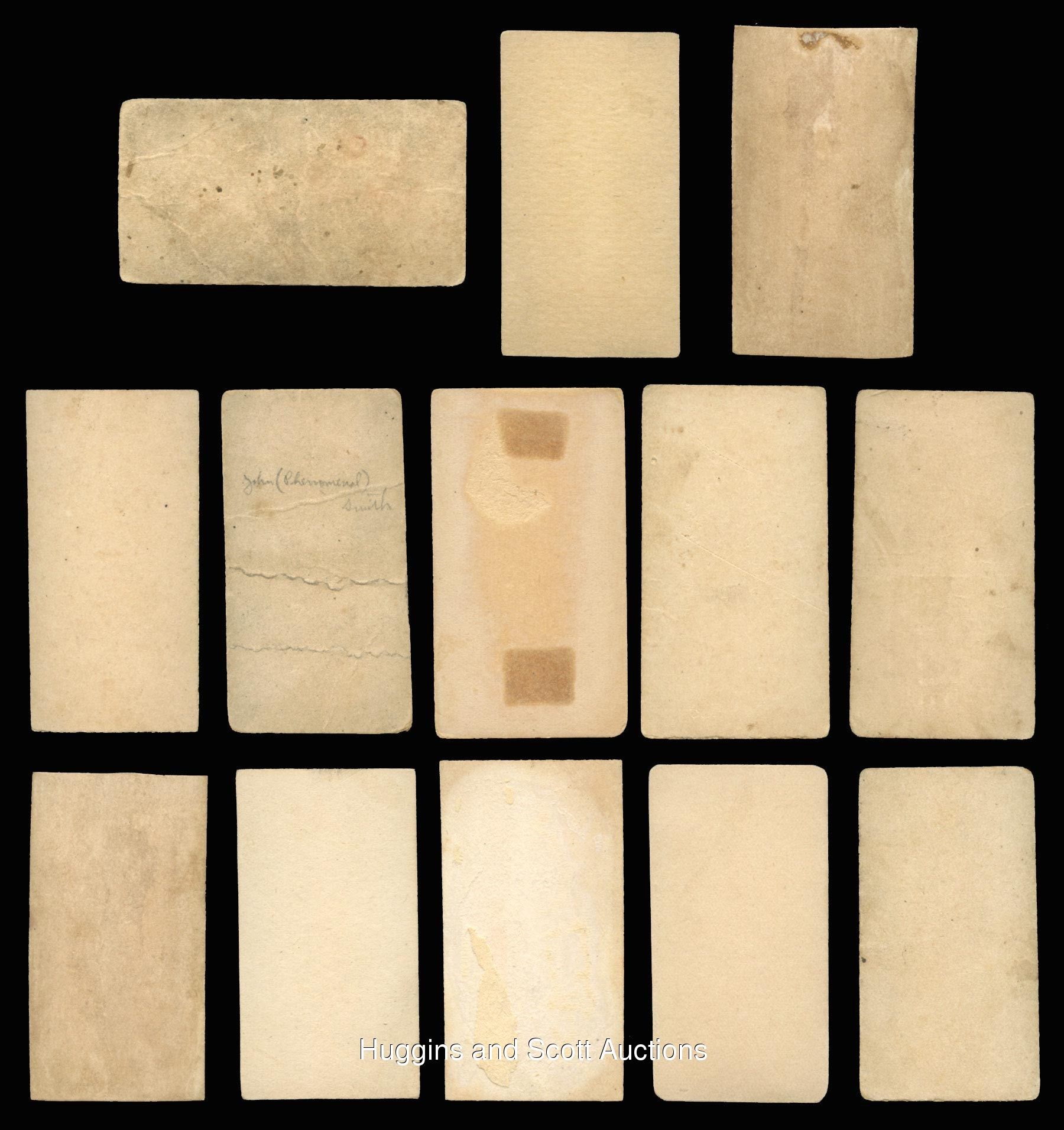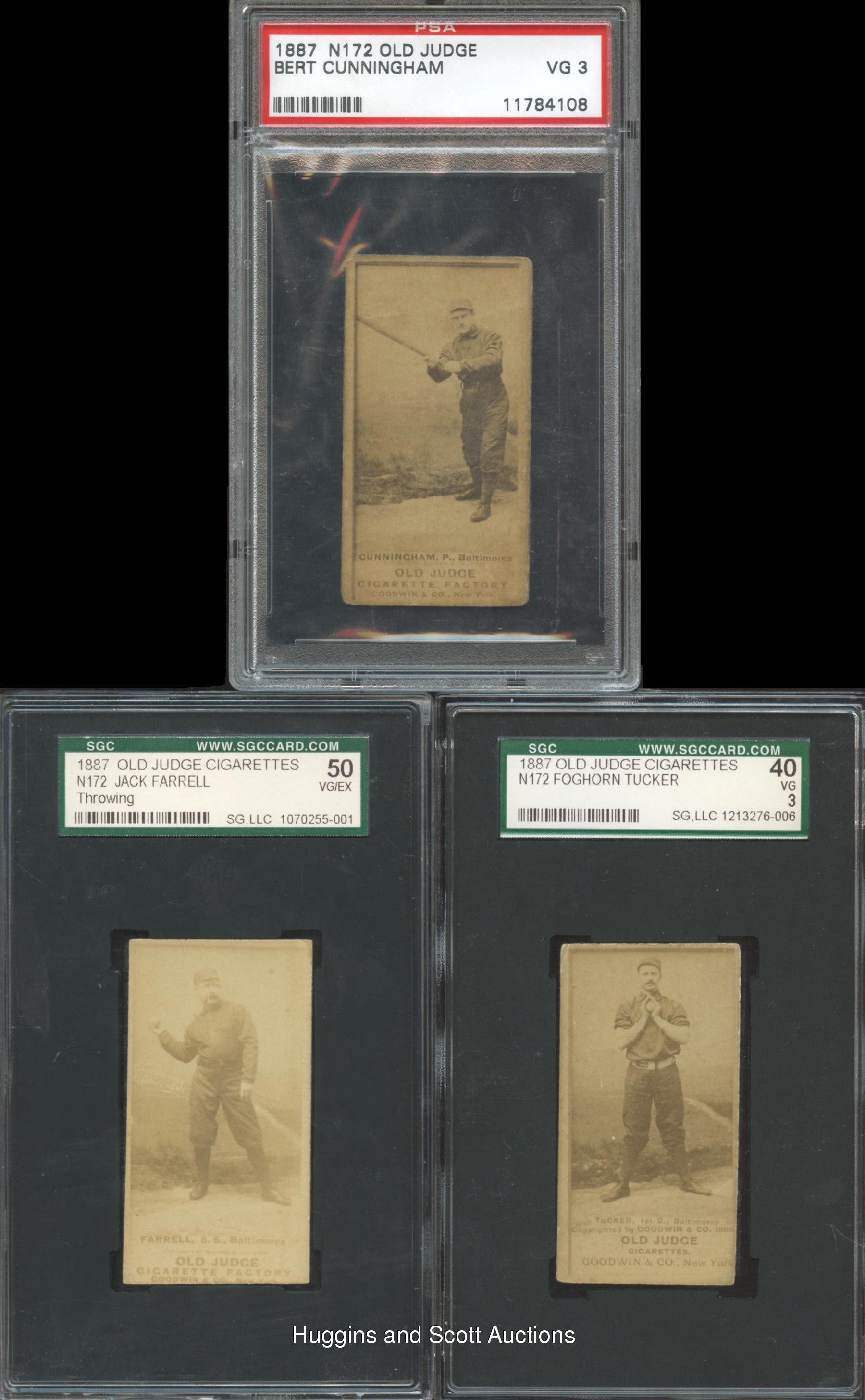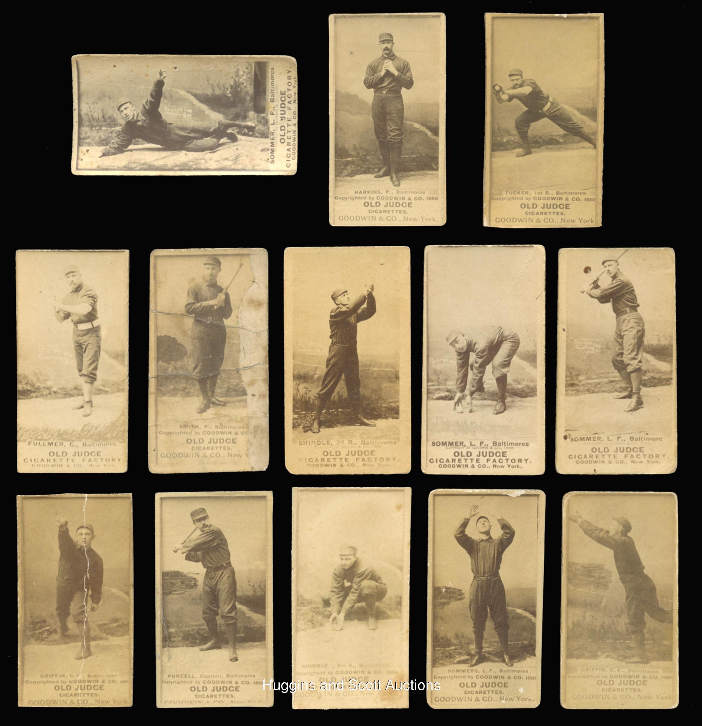 Catch a flock of “early birds” with these (16) 1887-1890 N172 Old Judge Baltimore Orioles singles including (3) graded. Each relic comes with a different pose. Included are: Cunningham (PSA 3), J. Farrell (SGC 50, Throwing), Fullmer (trimmed), (2) Griffin (both trimmed), Harkins (trimmed), Purcell (trimmed), (2) Shindle (one VG, one trimmed), Smith (PR, writing), (4) Sommer ((2) VG, one horizontal poses is PR with pinhole and re-backed, one trimmed) and (2) Tucker (one SGC 40, one trimmed). More on our website. Due to rudimentary factory printing techniques of the age, moderate size variances are present.