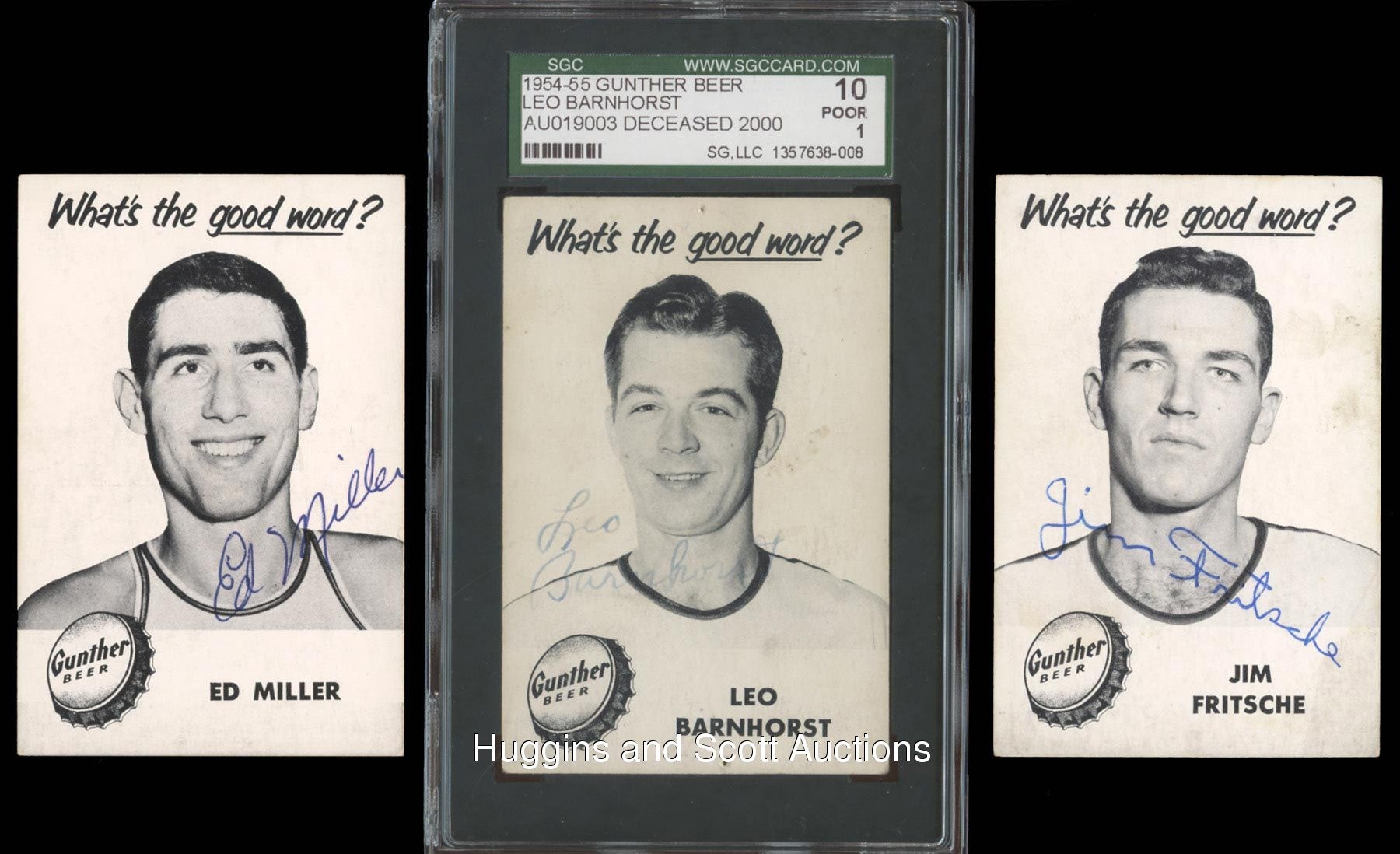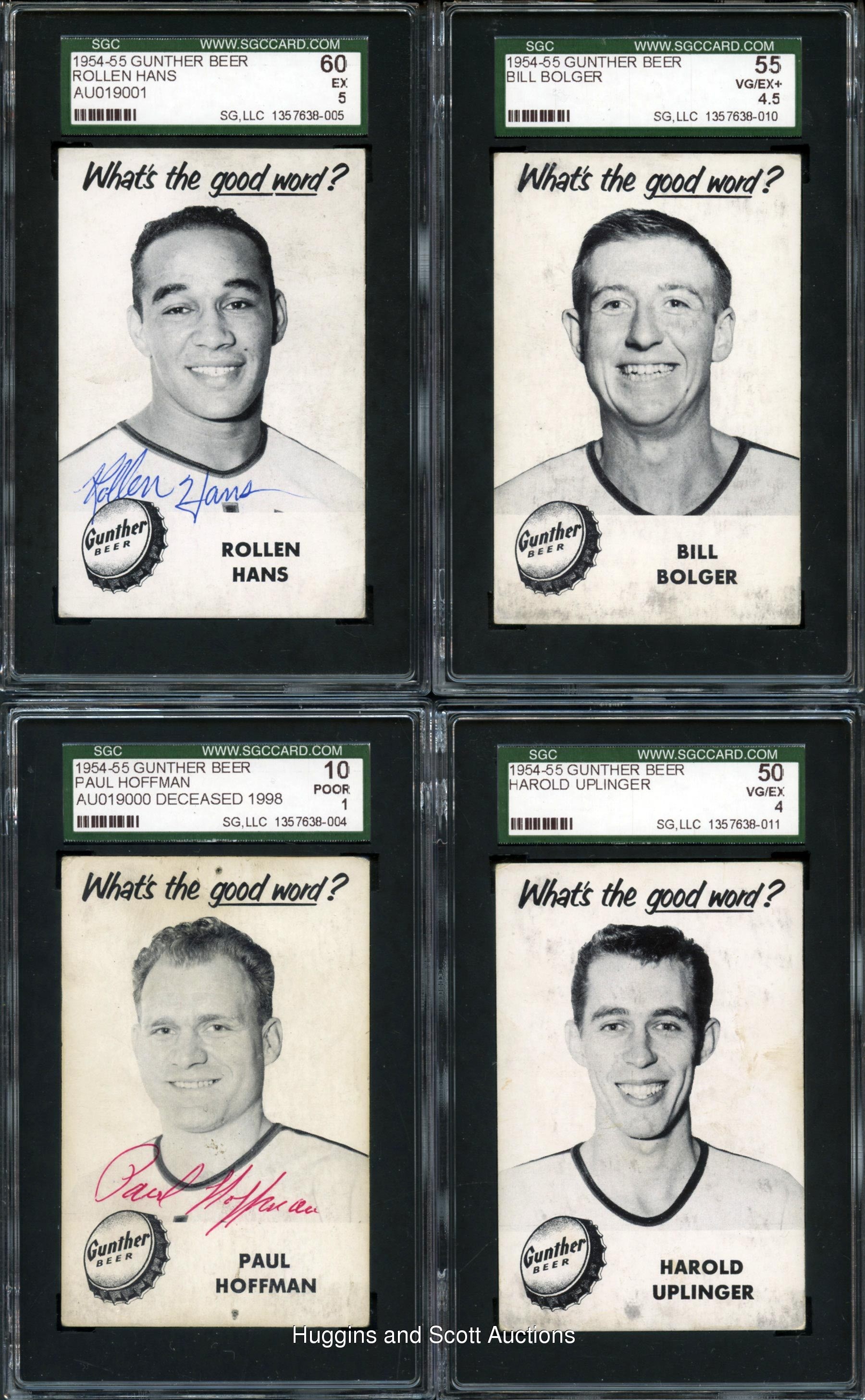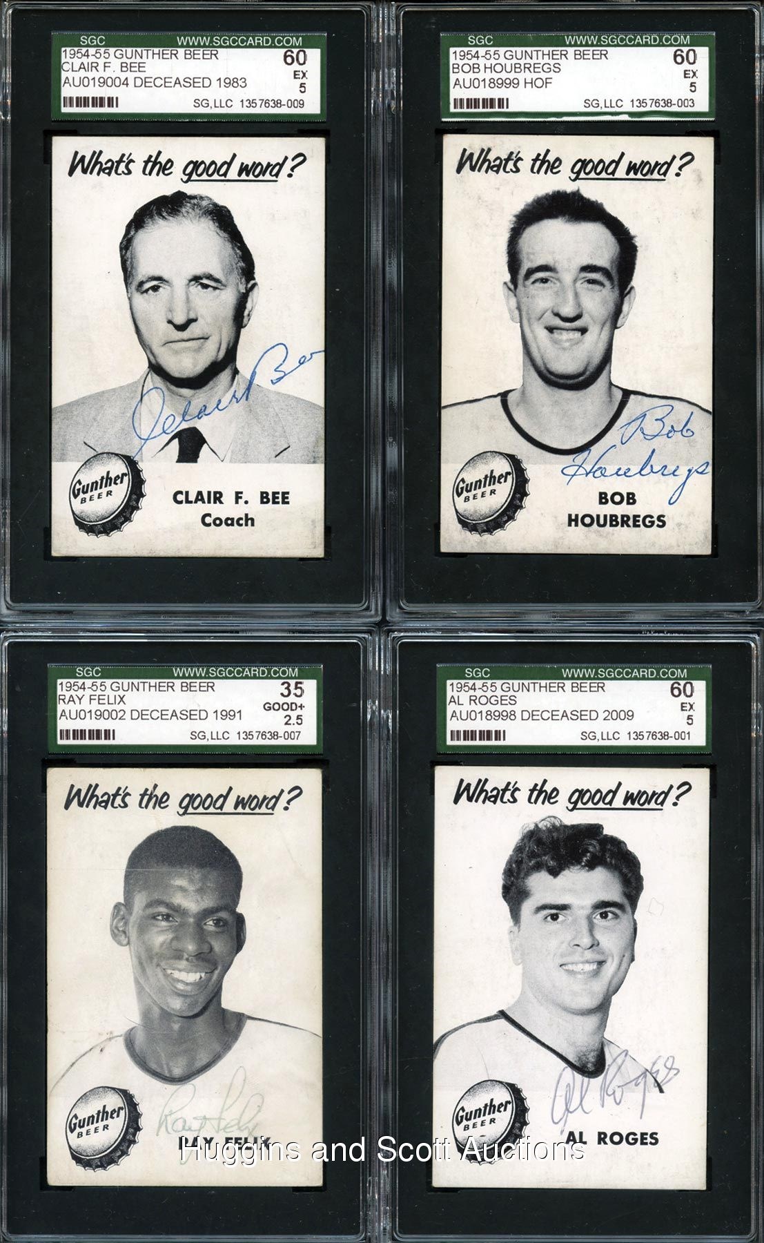Charm City sports fans of the 1950s were treated to the offered 1954-55 Gunther Beer Baltimore Bullets complete set of (11) cards, nine of which are graded by SGC. With a population of two or less per each card, this series will draw considerable interest from those early basketball historians with an eye for the obscure. Interestingly, nine cards are signed with the scripts averaging ("7") potency. Unless noted, each card is autographed. Included are SGC 60: (4 cards) with Bee, Han, Houbregs (Hall of Famer), Roges; SGC 55: Bolger (unsigned); SGC 50: Uplinger (unsigned); SGC 35: Felix; SGC 10: (2 cards) with Barnhorst, Hoffman; Ungraded: (2 cards, ungraded due to lack of autograph exemplars) with Fritsche (card presents VG) and E. Miller (card presents VG-EX).