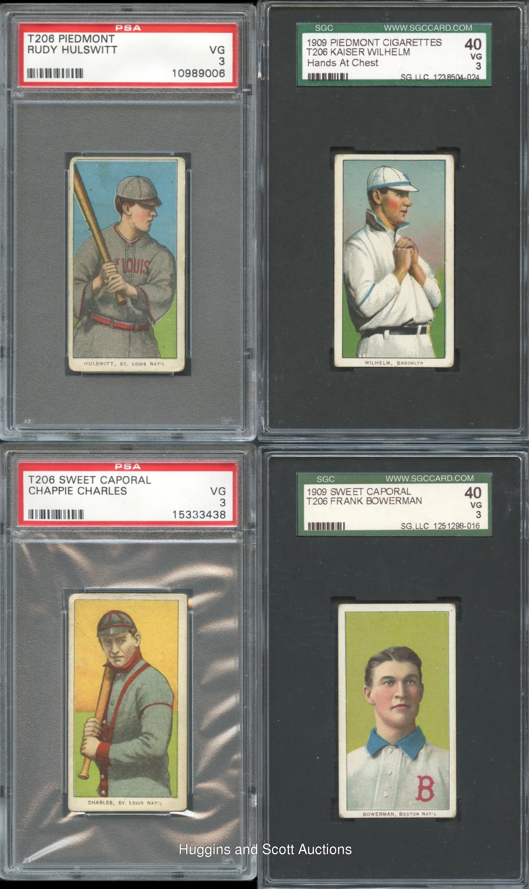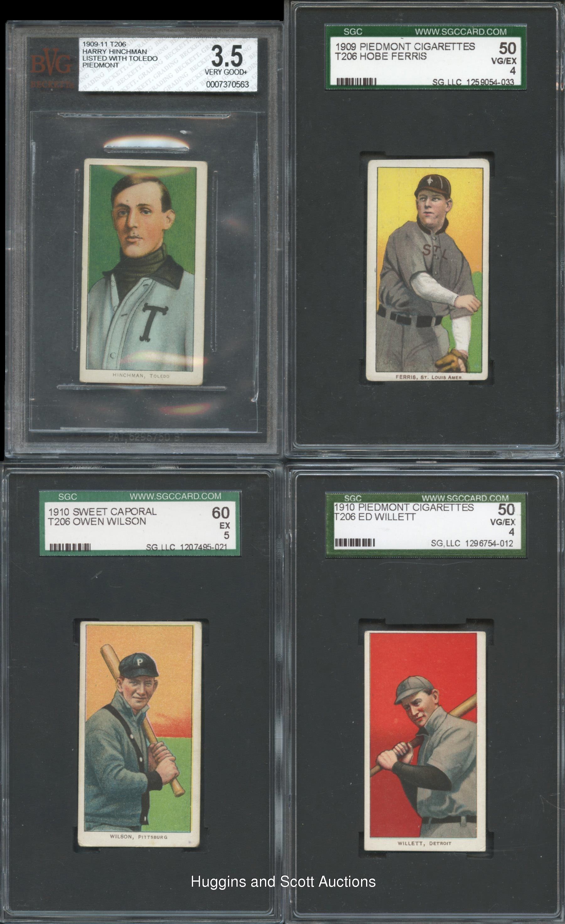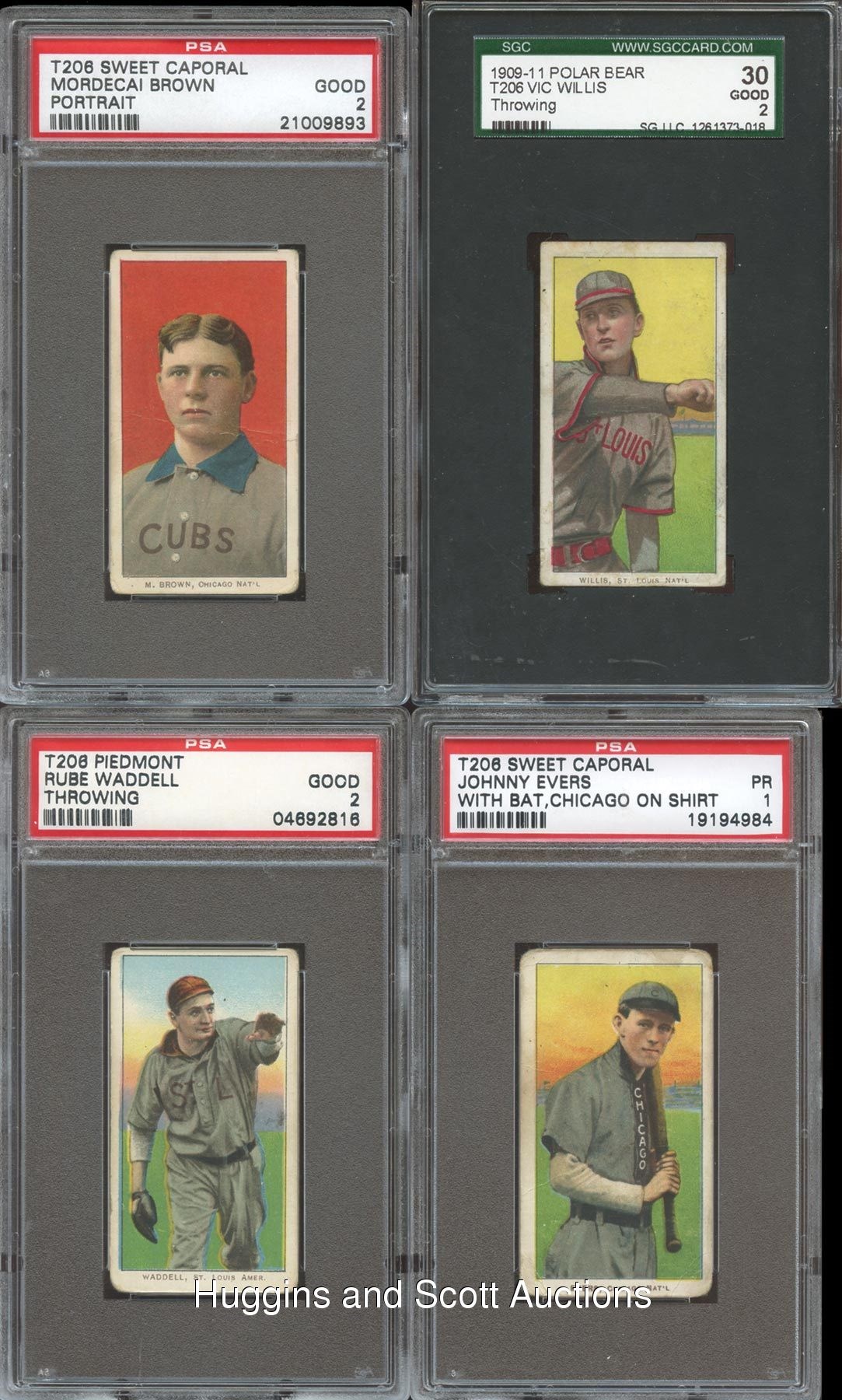Climb the “The Monster” with these (65) 1909-11 T206 White Border singles featuring (40) graded cards including a quartet of Hall of Famers. Unless noted, each artifact displays a common advertising reverse. Included are SGC: (23 cards) with (1) SGC 60, (2) SGC 50, (4) SGC 40, (11) SGC 30: Willis (Throwing, Polar Bear); (3) SGC 20, (2) SGC 10; PSA: (14 cards) with (5) PSA 3, (2) PSA 2.5, (5) PSA 2: M. Brown (Portrait), Waddell (Throwing); (2) PSA 1: Evers (with Bat, Chicago on Shirt); BVG: (2 cards) with (1) BVG 3.5, (1) BVG 1; GAI: (1) GAI 3.5 and Ungraded: (25 cards, with 32% VG to VG-EX, 60% GD, 8% FR or lesser due to paper loss/residue, all common backs) with exception to H. Smith (VG, Sovereign 460). More on our website. SGC 60: Wilson; SGC 50: (2 cards) with Ferris, Willett; BVG 3.5: H. Hinchman; GAI 3.5: McIntyre (Brooklyn & Chicago Nat’l); PSA 3: (5 cards) with Camnitz (Hands Over Head), Charles, Hulswitt, D. Miller (mk), Pastorius (mk); SGC 40: (4 cards) with Bowerman, Jo. Dunn, Ferguson, Wilhelm (Hands at Chest); PSA 2.5: (2 cards) with D. Jones. T. Jones; BVG 2: Oldring (Fielding); PSA 2: (5 cards) with M. Brown (Portrait), J. Clark, Leifield (Pitching), M. Mitchell, Waddell (Throwing); SGC 30: (11 cards) with Bescher (Portrait), Clancy, Cross, H. Davis (No Initial), Donlin (with Bat), F. Jones (Hands at Hips), Pfeister (Throwing), Ritchey, Strang, Willis (Throwing, Polar Bear), I. Young; SGC 20: (3 cards) with Abbott, Schlei (Batting), Steinfeldt (with Bat); PSA 1: (2 cards) with Bates, Evers (with Bat, Chicago on Shirt); SGC 10: (2 cards) with F. Smith, Malarkey; Ungraded: (25 cards, with 32% VG to VG-EX, 60% GD, 8% FR or lesser due to paper loss/residue, all common backs, unless noted) with Beaumont, Camnitz (Arms Folded), Delehanty, Davore, Donovan (Portrait), Egan, Evans, Fletcher, Grimshaw, Hunter, Killian (Pitching), Killian (Portrait), Knabe, Manning (GD, Batting), Marshall, M. McIntyre (Portrait), Mullin (GD, Throwing), Pelty (Vertical), Ritter, Rossman, Schlafly, H. Smith (VG, Sovereign 460), Snodgrass (Batting), Summers, Warhop
