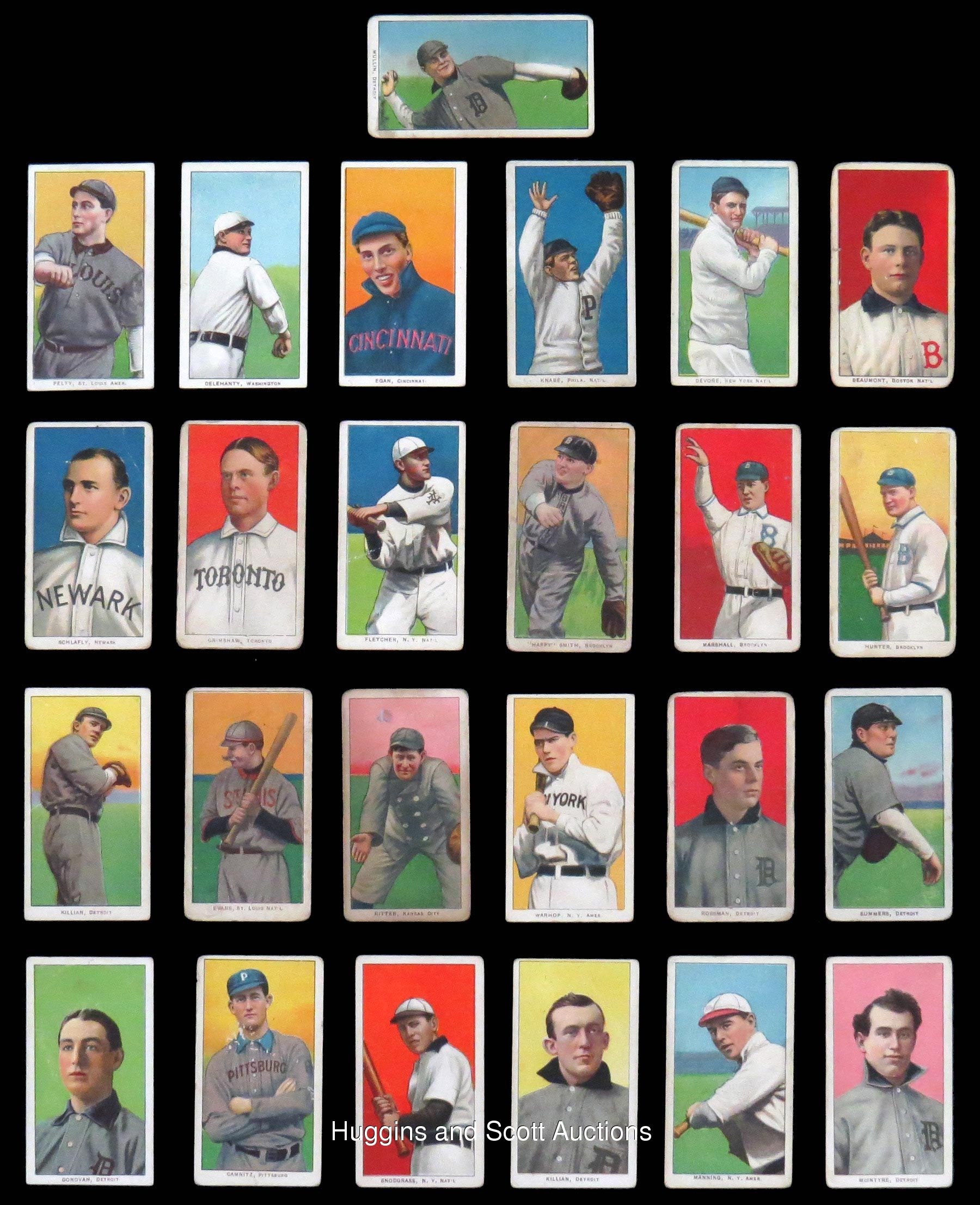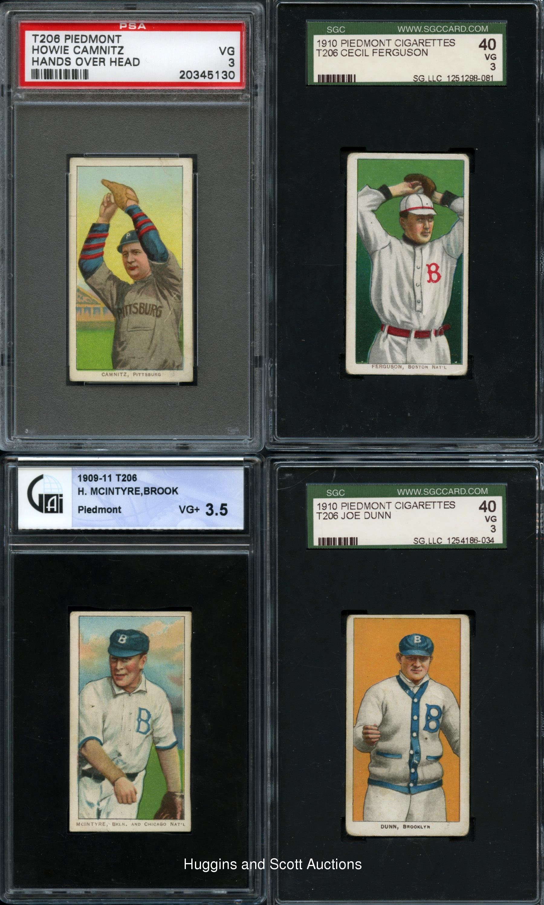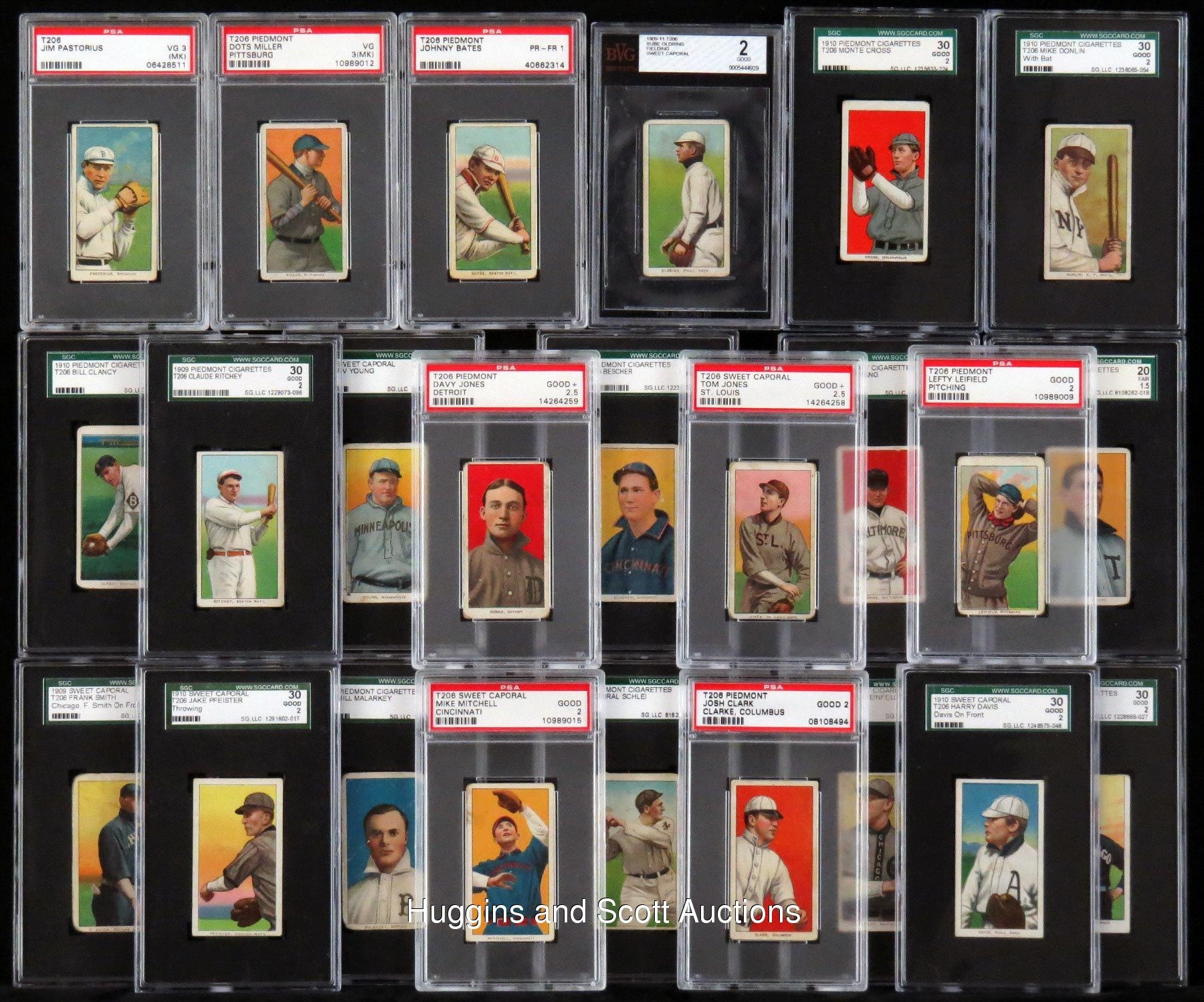 Climb the “The Monster” with these (65) 1909-11 T206 White Border singles featuring (40) graded cards including a quartet of Hall of Famers. Unless noted, each artifact displays a common advertising reverse. Included are SGC: (23 cards) with (1) SGC 60, (2) SGC 50, (4) SGC 40, (11) SGC 30: Willis (Throwing, Polar Bear); (3) SGC 20, (2) SGC 10; PSA: (14 cards) with (5) PSA 3, (2) PSA 2.5, (5) PSA 2: M. Brown (Portrait), Waddell (Throwing); (2) PSA 1: Evers (with Bat, Chicago on Shirt); BVG: (2 cards) with (1) BVG 3.5, (1) BVG 1; GAI: (1) GAI 3.5 and Ungraded: (25 cards, with 32% VG to VG-EX, 60% GD, 8% FR or lesser due to paper loss/residue, all common backs) with exception to H. Smith (VG, Sovereign 460). More on our website. SGC 60: Wilson; SGC 50: (2 cards) with Ferris, Willett; BVG 3.5: H. Hinchman; GAI 3.5: McIntyre (Brooklyn & Chicago Nat’l); PSA 3: (5 cards) with Camnitz (Hands Over Head), Charles, Hulswitt, D. Miller (mk), Pastorius (mk); SGC 40: (4 cards) with Bowerman, Jo. Dunn, Ferguson, Wilhelm (Hands at Chest); PSA 2.5: (2 cards) with D. Jones. T. Jones; BVG 2: Oldring (Fielding); PSA 2: (5 cards) with M. Brown (Portrait), J. Clark, Leifield (Pitching), M. Mitchell, Waddell (Throwing); SGC 30: (11 cards) with Bescher (Portrait), Clancy, Cross, H. Davis (No Initial), Donlin (with Bat), F. Jones (Hands at Hips), Pfeister (Throwing), Ritchey, Strang, Willis (Throwing, Polar Bear), I. Young; SGC 20: (3 cards) with Abbott, Schlei (Batting), Steinfeldt (with Bat); PSA 1: (2 cards) with Bates, Evers (with Bat, Chicago on Shirt); SGC 10: (2 cards) with F. Smith, Malarkey; Ungraded: (25 cards, with 32% VG to VG-EX, 60% GD, 8% FR or lesser due to paper loss/residue, all common backs, unless noted) with Beaumont, Camnitz (Arms Folded), Delehanty, Davore, Donovan (Portrait), Egan, Evans, Fletcher, Grimshaw, Hunter, Killian (Pitching), Killian (Portrait), Knabe, Manning (GD, Batting), Marshall, M. McIntyre (Portrait), Mullin (GD, Throwing), Pelty (Vertical), Ritter, Rossman, Schlafly, H. Smith (VG, Sovereign 460), Snodgrass (Batting), Summers, Warhop