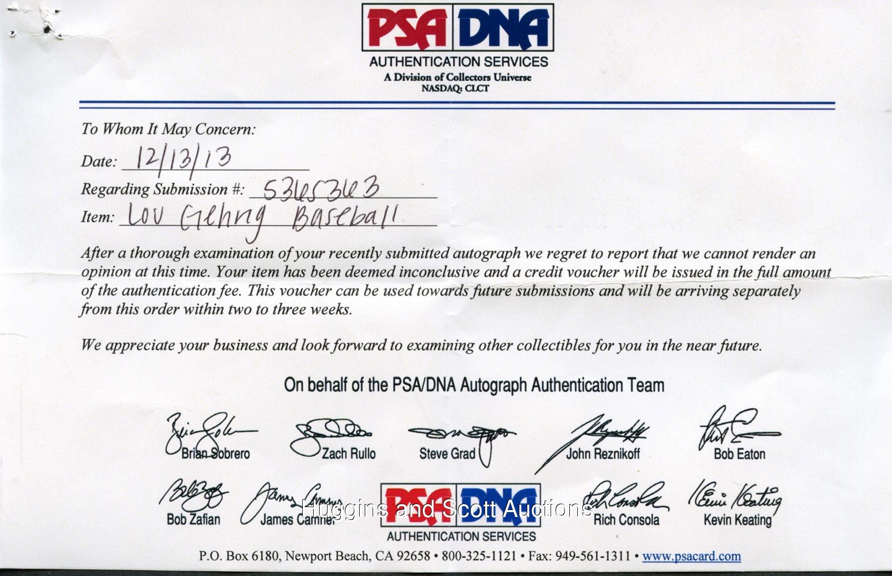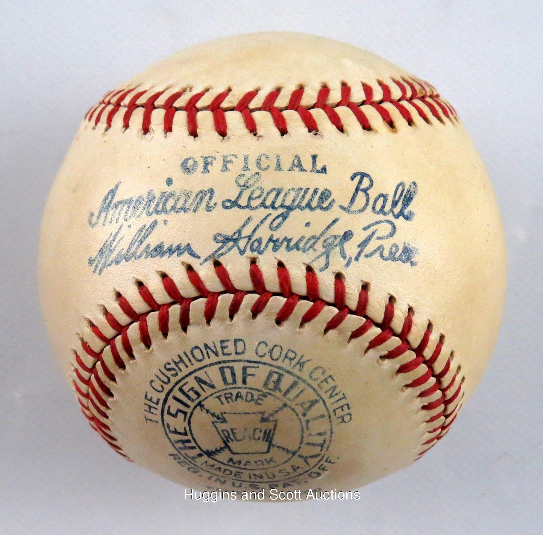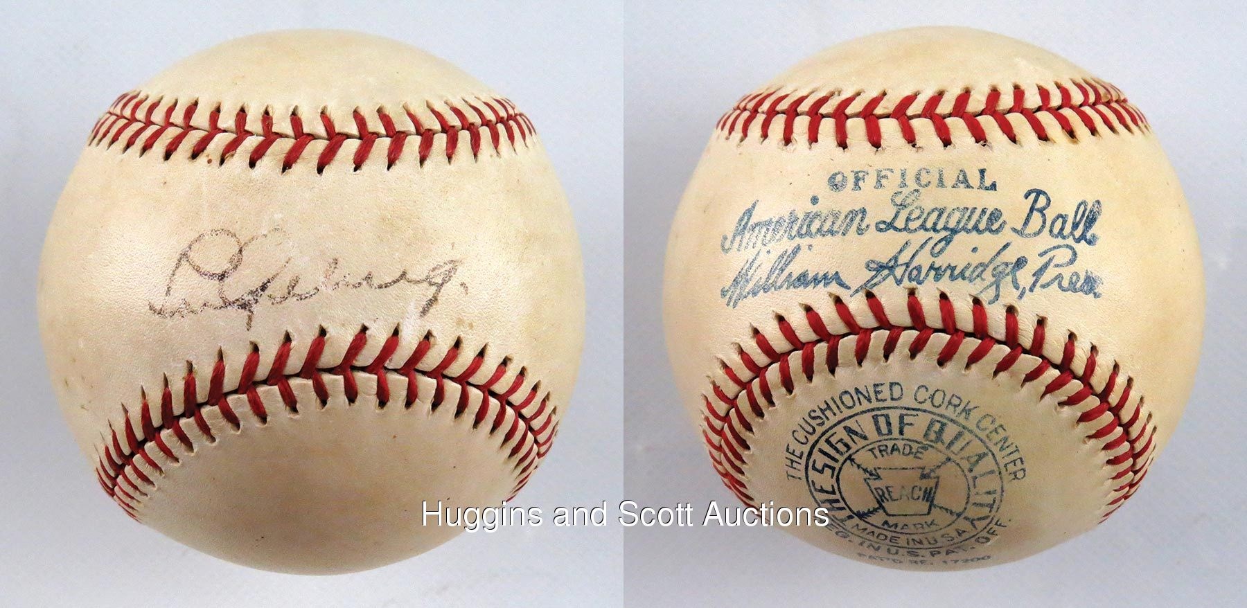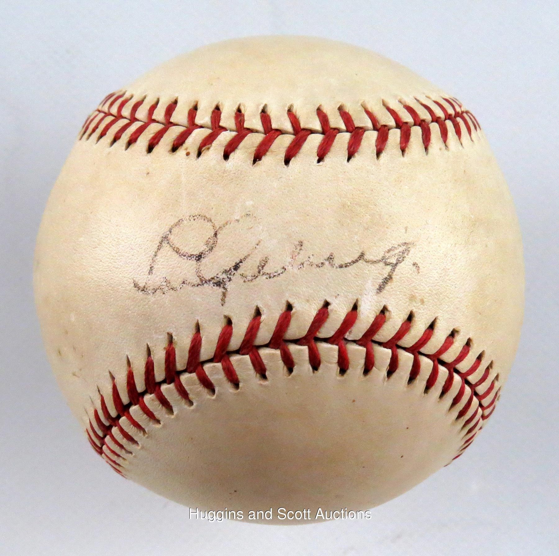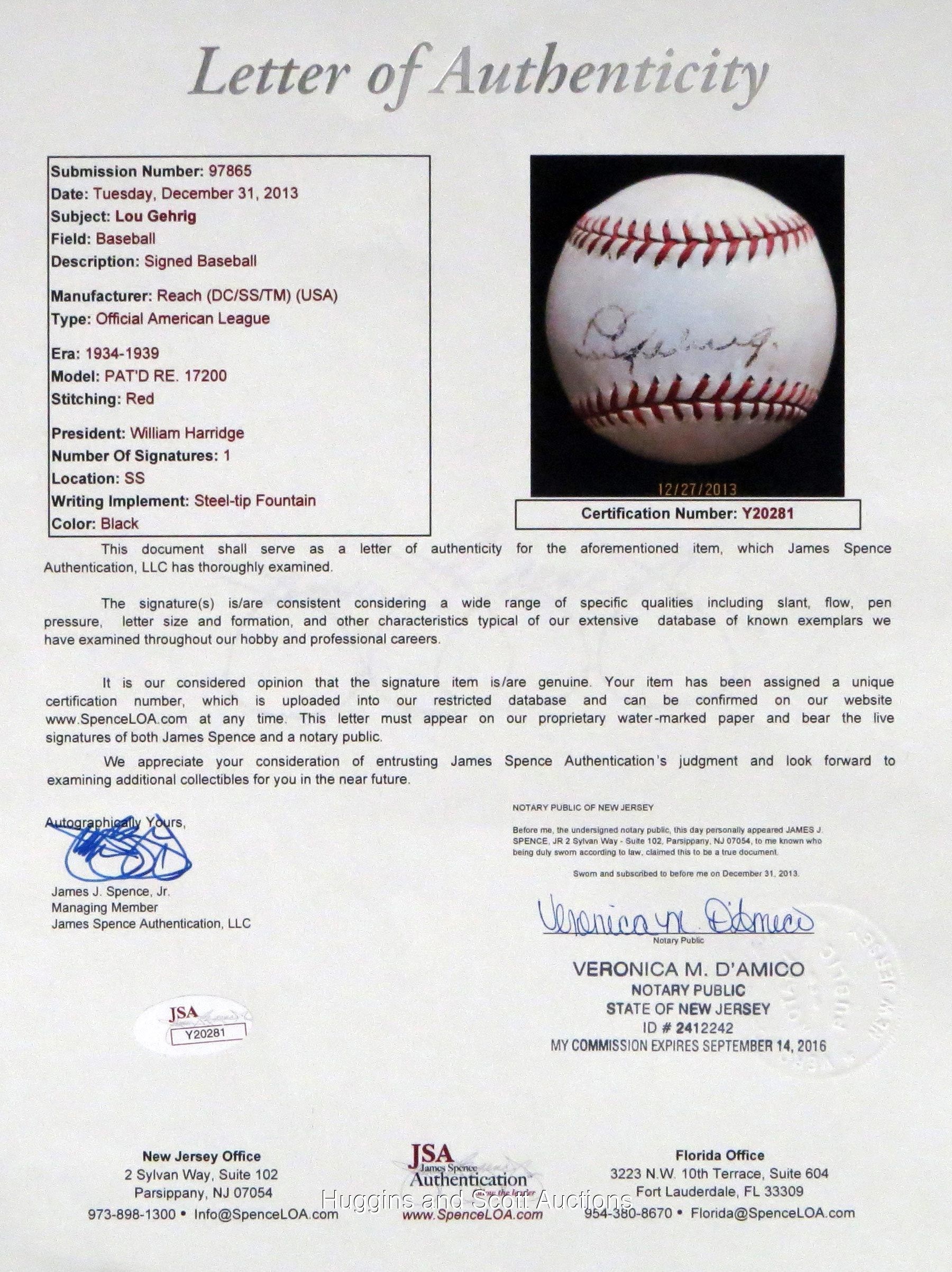 Endless accounts cite Lou Gehrig’s humble demeanor, tireless work ethic and loyalties to both team and family. As trite and storybook as these qualities (especially the combination thereof) may seem, there is no refuting their validity. Often overlooked are the impressive numbers that defined a career perhaps unlike any other. While Gehrig’s contemporaries were naturally inclined to wax poetic in recounting the quiet superstar and his selfless manner, his astounding numbers are (well, at least “were”) even more obscured in that they were realized in the sizable shadow of teammate Babe Ruth. And as we cross from the diamond into the realm of collectibles, the situation is the same. Despite statistics often favoring Gehrig, Ruth’s admirers could seem tenfold to the amount of fans seeking a handshake or an autograph from any other player. Gehrig remained compliant with autograph requests despite the fact that most were rendered on side panels, usually complementing a Ruth signature. This particular example is a rare departure, with Gehrig deservedly occupying the sweet spot of a ball that dates to the peak of his career and his tragic demise, as well.The medium is an OAL Harridge ball (grade “6”) with bright-red laces and vibrant trademark stampings that date to 1934-1939. Executed on the sweet spot in black-ink steel tip fountain pen, Gehrig’s flowing signature projects (“5-6”) strength and clarity, with brief interruptions preventing higher assessment. Reflecting his unassuming qualities, Gehrig’s signature remained consistently small. The penmanship itself is elegant with curvaceous upper-case “L” and “G” characters followed by remarkably even finishes of the first name and surname, respectively. Gehrig sweet spot pennings are fleeting indeed, as many of his signatures are found on multi-signed spheres with the sweet spot almost always reserved for Ruth.The ball’s appealing status as a Gehrig single-signed keepsake is consistent with the prominent trademark stampings. The keepsake definitively dates to 1934-1939, a span whose beginning marked the final season of Gehrig and the aging Ruth in the same lineup. The end of that timeline, of course, coincided with Gehrig’s mysterious and sudden decline and subsequent fatal diagnosis. In between, however, he was the face of a franchise on its way to an unprecedented four successive World Series titles. And while another phenom (Joe DiMaggio) came along after Ruth’s departure, Gehrig maintained a quiet reserve and steady performance. Consider: in the 10 full seasons during which Gehrig and Ruth were teammates, Gehrig out-hit Ruth seven times and had a higher RBI total seven times, as well. Following Ruth’s Bronx tenure, Gehrig remained consistent and spectacular, winning the team Triple Crown in 1935, two-thirds of it (home runs and RBI) in 1936 and hit a team-high .354 in 1937, all the while yielding to more flamboyant (or at least more vocal) teammates as they basked in the spotlight.As Gehrig single-signed orbs go, this one has few rivals in the scarce population. Accompanying is a full photo LOA from JSA, as well as a letter documenting the ball’s lineage. Please note: we also submitted this ball to PSA for grading and encapsulation. They returned the ball with a letter stating: "At this time, we are unable to render an opinion."Handwritten in graphite pencil, the accompanying letter of provenance reads (in full):”My husband’s father was very European, autocratic with his son an (sic) only child. His father did not spend time with him, pay attention to him or talk to him. It was a very quiet household. My husband Joe rarely talks about his father. I knew his father went to the baseball game. I assumed he had taken his son as fathers everywhere do. My dad took me and I was a girl.Joe was in grade school. His mother was having a party in the back yard. It was early evening. Joe’s father returned from the ball game with his brother-in-law, Joe’s uncle Roy, a baseball fanatic his entire life. For vacation every year he and his wife went to the World Series. When he retired, he ushered at the stadium. Joe’s father showed his signed Lou Gehrig baseball to everyone at the party, including his son.Joe was sent to bed. Nothing was said about the ball the next day. Joe did not see it again.Joe graduated from high school. He and his best friend wanted to go to college, but they didn’t have the money. They decided to join the army so they could go to college on the G.I. bill. They would get through it together. Of course, they were separated immediately.Joe was sent with the occupation troops to Italy. He served his time and received his honorable discharge.When Joe returned home, he walked into his bedroom, and there was the Lou Gehrig baseball placed on top of his bureau. L.G. now belonged to him.”