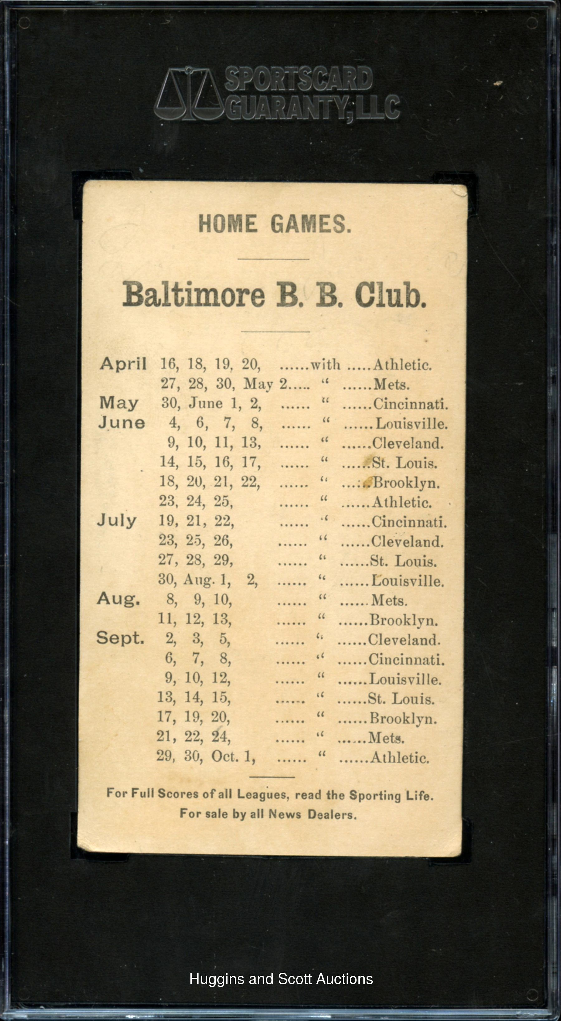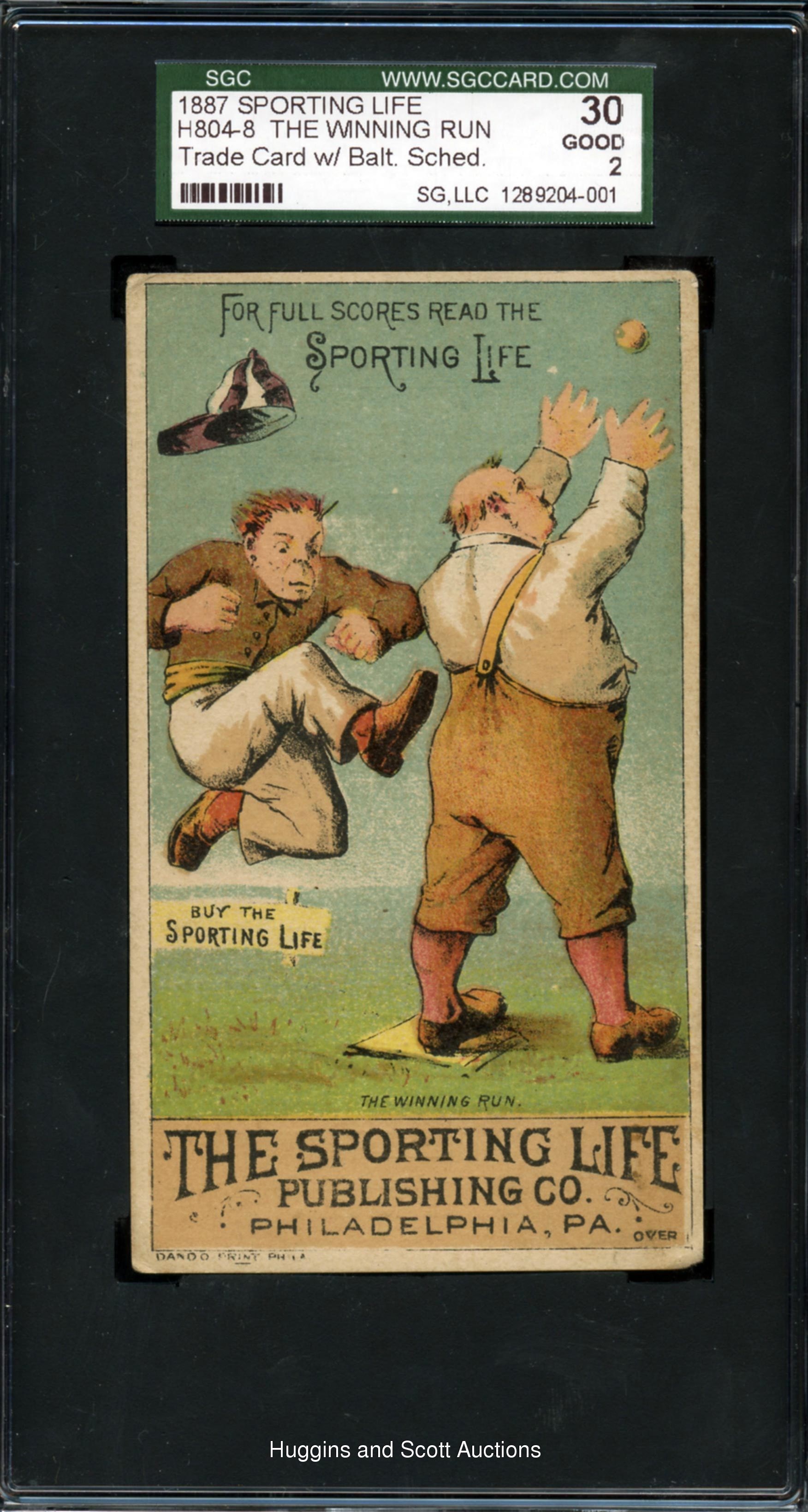 Graded 30 Good 2 by SGC. Featured is an 1887 H804-8 Sporting Life trade card with a Baltimore schedule reverse. The "Winning Run" caption presents quite nicely for the technical assessment with amusing nineteenth century illustrations and vibrant surface color schemes. The reverse is absent of any paper loss or writing.