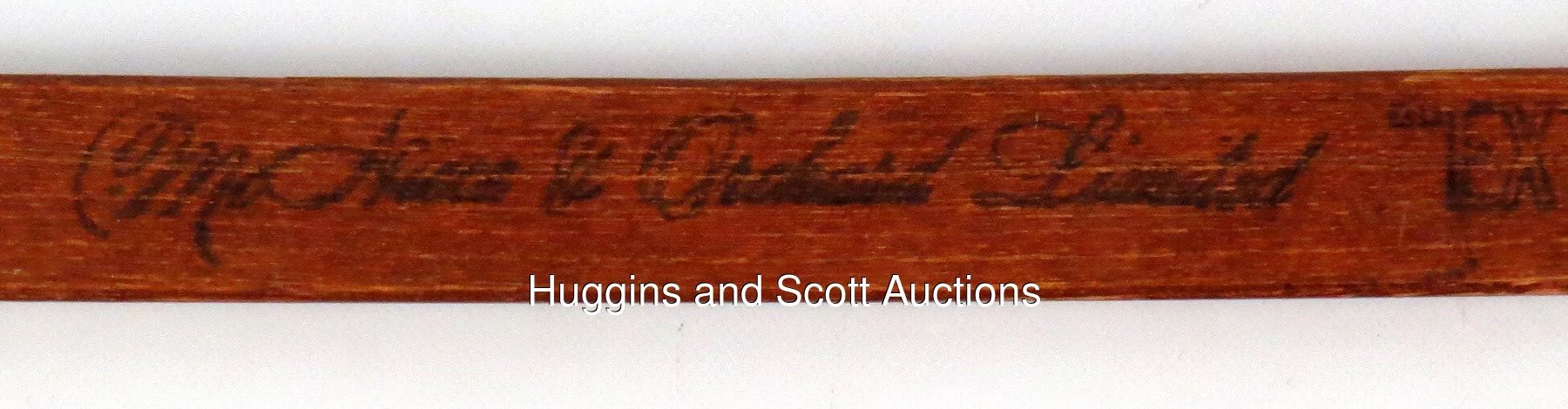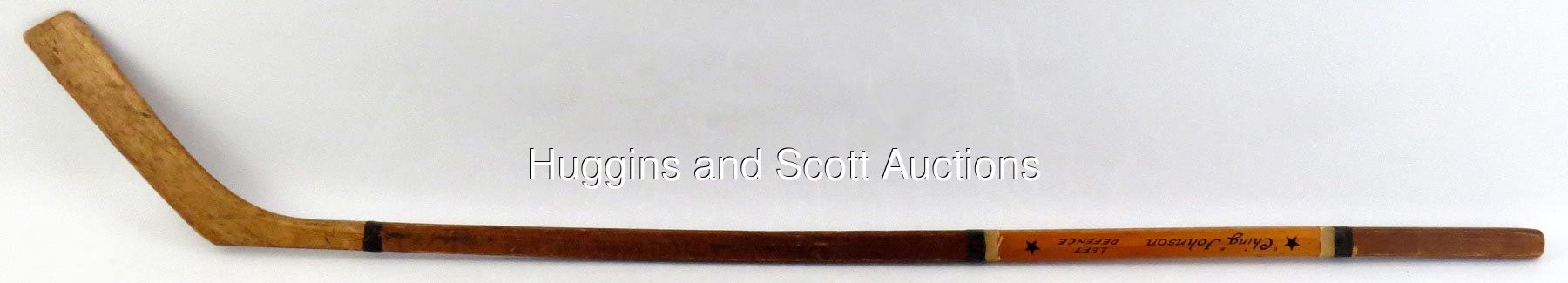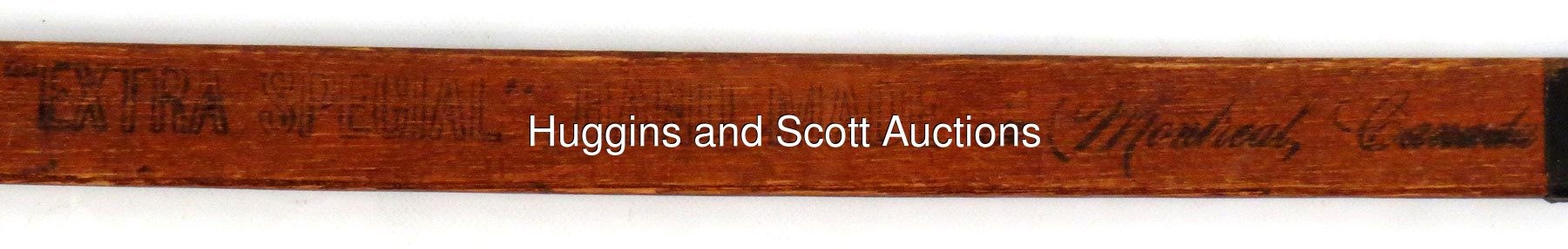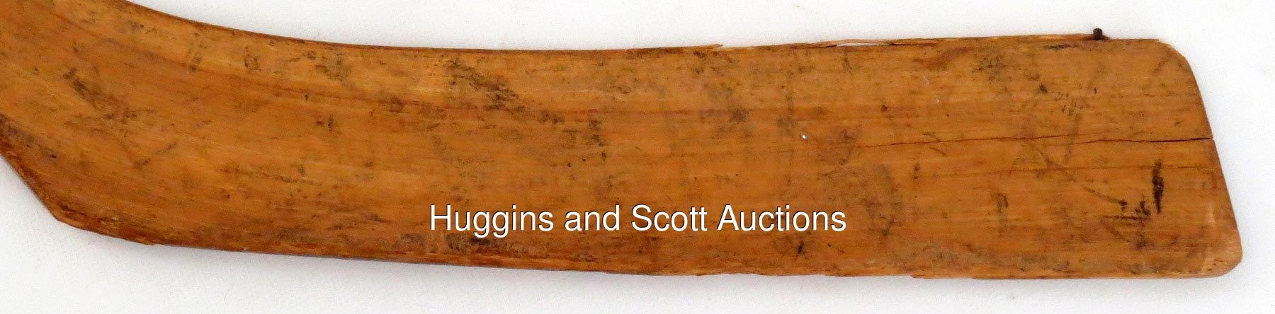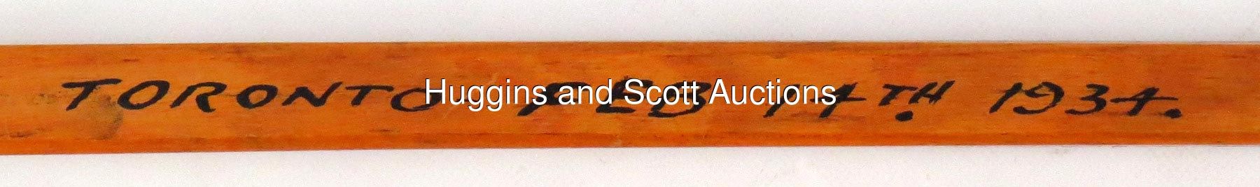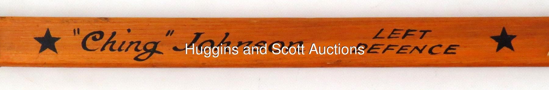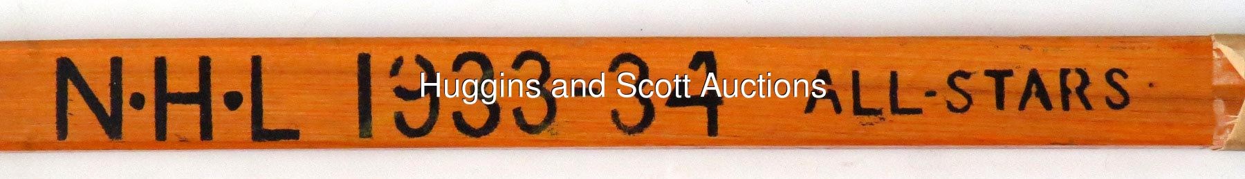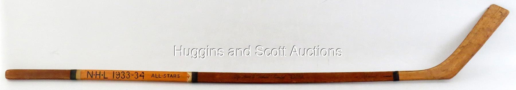 NOTE: This description has been modified from the printed catalog to reflect that we received information (thanks Brent) that the portion on the shaft that we could not identify says: "McNiece and Orchard Limited". They were an early manufacturer from Montreal. From an era that pre-dated annual all-star exhibitions and marked the origins for one of the revered “Original 6” franchises, this hockey stick represents one of the sport’s earliest and historically significant game-used relics! Issued to Toronto Maple Leafs defenceman Ivan “Ching” Johnson, this 1933-34 N.H.L. All-Stars stick was used in the February 14, 1934 exhibition that pre-dated the league’s first formal All-Star Game by 13 years. A World War I veteran, Johnson was affectionately dubbed “Ivan the Terrible” and eventually, “Ching” as an abbreviated version of “Ching Ching Chinaman” (though of Irish descent, the ever-smiling Johnson was said to have Asian features). On the ice for the first-ever New York Rangers game (November 26, 1926), Johnson remained with the club for 11 seasons. As for the offered stick and its event, Toronto Maple Leafs right winger Ace Bailey suffered a career-ending injury during a December 13, 1933 contest. In an effort to raise money for Bailey’s family, the league scheduled an exhibition between the Maple Leafs and a team of NHL All-Stars from the remaining teams. Held at the Maple Leaf Gardens, the event was a success for both the hosts (Toronto won, 7-3) and the Bailey family, which received $20,909.40 in gate receipts. Wielded by Johnson that day, this vintage left-handed stick has a stenciled “N-H-L 1933-34 ALL-STARS” identifier near the top of the shaft, with “Ching Johnson – Left Defence” flanked by two stars on the opposite panel. Between those two panels, “Toronto FEB 14th 1934” is hand painted. On the shaft’s mid-portion, the manufacturer "McNiece and Orchard Limited" is written cursive characters precede “Extra Special Hand Made in Montreal, Canada.” The item shows solid game use with multiple puck and surface marks along the blade, as well as a small crack and a minor chip (long since secured with a vintage nail) at the outer edge of the blade. “Light the lamp” with this outstanding early example!