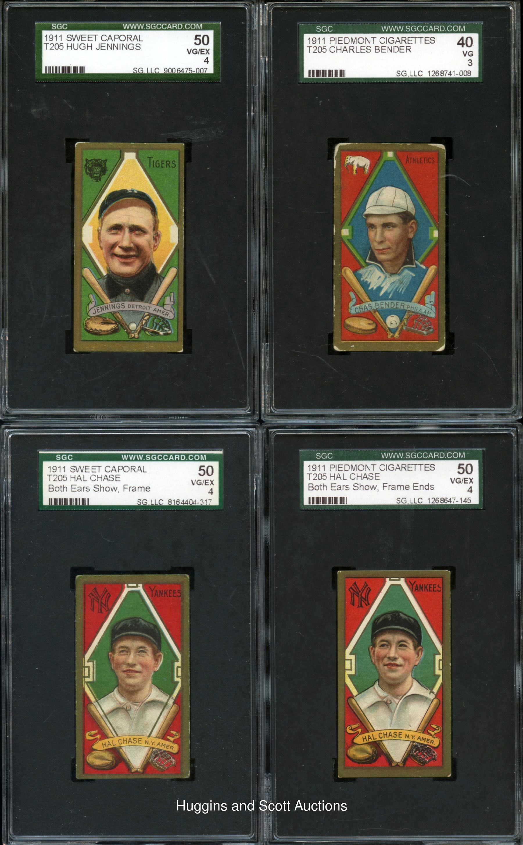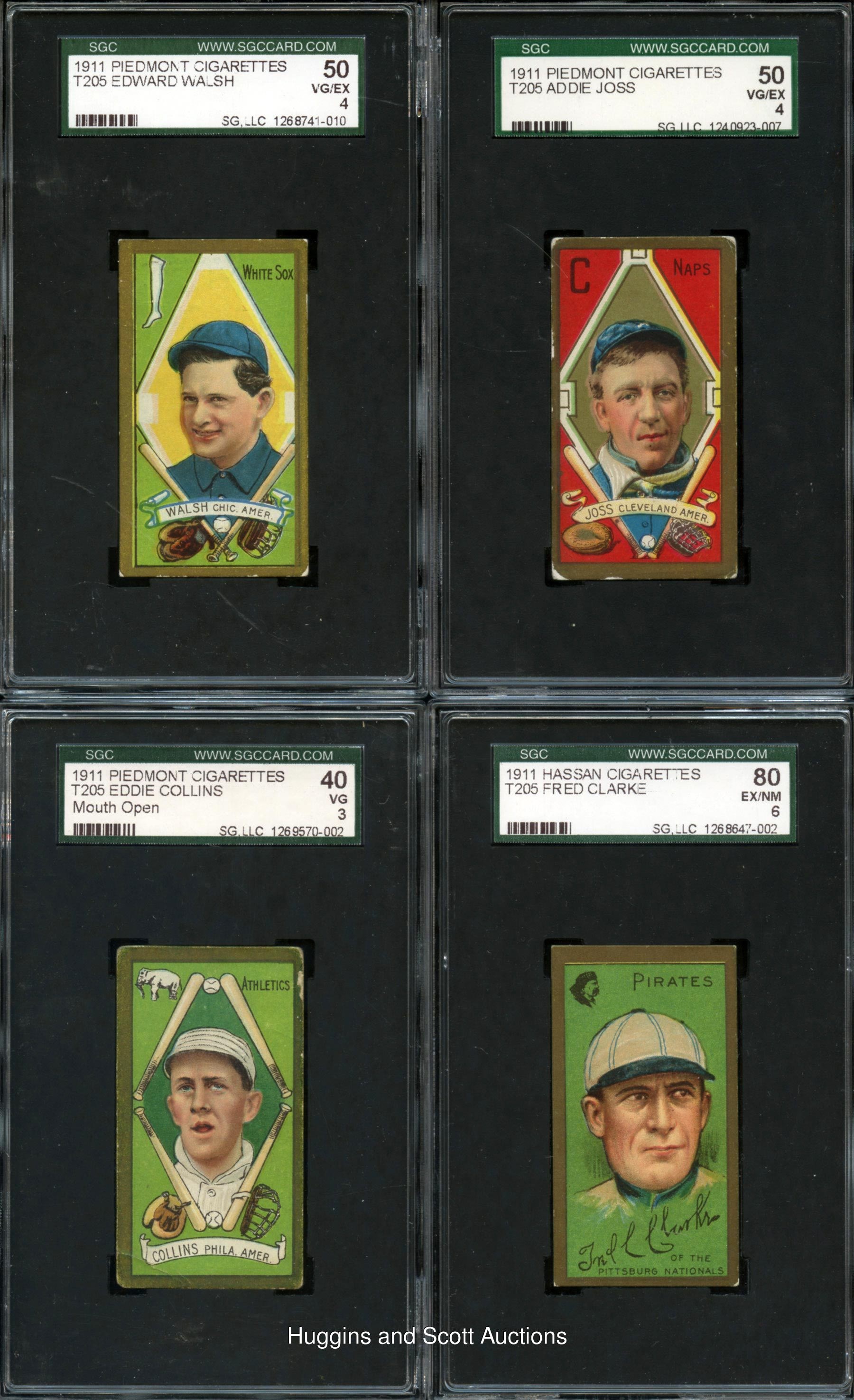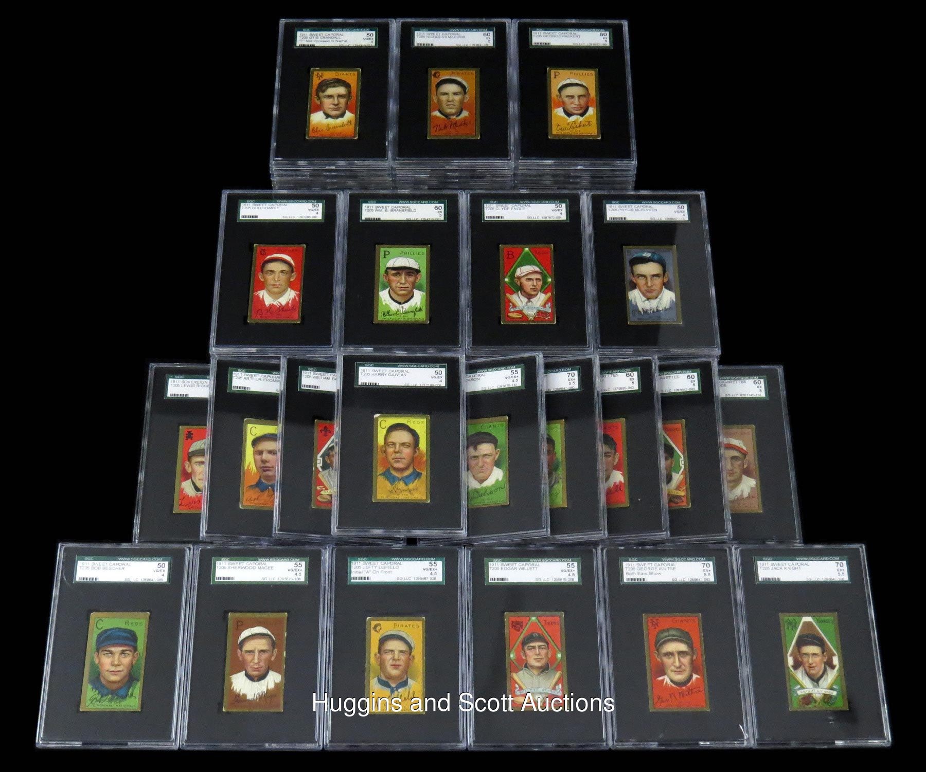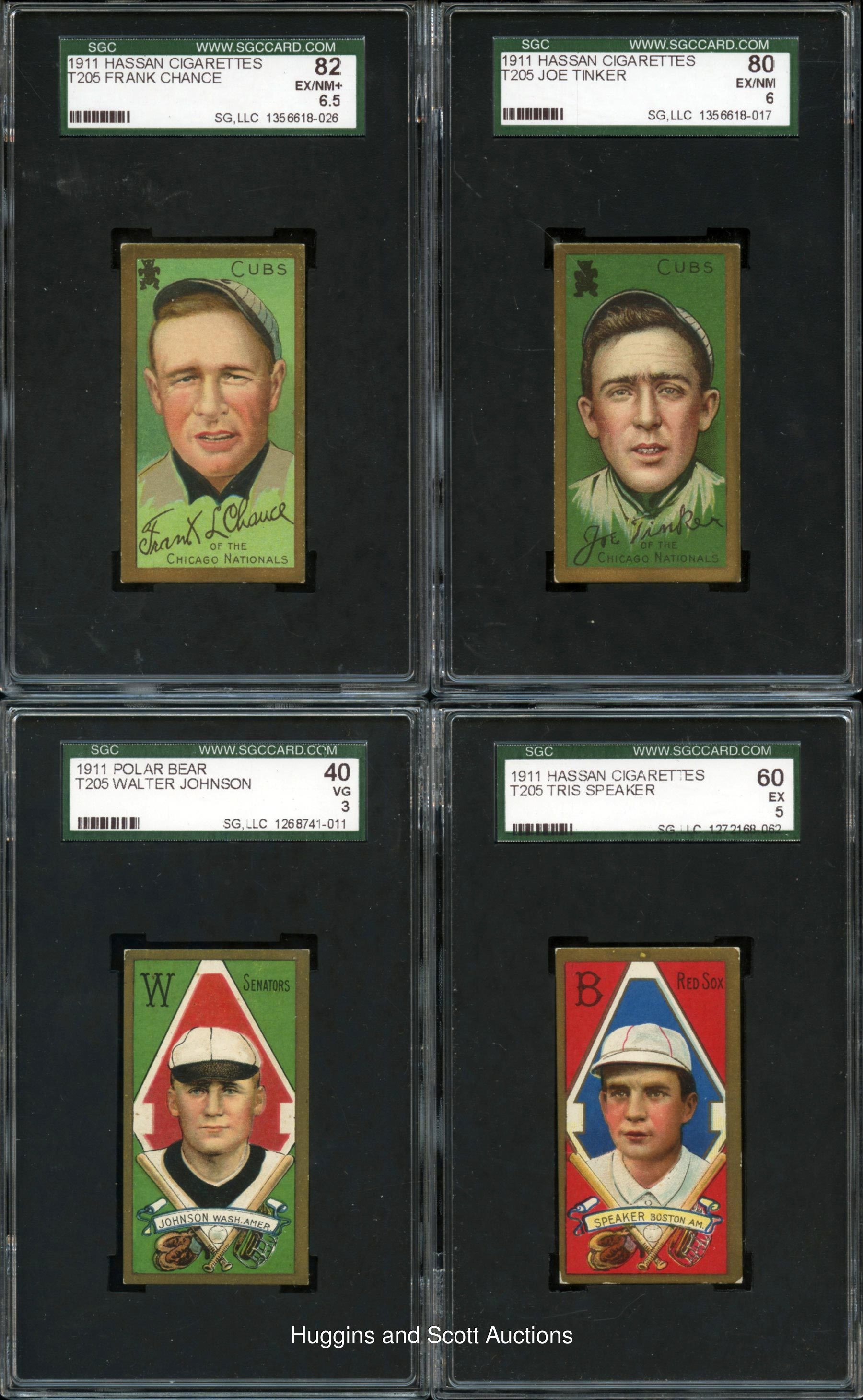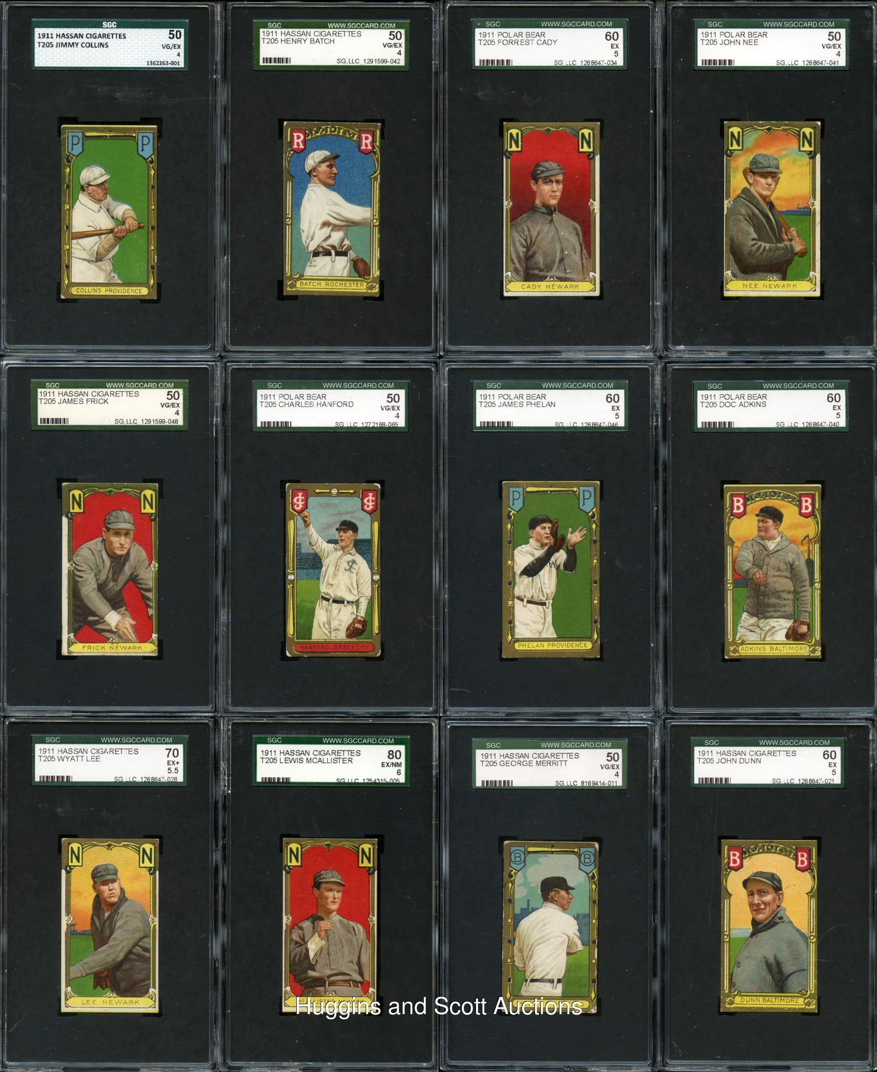 Extraordinary 1911 T205 Gold Borders near master set of (221/222) SGC graded cards. These century-old gilt treasures constitute a labor of love from our consignor who meticulously pieced together this fragile tobacco card series with an eye for quality. The result is an incredible proposition for the serious turn-of-the-century baseball card collector. With an average card grade of 55.96 the offered 1911 T205 Gold Borders near master set currently has the highest GPA for the designation evaluated by the grading service! Over 94% of the cards are judged 50 VG-EX 4 or better! The overall condition breakdown is as follows: (1) SGC 82, (11) SGC 80, (13) SGC 70, (83) SGC 60, (10) SGC 55, (90) SGC 50, (1) SGC 45, (9) SGC 40, (1) SGC 30, (1) SGC 20 and (1) SGC 20. Additionally, the advertising back composition includes: (79) Piedmont, (55) Sweet Caporal, (32) Hassan, (19) Polar Bear, (16) Honest Long Cut, (10) Cycle, (9) Sovereign and (1) American Beauty. Highlights include: Hall of Famers: (30 cards, all common backs, unless noted) with Baker (SGC 60), Bender (SGC 40), Bresnahan (SGC 80, Mouth Closed), Bresnahan (SGC 80, Mouth Open), M. Brown (SGC 50, Polar Bear), Chance (SGC 82), Clarke (SGC 80), Cobb (SGC 40), E. Collins (SGC 60, Mouth Closed), E. Collins (SGC 40, Mouth Open), J. Collins (SGC 50), Duffy (SGC 50), Evers (SGC 50), Griffith (SGC 60), Huggins (SGC 50, Cycle), Jennings (SGC 50), W. Johnson (SGC 40, Polar Bear), Joss (SGC 50), Marquard (SGC 50, Cycle), Mathewson (SGC 50), Mathewson (SGC 20, “37-1” Record, Cycle), McGraw (SGC 60, Polar Bear), Speaker (SGC 60), Tinker (SGC 80, 1 of 6, one better), Wallace (SGC 40, No Cap, One Line of 1910 Stats), Wallace (SGC 50, No Cap, Two Lines of 1910 Stats), Wallace (SGC 50, with Cap), Walsh (SGC 50), Wheat (SGC 50), C. Young (SGC 50); Non-Hall of Fame Minor Leaguers: (11 cards, all Hassan backs, unless noted) with Adkins (SGC 60, Polar Bear), Batch (SGC 50), Cady (SGC 60, Polar Bear), Dunn (SGC 60), Frick (SGC 50), Hanford (SGC 50, Polar Bear), Lee (SGC 70), McAllister (SGC 80), Merritt (SGC 50), Nee (SGC 50, Polar Bear), Phelan (SGC 60, Polar Bear); Non-Hall of Fame Shortprints: (16 cards, all common backs, unless noted) with Dahlen (SGC 70), Donohue (SGC 50), Fisher (SGC 50), Grant (SGC 60), Karger (SGC 50), Kleinow (SGC 40), Raymond (SGC 50), Rowan (SGC 60, Polar Bear), Scanlan (SGC 60, Honest Long Cut), Stahl (SGC 50), Suggs (SGC 50), Sweeney (SGC 50, Honest Long Cut), Turner (SGC 50), Vaughn (SGC 55), C. Wagner (SGC 40), K. White (SGC 60); Non-Hall of Fame Variations/Other Stars: (26 cards, all common backs, unless noted) with Barger (SGC 50, Partial “B” on Cap), Chase (SGC 50, Both Ears Show, Frame Ends at Shoulders), Chase (SGC 50, Both Ears Show, Frame Extends Below Frame), Chase (SGC 50, Only Left Ear Shows), Dougherty (SGC 50, Red Sock), Ford (SGC 60, White Cap), Gray (SGC 40, Stats on Back), Harmon (SGC 60, Only Left Ear Shows), Hoblitzel (SGC 70, Name Incorrect, No “Cin.”), Hoblitzell (SGC 60, Corrected, “Cin.” After 2nd 1908 in Stats, Cycle), Hoblitzell (SGC 50, Corrected, No “Cin.”), Miller (SGC 50, "John B." on back, uncatalogued variation), Moran (SGC 30, Stray Line of Type Below Stats, Polar Bear), Shean (SGC 50, Cubs), Wilhelm (SGC 10, “Suffered” in 18th Line, Hassan) and Wilhelm (SGC 60, “Suffe ed” in 18th Line). Missing only the near impossible Hoblitzell (No Stats) variation for total master set completion. This item has a reserve. Estimated value ($32,500-$50,000). A complete list of cards and their respective grades is available by following the link posted on our website. Hall of Famers: (30 cards, all common backs, unless noted) with Baker (SGC 60), Bender (SGC 40), Bresnahan (SGC 80, Mouth Closed), Bresnahan (SGC 80, Mouth Open), M. Brown (SGC 50, Polar Bear), Chance (SGC 82), Clarke (SGC 80), Cobb (SGC 40), E. Collins (SGC 60, Mouth Closed), E. Collins (SGC 40, Mouth Open), J. Collins (SGC 50), Duffy (SGC 50), Evers (SGC 50), Griffith (SGC 60), Huggins (SGC 50, Cycle), Jennings (SGC 50), W. Johnson (SGC 40, Polar Bear), Joss (SGC 50), Marquard (SGC 50, Cycle), Mathewson (SGC 50), Mathewson (SGC 20, “37-1” Record, Cycle), McGraw (SGC 60, Polar Bear), Speaker (SGC 60), Tinker (SGC 80, 1 of 6, one better), Wallace (SGC 40, No Cap, One Line of 1910 Stats), Wallace (SGC 50, No Cap, Two Lines of 1910 Stats), Wallace (SGC 50, with Cap), Walsh (SGC 50), Wheat (SGC 50), C. Young (SGC 50); Non-Hall of Fame Minor Leaguers: (11 cards, all Hassan backs, unless noted) with Adkins (SGC 60, Polar Bear), Batch (SGC 50), Cady (SGC 60, Polar Bear), Dunn (SGC 60), Frick (SGC 50), Hanford (SGC 50, Polar Bear), Lee (SGC 70), McAllister (SGC 80), Merritt (SGC 50), Nee (SGC 50, Polar Bear), Phelan (SGC 60, Polar Bear); Non-Hall of Fame Shortprints: (16 cards, all common backs, unless noted) with Dahlen (SGC 70), Donohue (SGC 50), Fisher (SGC 50), Grant (SGC 60), Karger (SGC 50), Kleinow (SGC 40), Raymond (SGC 50), Rowan (GC 60, Polar Bear), Scanlan (SGC 60, Honest Long Cut), Stahl (SGC 50), Suggs (SGC 50), Sweeney (SGC 50, Honest Long Cut), Turner (SGC 50), Vaughn (SGC 55), C. Wagner (SGC 40), K. White (SGC 60); Non-Hall of Fame Variations/Other Stars: (25 cards, all common backs, unless noted) with Barger (SGC 60, Full “B” on Cap), Barger (SGC 50, Partial “B” on Cap), Chase (SGC 50, Both Ears Show, Frame Ends at Shoulders), Chase (SGC 50, Both Ears Show, Frame Extends Below Frame), Chase (SGC 50, Only Left Ear Shows), Cicotte (SGC 70, Polar Bear), Crandall (SGC 60, “T” Crossed in Name), Crandall (SGC 50, “T” Not Crossed in Name), Dougherty (SGC 50, Red Sock), Dougherty (SGC 50, White Sock), Ford (SGC 60, White Cap), Graham (SGC 50, Cubs), Gray (SGC 60, No Stats on Back), Gray (SGC 40, Stats on Back), Harmon (SGC 60, Only Left Ear Shows), Hoblitzell (SGC 70, Name Incorrect, No “Cin.”), Hoblitzell (SGC 60, Corrected, “Cin.” After 2nd 1908 in Stats, Cycle), Hoblitzell (SGC 50, Corrected,