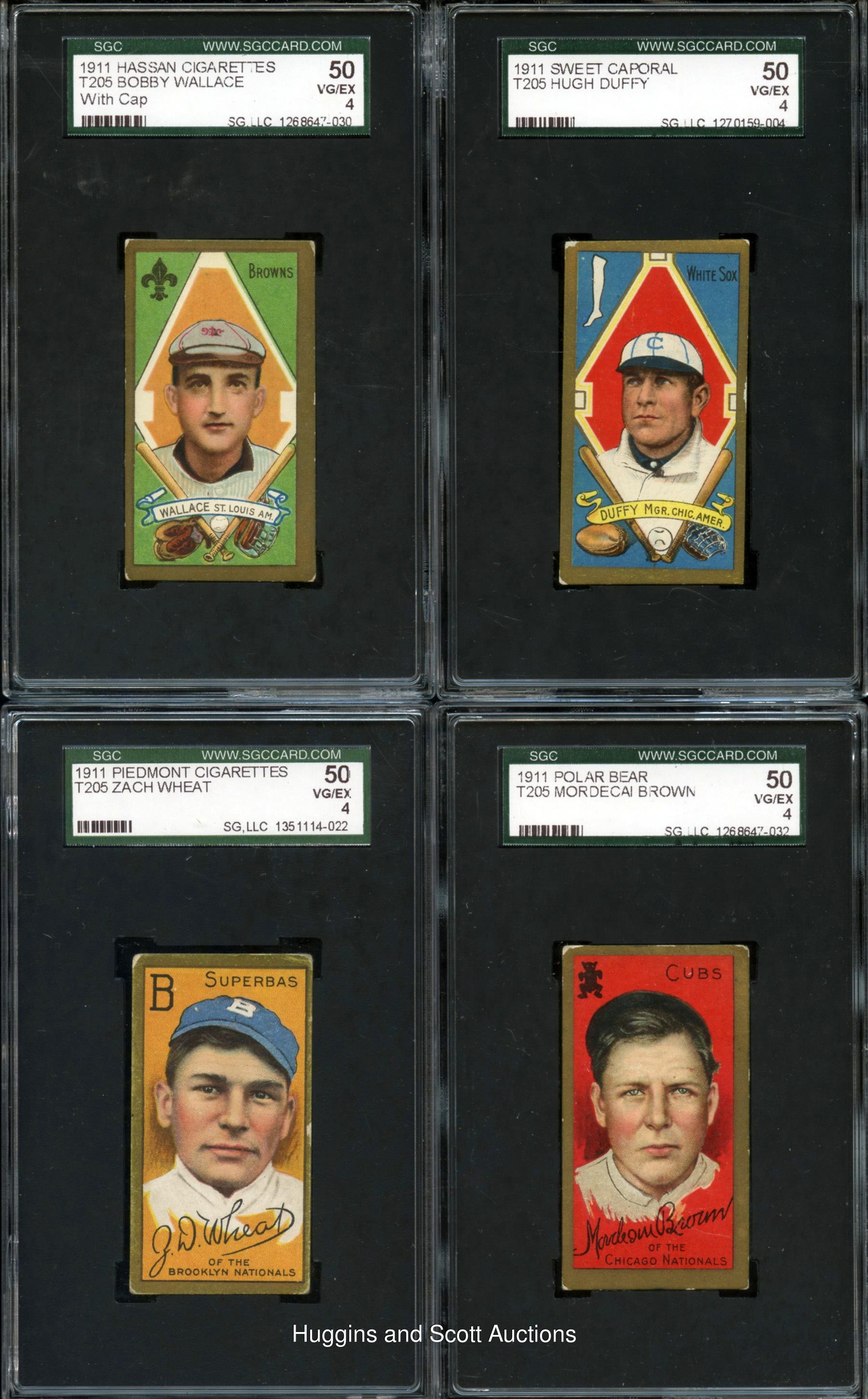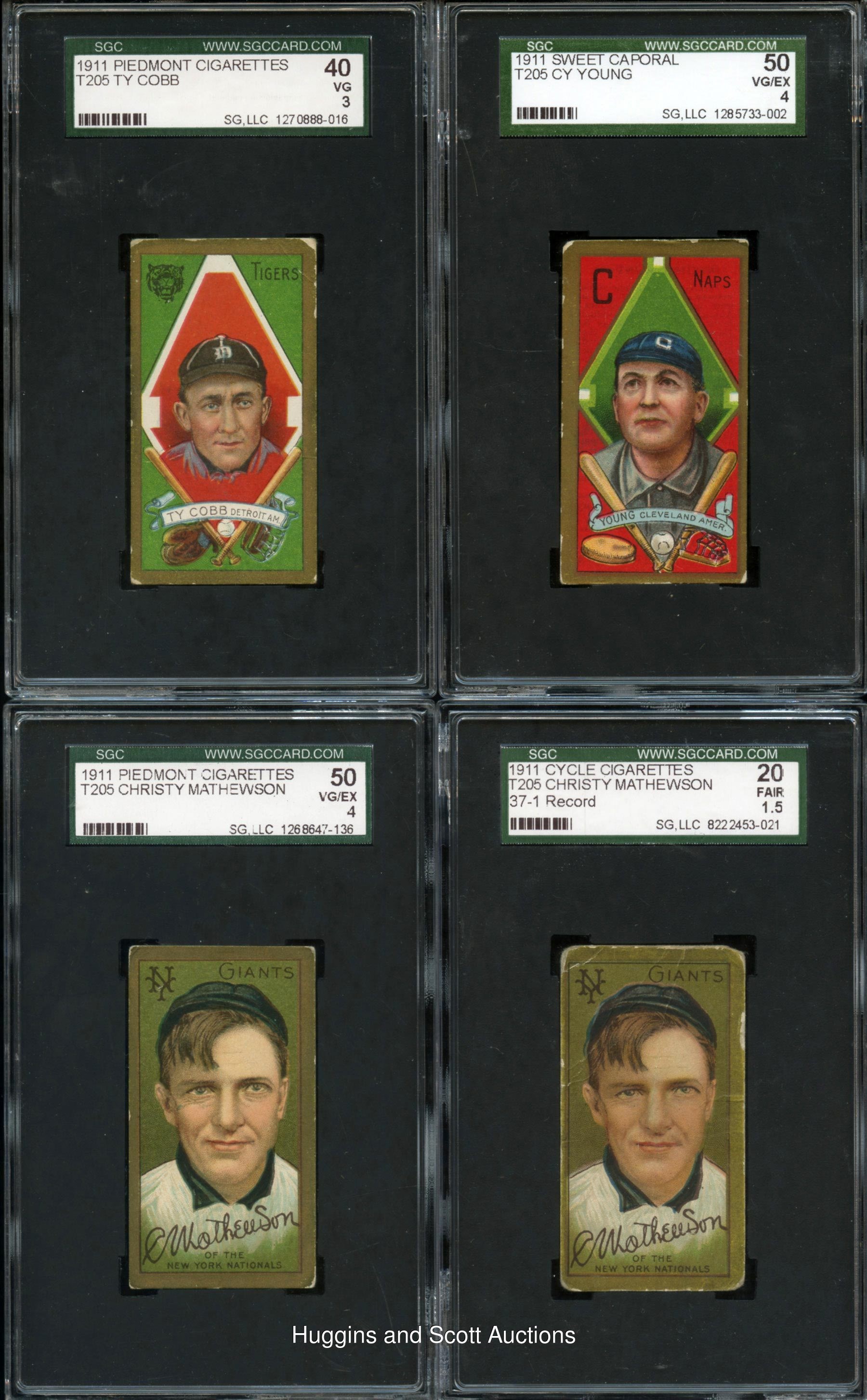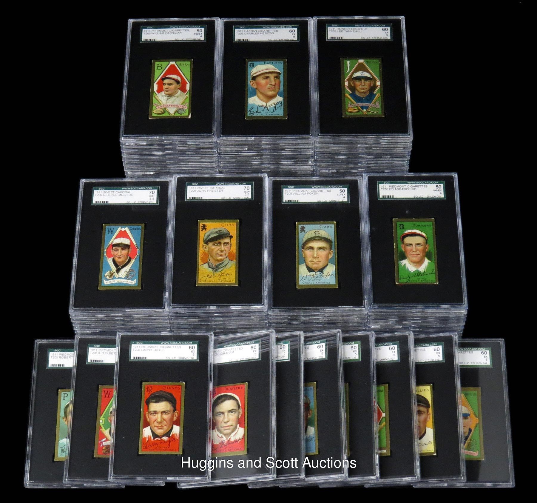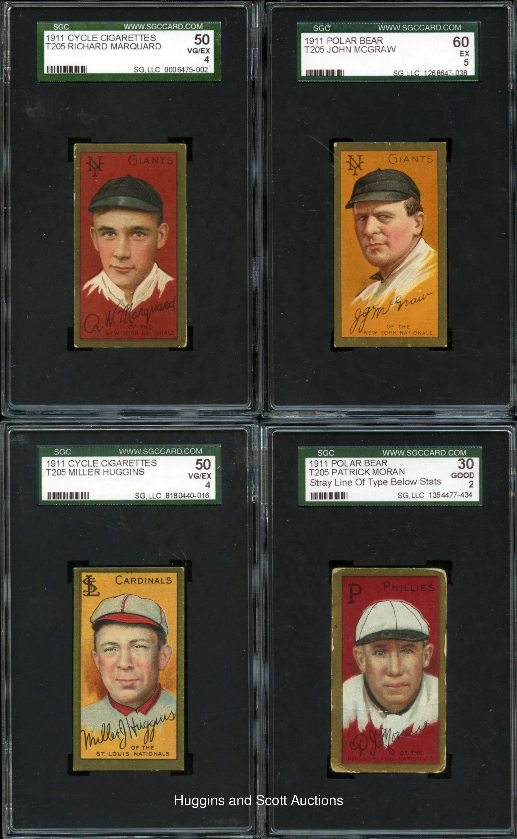Extraordinary 1911 T205 Gold Borders near master set of (221/222) SGC graded cards. These century-old gilt treasures constitute a labor of love from our consignor who meticulously pieced together this fragile tobacco card series with an eye for quality. The result is an incredible proposition for the serious turn-of-the-century baseball card collector. With an average card grade of 55.96 the offered 1911 T205 Gold Borders near master set currently has the highest GPA for the designation evaluated by the grading service! Over 94% of the cards are judged 50 VG-EX 4 or better! The overall condition breakdown is as follows: (1) SGC 82, (11) SGC 80, (13) SGC 70, (83) SGC 60, (10) SGC 55, (90) SGC 50, (1) SGC 45, (9) SGC 40, (1) SGC 30, (1) SGC 20 and (1) SGC 20. Additionally, the advertising back composition includes: (79) Piedmont, (55) Sweet Caporal, (32) Hassan, (19) Polar Bear, (16) Honest Long Cut, (10) Cycle, (9) Sovereign and (1) American Beauty. Highlights include: Hall of Famers: (30 cards, all common backs, unless noted) with Baker (SGC 60), Bender (SGC 40), Bresnahan (SGC 80, Mouth Closed), Bresnahan (SGC 80, Mouth Open), M. Brown (SGC 50, Polar Bear), Chance (SGC 82), Clarke (SGC 80), Cobb (SGC 40), E. Collins (SGC 60, Mouth Closed), E. Collins (SGC 40, Mouth Open), J. Collins (SGC 50), Duffy (SGC 50), Evers (SGC 50), Griffith (SGC 60), Huggins (SGC 50, Cycle), Jennings (SGC 50), W. Johnson (SGC 40, Polar Bear), Joss (SGC 50), Marquard (SGC 50, Cycle), Mathewson (SGC 50), Mathewson (SGC 20, “37-1” Record, Cycle), McGraw (SGC 60, Polar Bear), Speaker (SGC 60), Tinker (SGC 80, 1 of 6, one better), Wallace (SGC 40, No Cap, One Line of 1910 Stats), Wallace (SGC 50, No Cap, Two Lines of 1910 Stats), Wallace (SGC 50, with Cap), Walsh (SGC 50), Wheat (SGC 50), C. Young (SGC 50); Non-Hall of Fame Minor Leaguers: (11 cards, all Hassan backs, unless noted) with Adkins (SGC 60, Polar Bear), Batch (SGC 50), Cady (SGC 60, Polar Bear), Dunn (SGC 60), Frick (SGC 50), Hanford (SGC 50, Polar Bear), Lee (SGC 70), McAllister (SGC 80), Merritt (SGC 50), Nee (SGC 50, Polar Bear), Phelan (SGC 60, Polar Bear); Non-Hall of Fame Shortprints: (16 cards, all common backs, unless noted) with Dahlen (SGC 70), Donohue (SGC 50), Fisher (SGC 50), Grant (SGC 60), Karger (SGC 50), Kleinow (SGC 40), Raymond (SGC 50), Rowan (SGC 60, Polar Bear), Scanlan (SGC 60, Honest Long Cut), Stahl (SGC 50), Suggs (SGC 50), Sweeney (SGC 50, Honest Long Cut), Turner (SGC 50), Vaughn (SGC 55), C. Wagner (SGC 40), K. White (SGC 60); Non-Hall of Fame Variations/Other Stars: (26 cards, all common backs, unless noted) with Barger (SGC 50, Partial “B” on Cap), Chase (SGC 50, Both Ears Show, Frame Ends at Shoulders), Chase (SGC 50, Both Ears Show, Frame Extends Below Frame), Chase (SGC 50, Only Left Ear Shows), Dougherty (SGC 50, Red Sock), Ford (SGC 60, White Cap), Gray (SGC 40, Stats on Back), Harmon (SGC 60, Only Left Ear Shows), Hoblitzel (SGC 70, Name Incorrect, No “Cin.”), Hoblitzell (SGC 60, Corrected, “Cin.” After 2nd 1908 in Stats, Cycle), Hoblitzell (SGC 50, Corrected, No “Cin.”), Miller (SGC 50, "John B." on back, uncatalogued variation), Moran (SGC 30, Stray Line of Type Below Stats, Polar Bear), Shean (SGC 50, Cubs), Wilhelm (SGC 10, “Suffered” in 18th Line, Hassan) and Wilhelm (SGC 60, “Suffe ed” in 18th Line). Missing only the near impossible Hoblitzell (No Stats) variation for total master set completion. This item has a reserve. Estimated value ($32,500-$50,000). A complete list of cards and their respective grades is available by following the link posted on our website. Hall of Famers: (30 cards, all common backs, unless noted) with Baker (SGC 60), Bender (SGC 40), Bresnahan (SGC 80, Mouth Closed), Bresnahan (SGC 80, Mouth Open), M. Brown (SGC 50, Polar Bear), Chance (SGC 82), Clarke (SGC 80), Cobb (SGC 40), E. Collins (SGC 60, Mouth Closed), E. Collins (SGC 40, Mouth Open), J. Collins (SGC 50), Duffy (SGC 50), Evers (SGC 50), Griffith (SGC 60), Huggins (SGC 50, Cycle), Jennings (SGC 50), W. Johnson (SGC 40, Polar Bear), Joss (SGC 50), Marquard (SGC 50, Cycle), Mathewson (SGC 50), Mathewson (SGC 20, “37-1” Record, Cycle), McGraw (SGC 60, Polar Bear), Speaker (SGC 60), Tinker (SGC 80, 1 of 6, one better), Wallace (SGC 40, No Cap, One Line of 1910 Stats), Wallace (SGC 50, No Cap, Two Lines of 1910 Stats), Wallace (SGC 50, with Cap), Walsh (SGC 50), Wheat (SGC 50), C. Young (SGC 50); Non-Hall of Fame Minor Leaguers: (11 cards, all Hassan backs, unless noted) with Adkins (SGC 60, Polar Bear), Batch (SGC 50), Cady (SGC 60, Polar Bear), Dunn (SGC 60), Frick (SGC 50), Hanford (SGC 50, Polar Bear), Lee (SGC 70), McAllister (SGC 80), Merritt (SGC 50), Nee (SGC 50, Polar Bear), Phelan (SGC 60, Polar Bear); Non-Hall of Fame Shortprints: (16 cards, all common backs, unless noted) with Dahlen (SGC 70), Donohue (SGC 50), Fisher (SGC 50), Grant (SGC 60), Karger (SGC 50), Kleinow (SGC 40), Raymond (SGC 50), Rowan (GC 60, Polar Bear), Scanlan (SGC 60, Honest Long Cut), Stahl (SGC 50), Suggs (SGC 50), Sweeney (SGC 50, Honest Long Cut), Turner (SGC 50), Vaughn (SGC 55), C. Wagner (SGC 40), K. White (SGC 60); Non-Hall of Fame Variations/Other Stars: (25 cards, all common backs, unless noted) with Barger (SGC 60, Full “B” on Cap), Barger (SGC 50, Partial “B” on Cap), Chase (SGC 50, Both Ears Show, Frame Ends at Shoulders), Chase (SGC 50, Both Ears Show, Frame Extends Below Frame), Chase (SGC 50, Only Left Ear Shows), Cicotte (SGC 70, Polar Bear), Crandall (SGC 60, “T” Crossed in Name), Crandall (SGC 50, “T” Not Crossed in Name), Dougherty (SGC 50, Red Sock), Dougherty (SGC 50, White Sock), Ford (SGC 60, White Cap), Graham (SGC 50, Cubs), Gray (SGC 60, No Stats on Back), Gray (SGC 40, Stats on Back), Harmon (SGC 60, Only Left Ear Shows), Hoblitzell (SGC 70, Name Incorrect, No “Cin.”), Hoblitzell (SGC 60, Corrected, “Cin.” After 2nd 1908 in Stats, Cycle), Hoblitzell (SGC 50, Corrected,