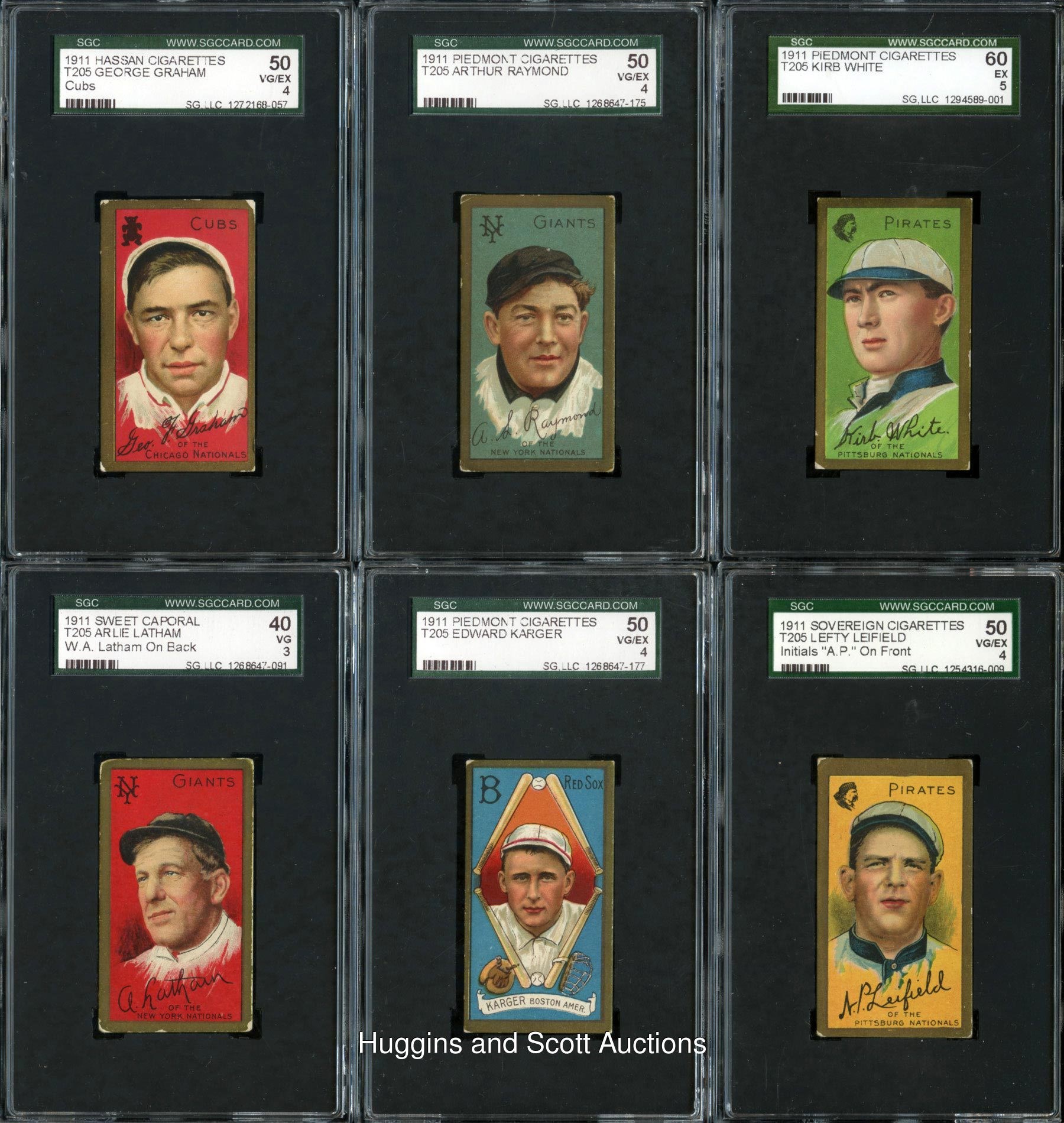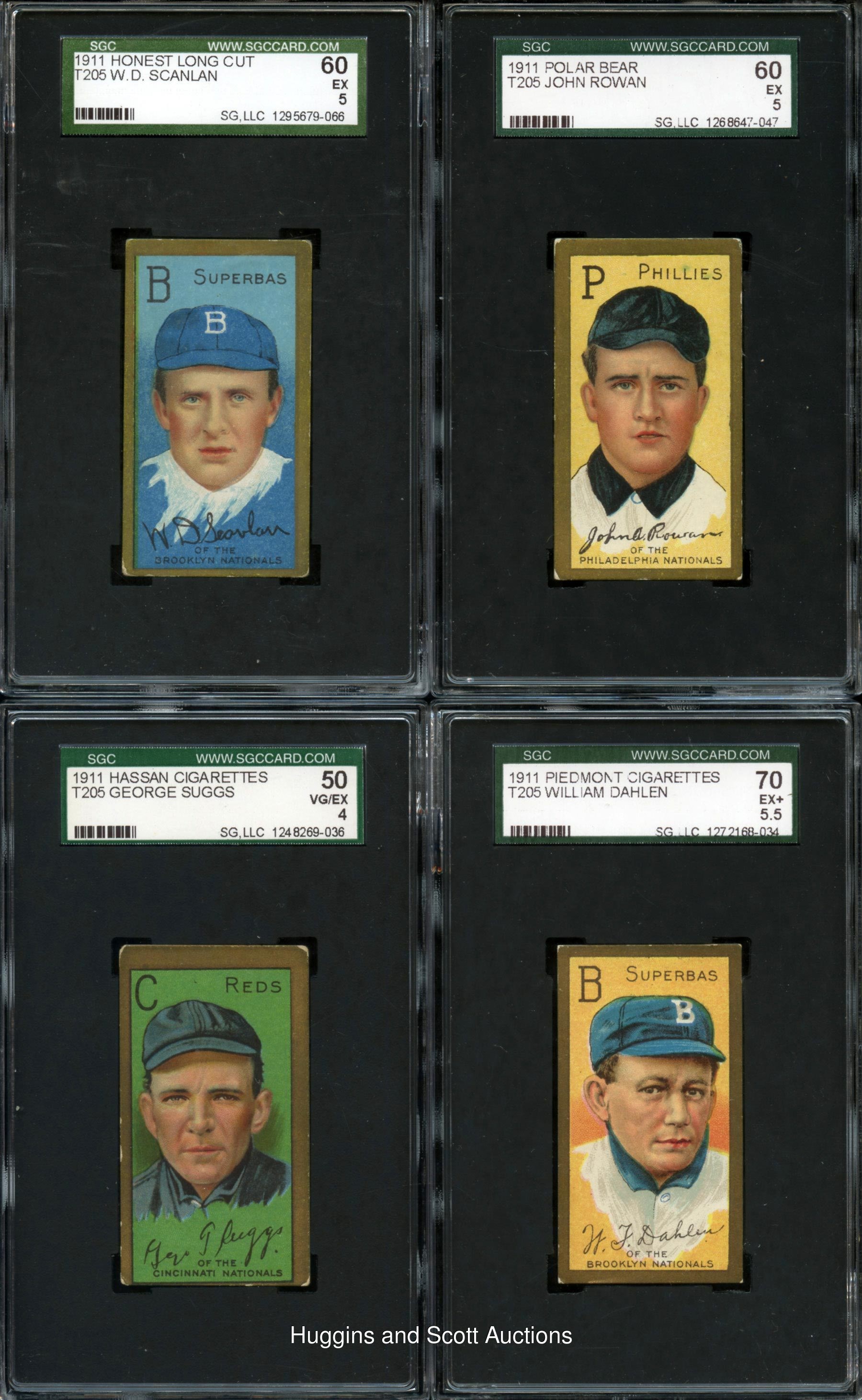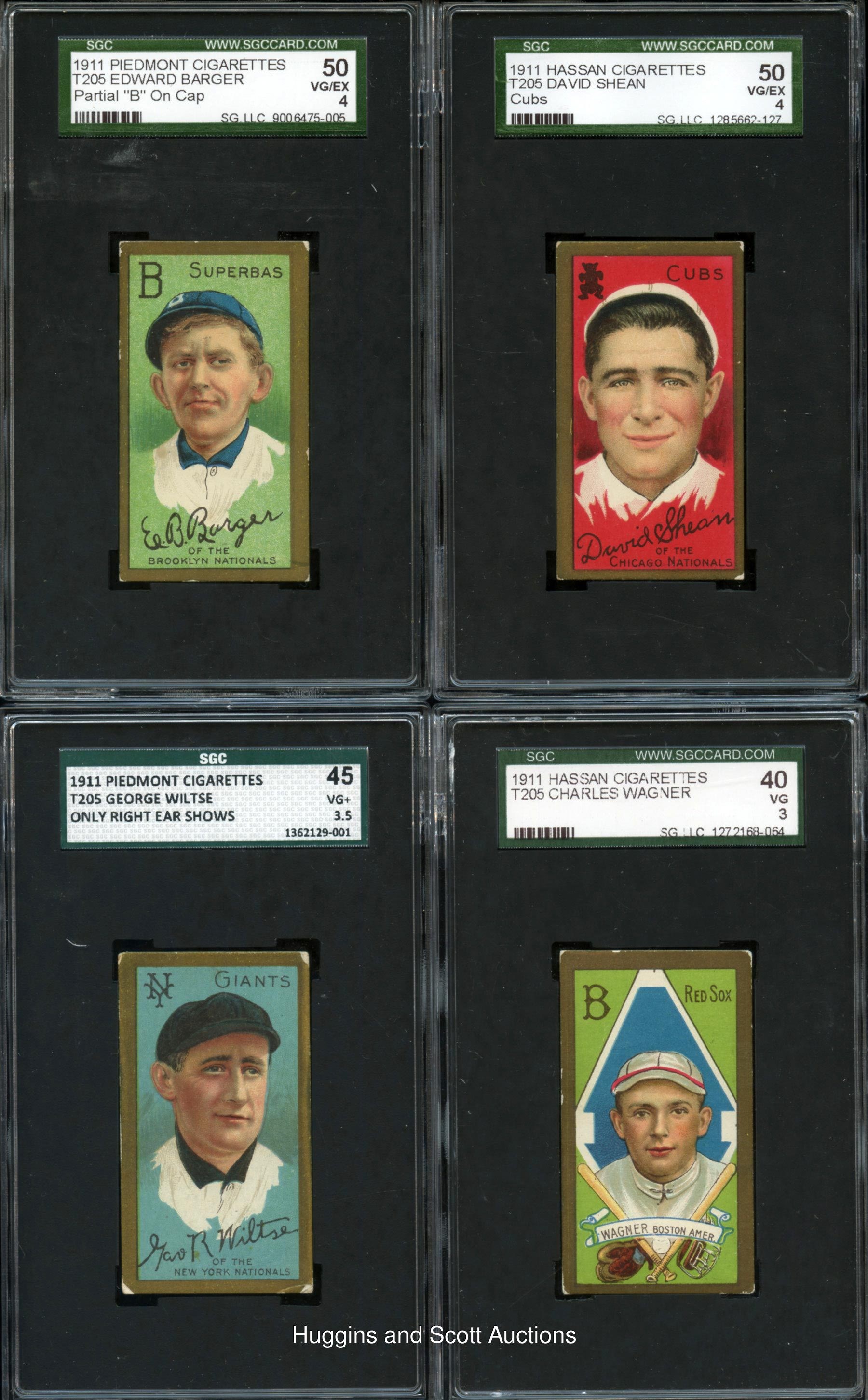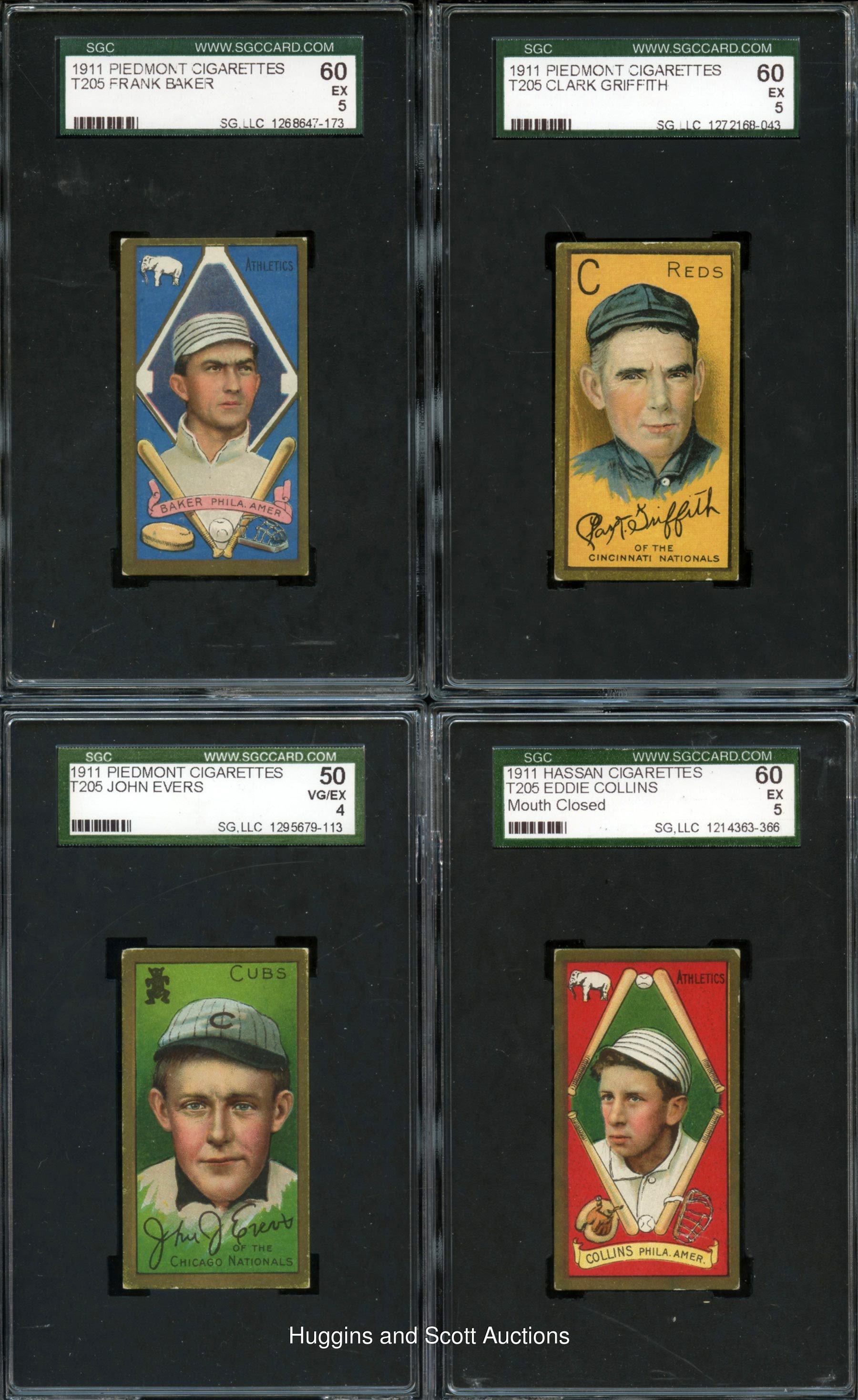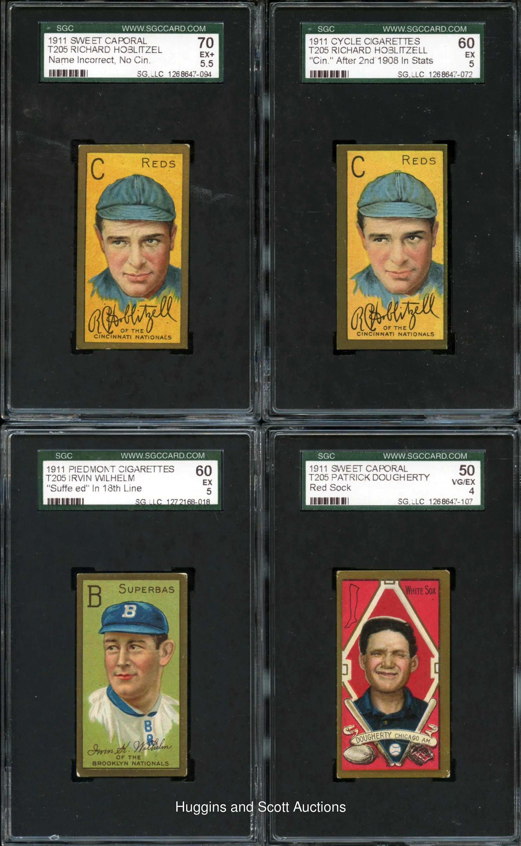 Extraordinary 1911 T205 Gold Borders near master set of (221/222) SGC graded cards. These century-old gilt treasures constitute a labor of love from our consignor who meticulously pieced together this fragile tobacco card series with an eye for quality. The result is an incredible proposition for the serious turn-of-the-century baseball card collector. With an average card grade of 55.96 the offered 1911 T205 Gold Borders near master set currently has the highest GPA for the designation evaluated by the grading service! Over 94% of the cards are judged 50 VG-EX 4 or better! The overall condition breakdown is as follows: (1) SGC 82, (11) SGC 80, (13) SGC 70, (83) SGC 60, (10) SGC 55, (90) SGC 50, (1) SGC 45, (9) SGC 40, (1) SGC 30, (1) SGC 20 and (1) SGC 20. Additionally, the advertising back composition includes: (79) Piedmont, (55) Sweet Caporal, (32) Hassan, (19) Polar Bear, (16) Honest Long Cut, (10) Cycle, (9) Sovereign and (1) American Beauty. Highlights include: Hall of Famers: (30 cards, all common backs, unless noted) with Baker (SGC 60), Bender (SGC 40), Bresnahan (SGC 80, Mouth Closed), Bresnahan (SGC 80, Mouth Open), M. Brown (SGC 50, Polar Bear), Chance (SGC 82), Clarke (SGC 80), Cobb (SGC 40), E. Collins (SGC 60, Mouth Closed), E. Collins (SGC 40, Mouth Open), J. Collins (SGC 50), Duffy (SGC 50), Evers (SGC 50), Griffith (SGC 60), Huggins (SGC 50, Cycle), Jennings (SGC 50), W. Johnson (SGC 40, Polar Bear), Joss (SGC 50), Marquard (SGC 50, Cycle), Mathewson (SGC 50), Mathewson (SGC 20, “37-1” Record, Cycle), McGraw (SGC 60, Polar Bear), Speaker (SGC 60), Tinker (SGC 80, 1 of 6, one better), Wallace (SGC 40, No Cap, One Line of 1910 Stats), Wallace (SGC 50, No Cap, Two Lines of 1910 Stats), Wallace (SGC 50, with Cap), Walsh (SGC 50), Wheat (SGC 50), C. Young (SGC 50); Non-Hall of Fame Minor Leaguers: (11 cards, all Hassan backs, unless noted) with Adkins (SGC 60, Polar Bear), Batch (SGC 50), Cady (SGC 60, Polar Bear), Dunn (SGC 60), Frick (SGC 50), Hanford (SGC 50, Polar Bear), Lee (SGC 70), McAllister (SGC 80), Merritt (SGC 50), Nee (SGC 50, Polar Bear), Phelan (SGC 60, Polar Bear); Non-Hall of Fame Shortprints: (16 cards, all common backs, unless noted) with Dahlen (SGC 70), Donohue (SGC 50), Fisher (SGC 50), Grant (SGC 60), Karger (SGC 50), Kleinow (SGC 40), Raymond (SGC 50), Rowan (SGC 60, Polar Bear), Scanlan (SGC 60, Honest Long Cut), Stahl (SGC 50), Suggs (SGC 50), Sweeney (SGC 50, Honest Long Cut), Turner (SGC 50), Vaughn (SGC 55), C. Wagner (SGC 40), K. White (SGC 60); Non-Hall of Fame Variations/Other Stars: (26 cards, all common backs, unless noted) with Barger (SGC 50, Partial “B” on Cap), Chase (SGC 50, Both Ears Show, Frame Ends at Shoulders), Chase (SGC 50, Both Ears Show, Frame Extends Below Frame), Chase (SGC 50, Only Left Ear Shows), Dougherty (SGC 50, Red Sock), Ford (SGC 60, White Cap), Gray (SGC 40, Stats on Back), Harmon (SGC 60, Only Left Ear Shows), Hoblitzel (SGC 70, Name Incorrect, No “Cin.”), Hoblitzell (SGC 60, Corrected, “Cin.” After 2nd 1908 in Stats, Cycle), Hoblitzell (SGC 50, Corrected, No “Cin.”), Miller (SGC 50, "John B." on back, uncatalogued variation), Moran (SGC 30, Stray Line of Type Below Stats, Polar Bear), Shean (SGC 50, Cubs), Wilhelm (SGC 10, “Suffered” in 18th Line, Hassan) and Wilhelm (SGC 60, “Suffe ed” in 18th Line). Missing only the near impossible Hoblitzell (No Stats) variation for total master set completion. This item has a reserve. Estimated value ($32,500-$50,000). A complete list of cards and their respective grades is available by following the link posted on our website. Hall of Famers: (30 cards, all common backs, unless noted) with Baker (SGC 60), Bender (SGC 40), Bresnahan (SGC 80, Mouth Closed), Bresnahan (SGC 80, Mouth Open), M. Brown (SGC 50, Polar Bear), Chance (SGC 82), Clarke (SGC 80), Cobb (SGC 40), E. Collins (SGC 60, Mouth Closed), E. Collins (SGC 40, Mouth Open), J. Collins (SGC 50), Duffy (SGC 50), Evers (SGC 50), Griffith (SGC 60), Huggins (SGC 50, Cycle), Jennings (SGC 50), W. Johnson (SGC 40, Polar Bear), Joss (SGC 50), Marquard (SGC 50, Cycle), Mathewson (SGC 50), Mathewson (SGC 20, “37-1” Record, Cycle), McGraw (SGC 60, Polar Bear), Speaker (SGC 60), Tinker (SGC 80, 1 of 6, one better), Wallace (SGC 40, No Cap, One Line of 1910 Stats), Wallace (SGC 50, No Cap, Two Lines of 1910 Stats), Wallace (SGC 50, with Cap), Walsh (SGC 50), Wheat (SGC 50), C. Young (SGC 50); Non-Hall of Fame Minor Leaguers: (11 cards, all Hassan backs, unless noted) with Adkins (SGC 60, Polar Bear), Batch (SGC 50), Cady (SGC 60, Polar Bear), Dunn (SGC 60), Frick (SGC 50), Hanford (SGC 50, Polar Bear), Lee (SGC 70), McAllister (SGC 80), Merritt (SGC 50), Nee (SGC 50, Polar Bear), Phelan (SGC 60, Polar Bear); Non-Hall of Fame Shortprints: (16 cards, all common backs, unless noted) with Dahlen (SGC 70), Donohue (SGC 50), Fisher (SGC 50), Grant (SGC 60), Karger (SGC 50), Kleinow (SGC 40), Raymond (SGC 50), Rowan (GC 60, Polar Bear), Scanlan (SGC 60, Honest Long Cut), Stahl (SGC 50), Suggs (SGC 50), Sweeney (SGC 50, Honest Long Cut), Turner (SGC 50), Vaughn (SGC 55), C. Wagner (SGC 40), K. White (SGC 60); Non-Hall of Fame Variations/Other Stars: (25 cards, all common backs, unless noted) with Barger (SGC 60, Full “B” on Cap), Barger (SGC 50, Partial “B” on Cap), Chase (SGC 50, Both Ears Show, Frame Ends at Shoulders), Chase (SGC 50, Both Ears Show, Frame Extends Below Frame), Chase (SGC 50, Only Left Ear Shows), Cicotte (SGC 70, Polar Bear), Crandall (SGC 60, “T” Crossed in Name), Crandall (SGC 50, “T” Not Crossed in Name), Dougherty (SGC 50, Red Sock), Dougherty (SGC 50, White Sock), Ford (SGC 60, White Cap), Graham (SGC 50, Cubs), Gray (SGC 60, No Stats on Back), Gray (SGC 40, Stats on Back), Harmon (SGC 60, Only Left Ear Shows), Hoblitzell (SGC 70, Name Incorrect, No “Cin.”), Hoblitzell (SGC 60, Corrected, “Cin.” After 2nd 1908 in Stats, Cycle), Hoblitzell (SGC 50, Corrected,