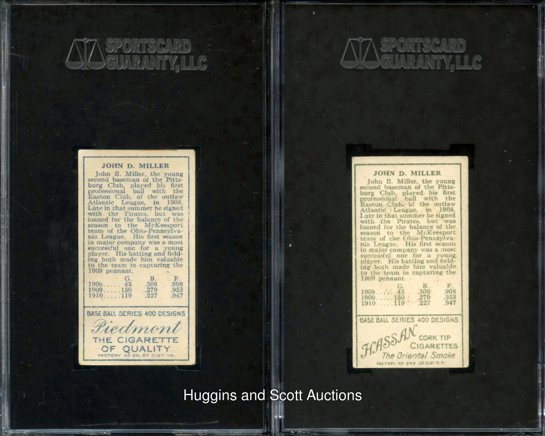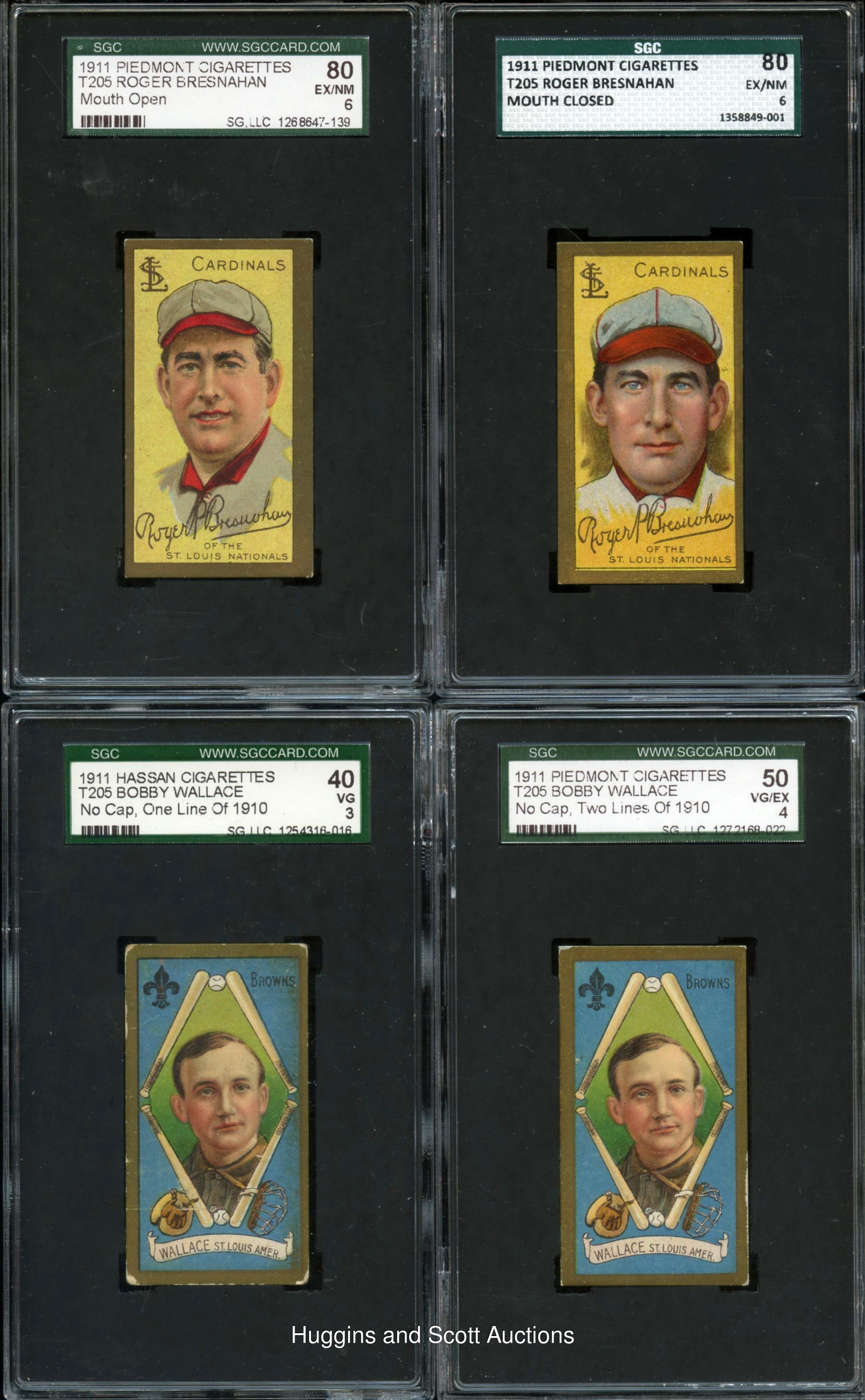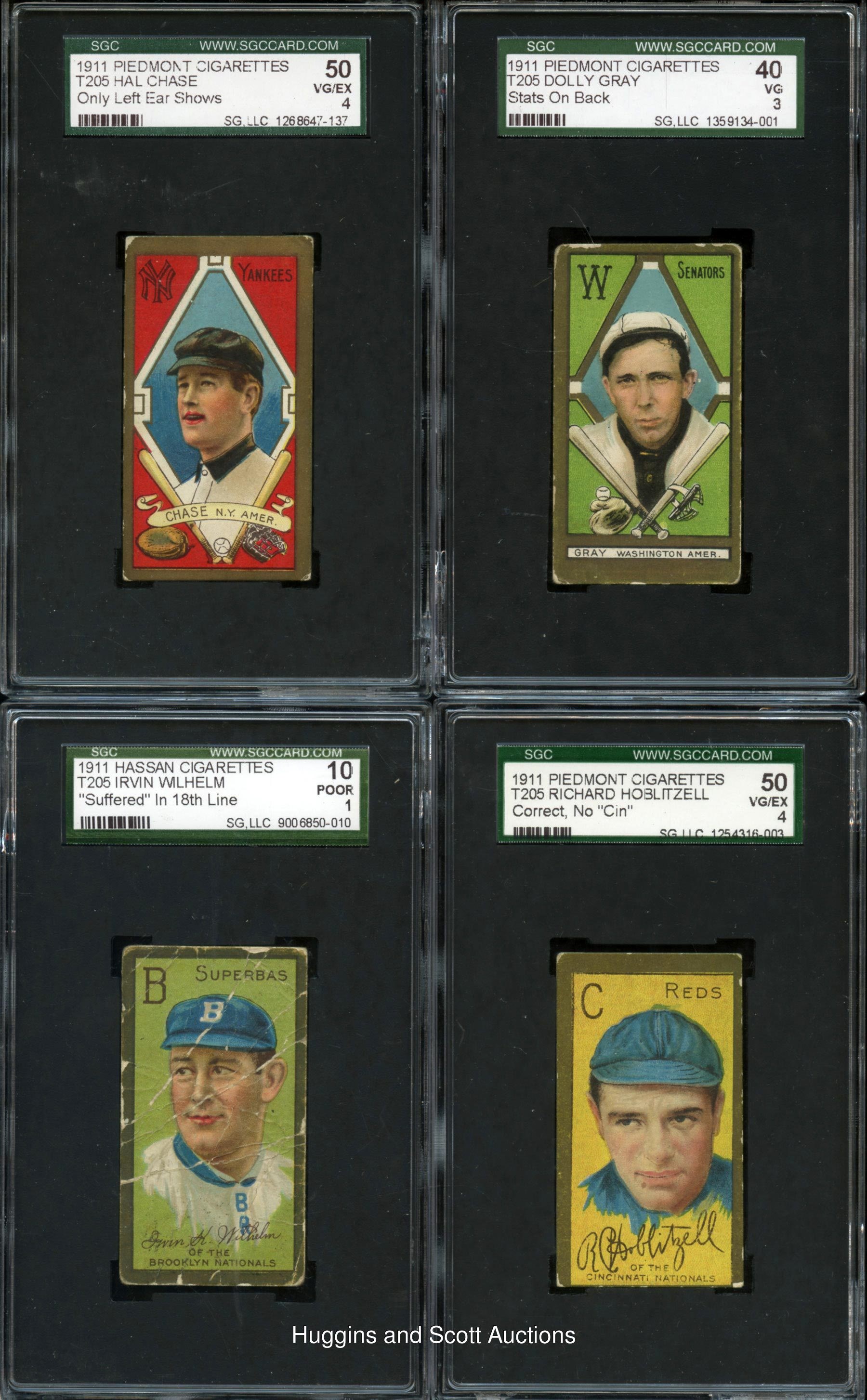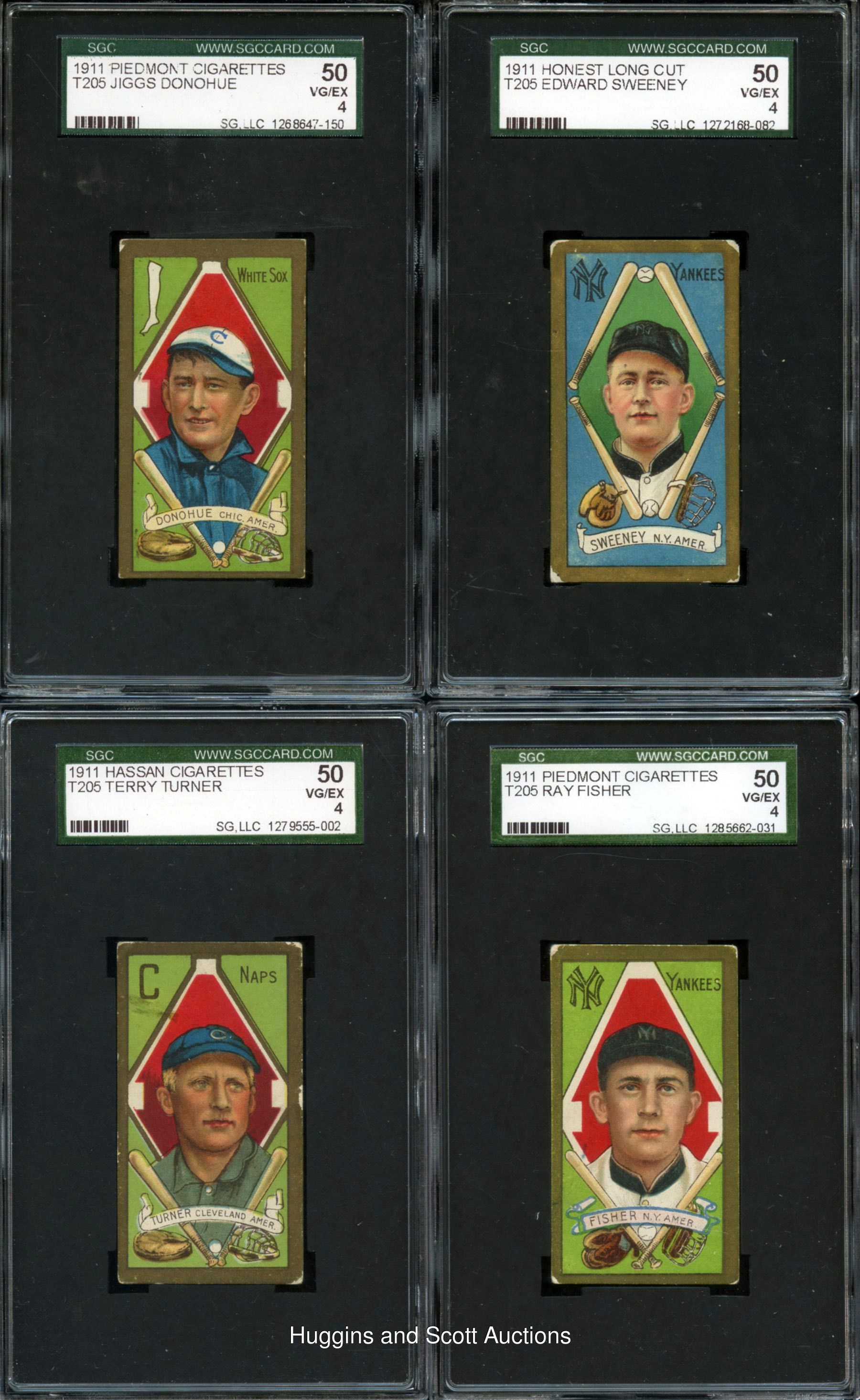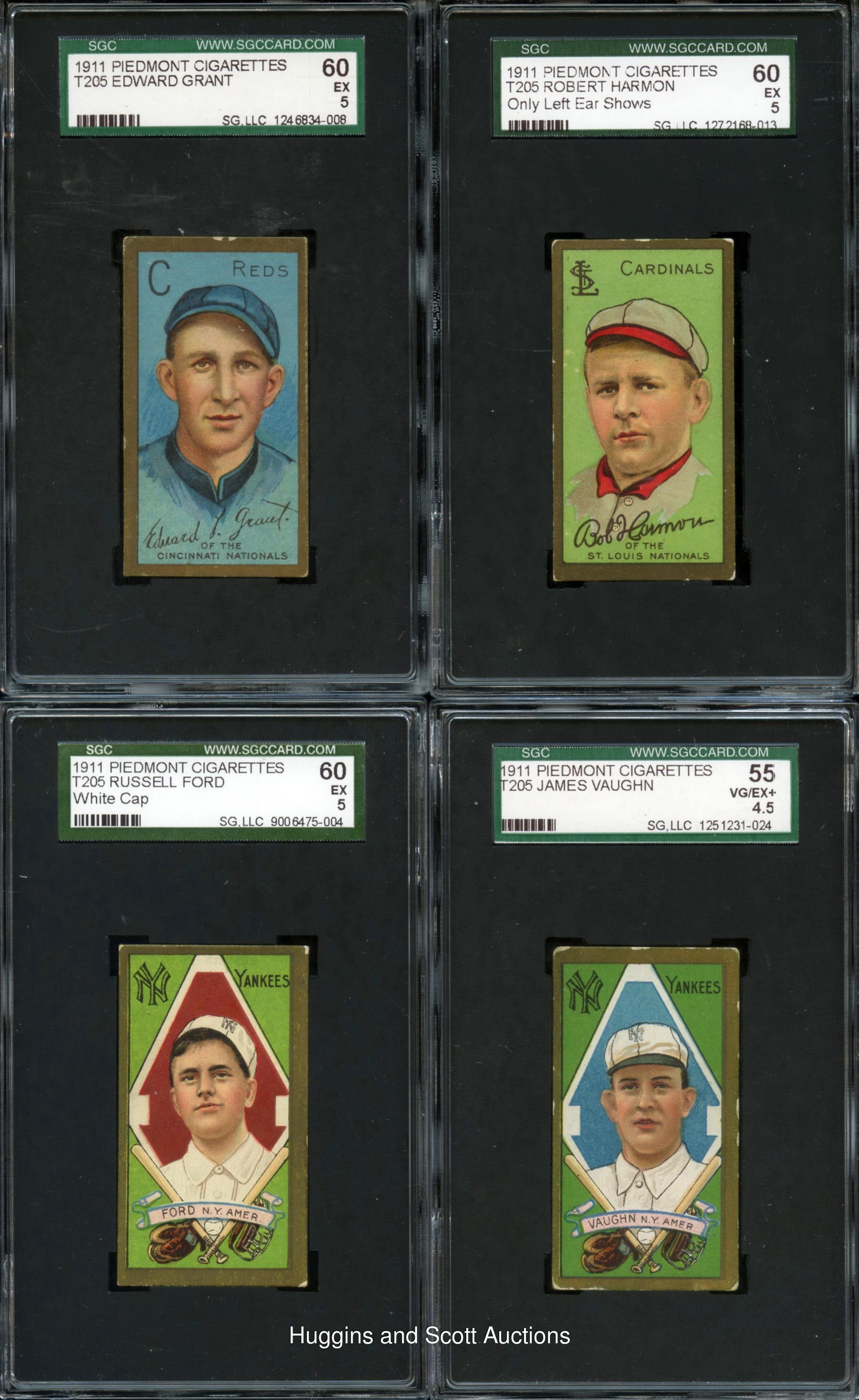 Extraordinary 1911 T205 Gold Borders near master set of (221/222) SGC graded cards. These century-old gilt treasures constitute a labor of love from our consignor who meticulously pieced together this fragile tobacco card series with an eye for quality. The result is an incredible proposition for the serious turn-of-the-century baseball card collector. With an average card grade of 55.96 the offered 1911 T205 Gold Borders near master set currently has the highest GPA for the designation evaluated by the grading service! Over 94% of the cards are judged 50 VG-EX 4 or better! The overall condition breakdown is as follows: (1) SGC 82, (11) SGC 80, (13) SGC 70, (83) SGC 60, (10) SGC 55, (90) SGC 50, (1) SGC 45, (9) SGC 40, (1) SGC 30, (1) SGC 20 and (1) SGC 20. Additionally, the advertising back composition includes: (79) Piedmont, (55) Sweet Caporal, (32) Hassan, (19) Polar Bear, (16) Honest Long Cut, (10) Cycle, (9) Sovereign and (1) American Beauty. Highlights include: Hall of Famers: (30 cards, all common backs, unless noted) with Baker (SGC 60), Bender (SGC 40), Bresnahan (SGC 80, Mouth Closed), Bresnahan (SGC 80, Mouth Open), M. Brown (SGC 50, Polar Bear), Chance (SGC 82), Clarke (SGC 80), Cobb (SGC 40), E. Collins (SGC 60, Mouth Closed), E. Collins (SGC 40, Mouth Open), J. Collins (SGC 50), Duffy (SGC 50), Evers (SGC 50), Griffith (SGC 60), Huggins (SGC 50, Cycle), Jennings (SGC 50), W. Johnson (SGC 40, Polar Bear), Joss (SGC 50), Marquard (SGC 50, Cycle), Mathewson (SGC 50), Mathewson (SGC 20, “37-1” Record, Cycle), McGraw (SGC 60, Polar Bear), Speaker (SGC 60), Tinker (SGC 80, 1 of 6, one better), Wallace (SGC 40, No Cap, One Line of 1910 Stats), Wallace (SGC 50, No Cap, Two Lines of 1910 Stats), Wallace (SGC 50, with Cap), Walsh (SGC 50), Wheat (SGC 50), C. Young (SGC 50); Non-Hall of Fame Minor Leaguers: (11 cards, all Hassan backs, unless noted) with Adkins (SGC 60, Polar Bear), Batch (SGC 50), Cady (SGC 60, Polar Bear), Dunn (SGC 60), Frick (SGC 50), Hanford (SGC 50, Polar Bear), Lee (SGC 70), McAllister (SGC 80), Merritt (SGC 50), Nee (SGC 50, Polar Bear), Phelan (SGC 60, Polar Bear); Non-Hall of Fame Shortprints: (16 cards, all common backs, unless noted) with Dahlen (SGC 70), Donohue (SGC 50), Fisher (SGC 50), Grant (SGC 60), Karger (SGC 50), Kleinow (SGC 40), Raymond (SGC 50), Rowan (SGC 60, Polar Bear), Scanlan (SGC 60, Honest Long Cut), Stahl (SGC 50), Suggs (SGC 50), Sweeney (SGC 50, Honest Long Cut), Turner (SGC 50), Vaughn (SGC 55), C. Wagner (SGC 40), K. White (SGC 60); Non-Hall of Fame Variations/Other Stars: (26 cards, all common backs, unless noted) with Barger (SGC 50, Partial “B” on Cap), Chase (SGC 50, Both Ears Show, Frame Ends at Shoulders), Chase (SGC 50, Both Ears Show, Frame Extends Below Frame), Chase (SGC 50, Only Left Ear Shows), Dougherty (SGC 50, Red Sock), Ford (SGC 60, White Cap), Gray (SGC 40, Stats on Back), Harmon (SGC 60, Only Left Ear Shows), Hoblitzel (SGC 70, Name Incorrect, No “Cin.”), Hoblitzell (SGC 60, Corrected, “Cin.” After 2nd 1908 in Stats, Cycle), Hoblitzell (SGC 50, Corrected, No “Cin.”), Miller (SGC 50, "John B." on back, uncatalogued variation), Moran (SGC 30, Stray Line of Type Below Stats, Polar Bear), Shean (SGC 50, Cubs), Wilhelm (SGC 10, “Suffered” in 18th Line, Hassan) and Wilhelm (SGC 60, “Suffe ed” in 18th Line). Missing only the near impossible Hoblitzell (No Stats) variation for total master set completion. This item has a reserve. Estimated value ($32,500-$50,000). A complete list of cards and their respective grades is available by following the link posted on our website. Hall of Famers: (30 cards, all common backs, unless noted) with Baker (SGC 60), Bender (SGC 40), Bresnahan (SGC 80, Mouth Closed), Bresnahan (SGC 80, Mouth Open), M. Brown (SGC 50, Polar Bear), Chance (SGC 82), Clarke (SGC 80), Cobb (SGC 40), E. Collins (SGC 60, Mouth Closed), E. Collins (SGC 40, Mouth Open), J. Collins (SGC 50), Duffy (SGC 50), Evers (SGC 50), Griffith (SGC 60), Huggins (SGC 50, Cycle), Jennings (SGC 50), W. Johnson (SGC 40, Polar Bear), Joss (SGC 50), Marquard (SGC 50, Cycle), Mathewson (SGC 50), Mathewson (SGC 20, “37-1” Record, Cycle), McGraw (SGC 60, Polar Bear), Speaker (SGC 60), Tinker (SGC 80, 1 of 6, one better), Wallace (SGC 40, No Cap, One Line of 1910 Stats), Wallace (SGC 50, No Cap, Two Lines of 1910 Stats), Wallace (SGC 50, with Cap), Walsh (SGC 50), Wheat (SGC 50), C. Young (SGC 50); Non-Hall of Fame Minor Leaguers: (11 cards, all Hassan backs, unless noted) with Adkins (SGC 60, Polar Bear), Batch (SGC 50), Cady (SGC 60, Polar Bear), Dunn (SGC 60), Frick (SGC 50), Hanford (SGC 50, Polar Bear), Lee (SGC 70), McAllister (SGC 80), Merritt (SGC 50), Nee (SGC 50, Polar Bear), Phelan (SGC 60, Polar Bear); Non-Hall of Fame Shortprints: (16 cards, all common backs, unless noted) with Dahlen (SGC 70), Donohue (SGC 50), Fisher (SGC 50), Grant (SGC 60), Karger (SGC 50), Kleinow (SGC 40), Raymond (SGC 50), Rowan (GC 60, Polar Bear), Scanlan (SGC 60, Honest Long Cut), Stahl (SGC 50), Suggs (SGC 50), Sweeney (SGC 50, Honest Long Cut), Turner (SGC 50), Vaughn (SGC 55), C. Wagner (SGC 40), K. White (SGC 60); Non-Hall of Fame Variations/Other Stars: (25 cards, all common backs, unless noted) with Barger (SGC 60, Full “B” on Cap), Barger (SGC 50, Partial “B” on Cap), Chase (SGC 50, Both Ears Show, Frame Ends at Shoulders), Chase (SGC 50, Both Ears Show, Frame Extends Below Frame), Chase (SGC 50, Only Left Ear Shows), Cicotte (SGC 70, Polar Bear), Crandall (SGC 60, “T” Crossed in Name), Crandall (SGC 50, “T” Not Crossed in Name), Dougherty (SGC 50, Red Sock), Dougherty (SGC 50, White Sock), Ford (SGC 60, White Cap), Graham (SGC 50, Cubs), Gray (SGC 60, No Stats on Back), Gray (SGC 40, Stats on Back), Harmon (SGC 60, Only Left Ear Shows), Hoblitzell (SGC 70, Name Incorrect, No “Cin.”), Hoblitzell (SGC 60, Corrected, “Cin.” After 2nd 1908 in Stats, Cycle), Hoblitzell (SGC 50, Corrected,