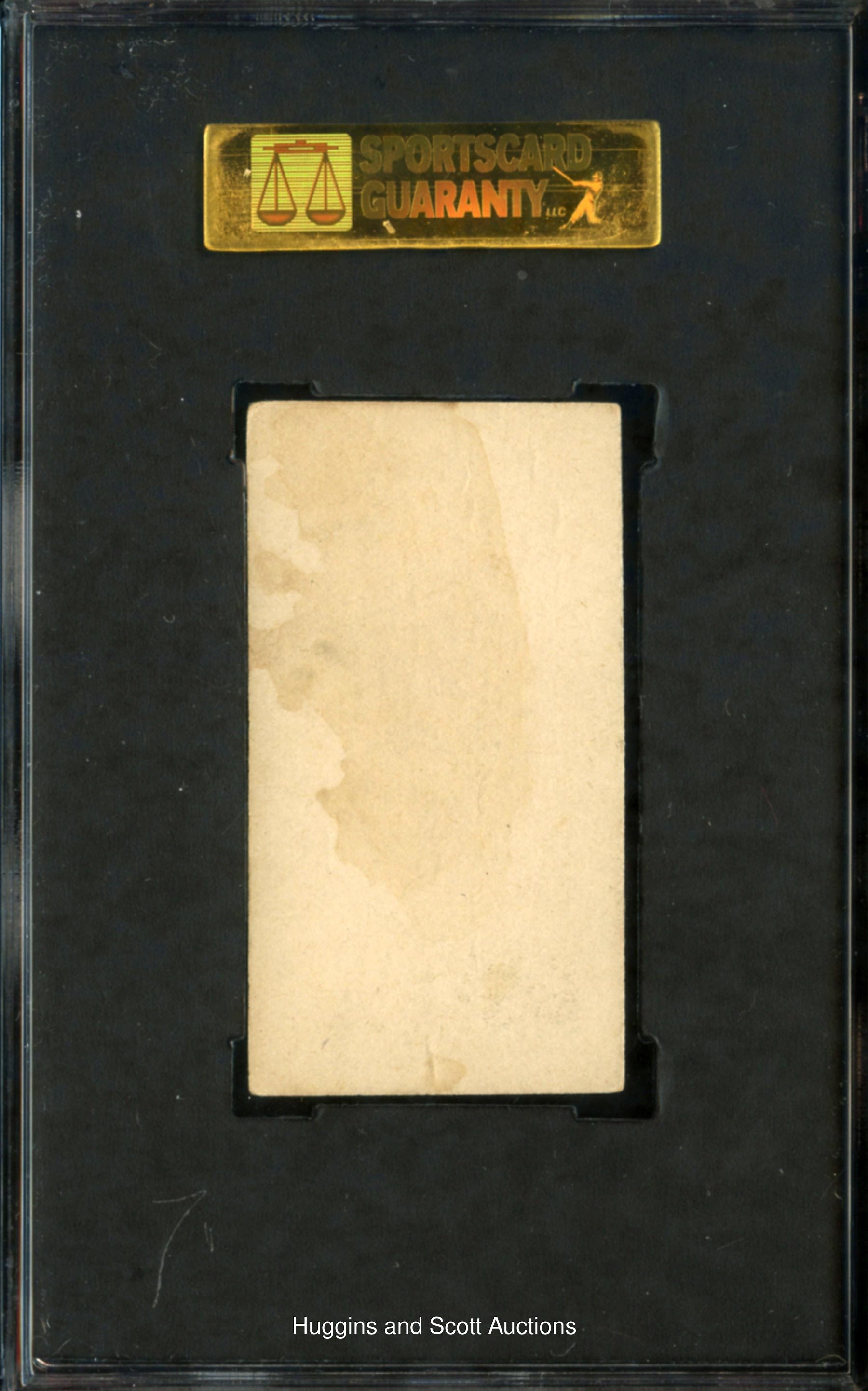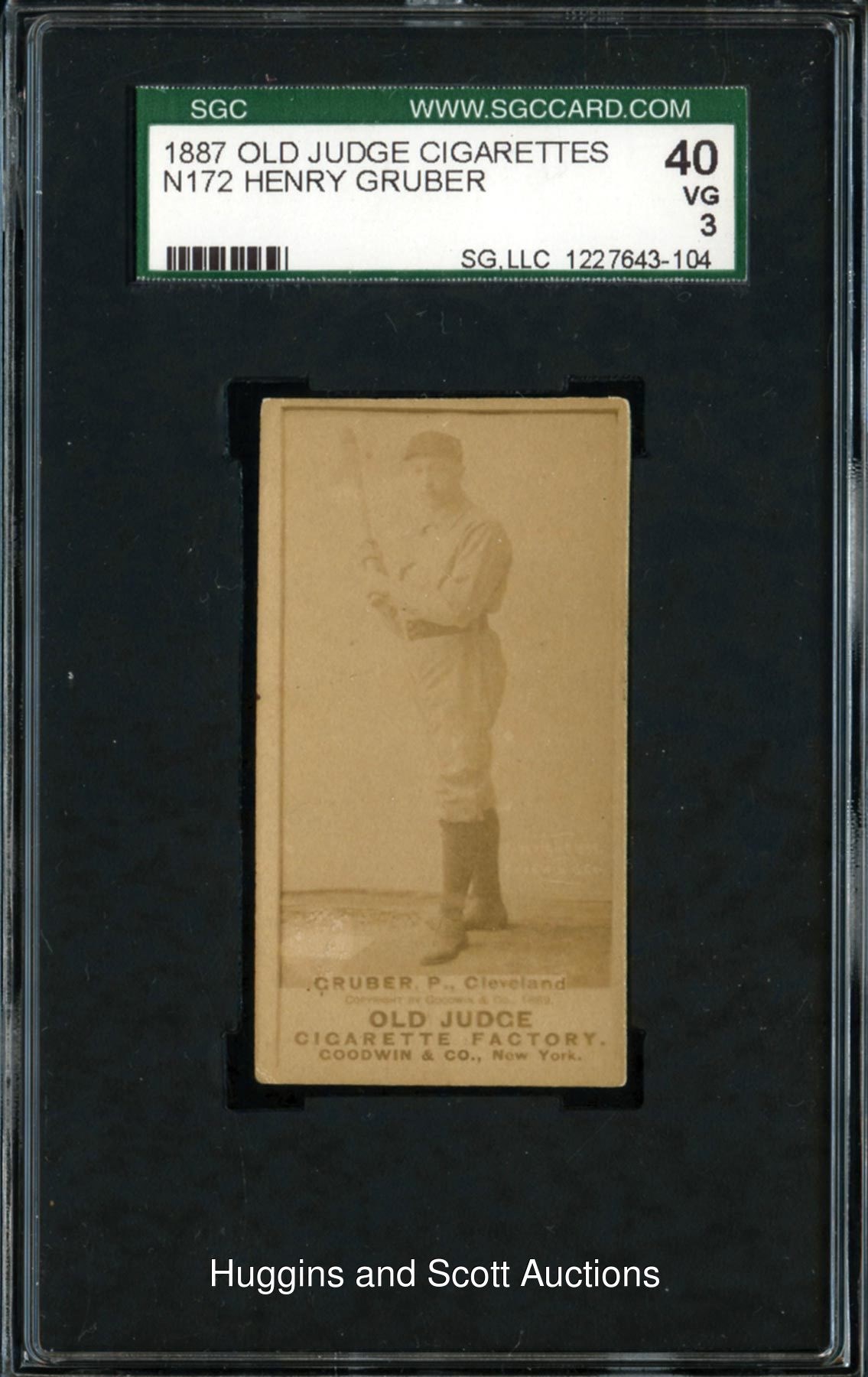 Graded 40 VG 3 by SGC and confirmed as pose 202-1. Step to the plate for this 1887 N172 Old Judge Cigarettes Henry Gruber sample. The Cleveland Spiders hurler projects a different aspect of his game. Presents at the peak of the technical grade with a crystal clear sepia front while the blank reverse has sustained only superficial discoloration.
