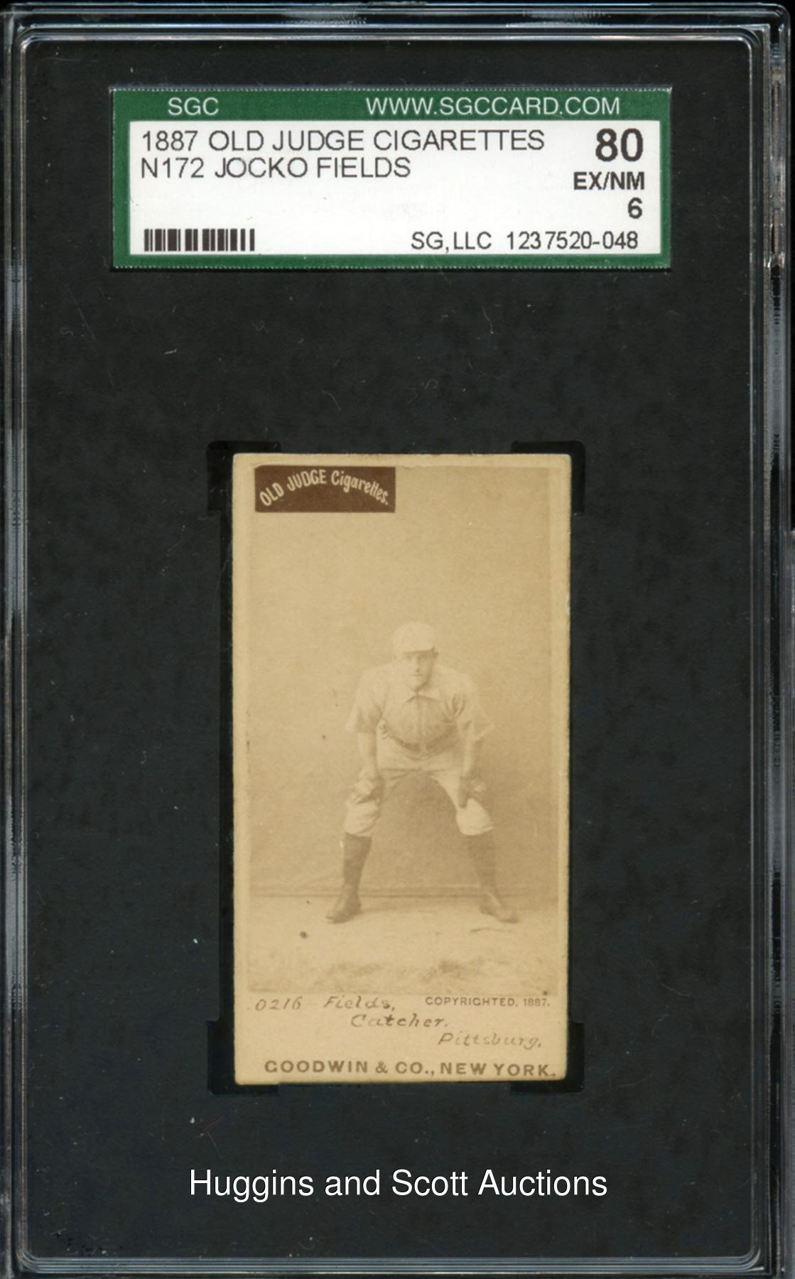 Graded 80 EX/NM 6 by SGC and confirmed as pose 160-6. Sterling 1887 N172 Old Judge Cigarettes Jocko Fields of the Pittsburg Alleghenys. The Irish backstop is accentuated by four slightly touched corners, crisp edges and a clear sepia image. Additionally, the creamy reverse is absent of any detractors. Of the 25 total copies judged by SGC, this sample survives as one of two at the grading level with only one better.