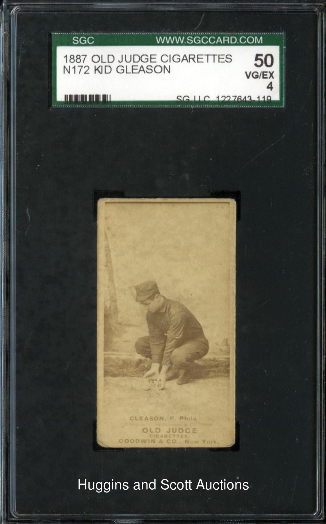Detailed description on website. Graded 50 VG-EX 4 by SGC and confirmed as pose 192-1. "Black Sox" skipper William (Kid) Gleason is portrayed during simpler times on this 1887 N172 Old Judge sample. The Philadelphia Quaker pitcher is clearly portrayed fielding a ground ball on this 128 year-old tobacco card. Displays only general wear consistent with its assigned grade and is an ideal choice for pre-war historians.