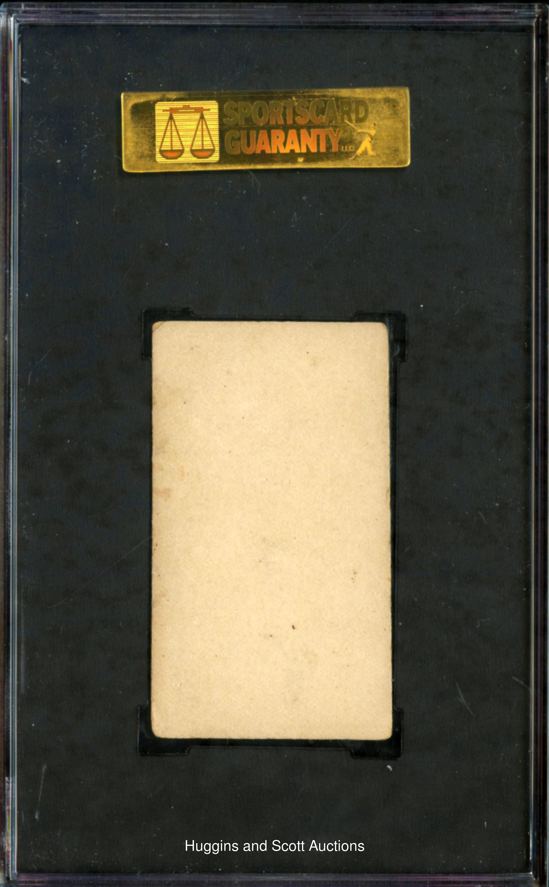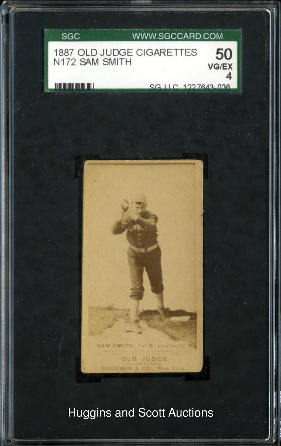 Graded 50 VG-EX 4 by SGC and confirmed as post 421-2. Sam (Skyrocket) Smith stars for the Louisville Colonels on the offered 1887 N172 Old Judge Cigarettes card. The crystal clear image is flanked by only modest corner and edge wear. Of the six total examples graded by SGC, this century-old treasure survives as the lone representative at the grading level with only one better.
