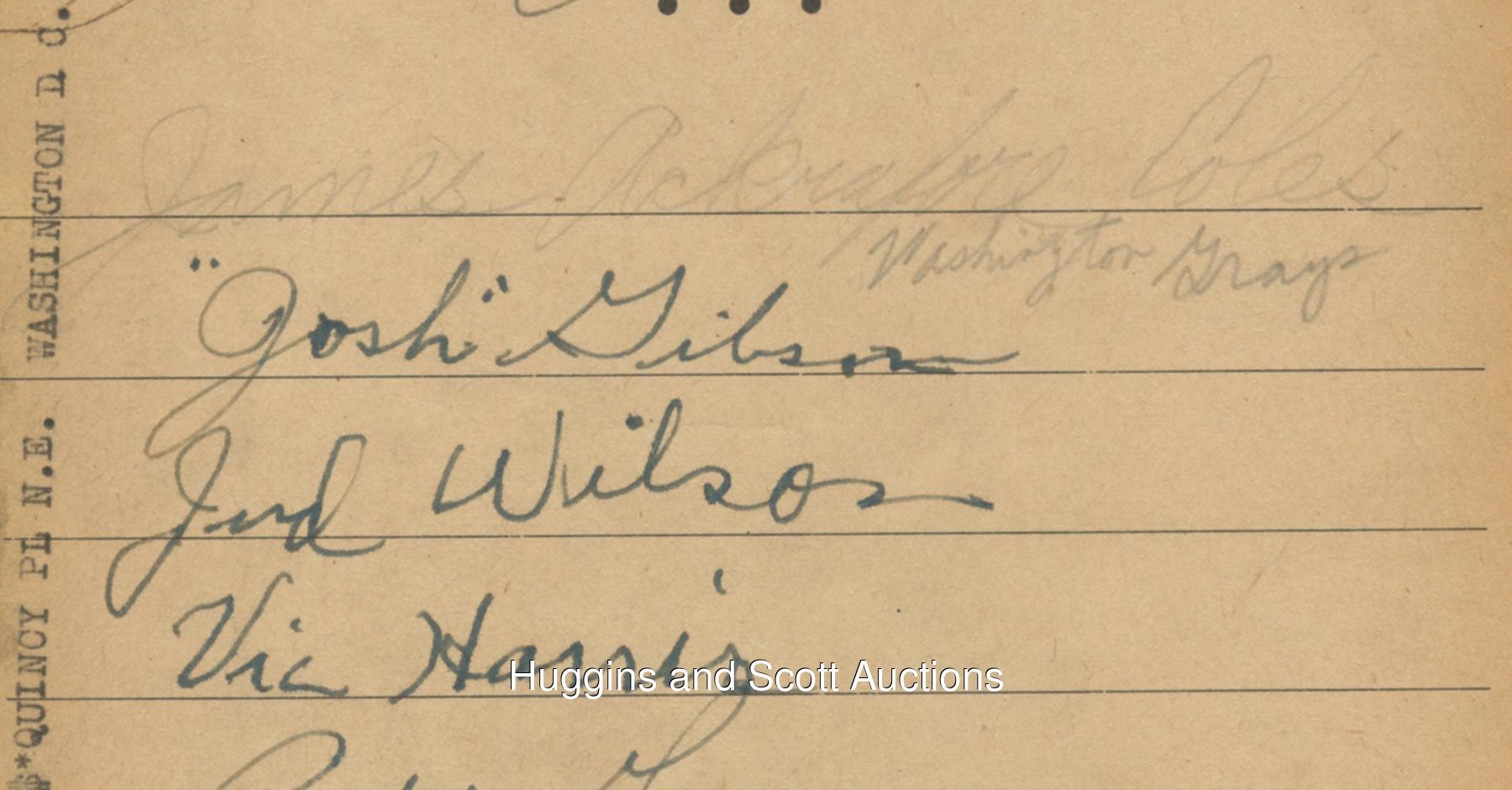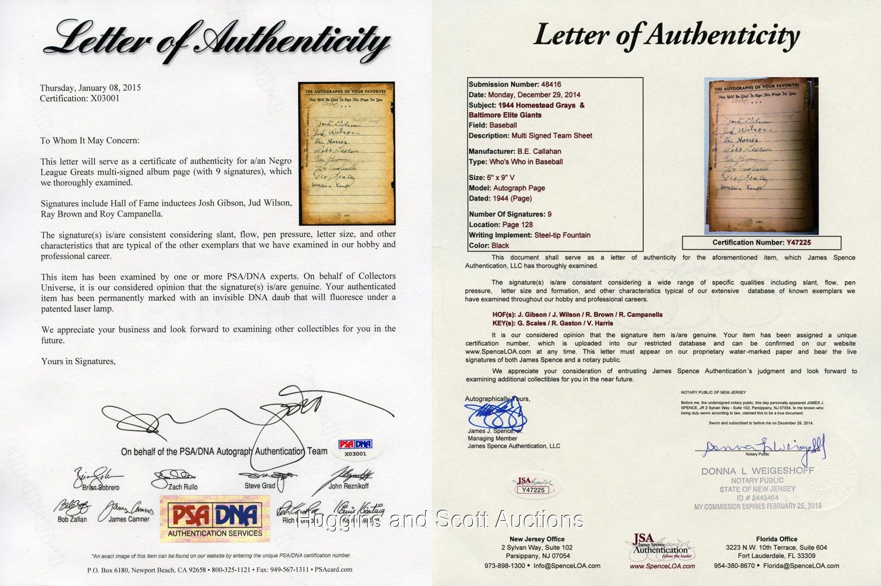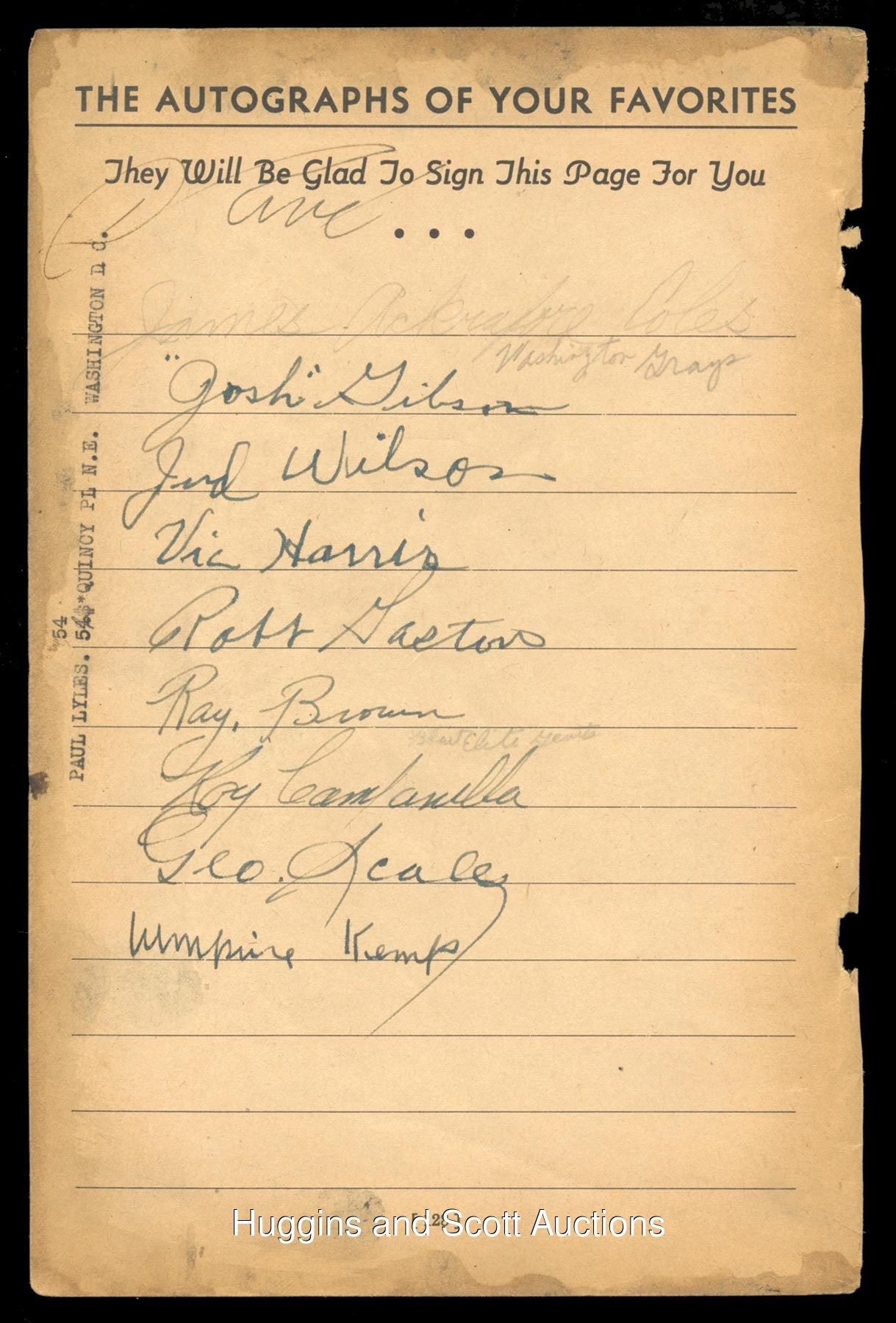 The numbers, records and accounts of games, seasons and even entire careers are skewed by numerous sources. Makeshift venues, second-rate equipment and less-than glamorous travel and boarding were realities. And as we grasp for truths regarding the Negro Leagues and their unheralded components, seldom, if ever, does it get more spectacular than the offered treasure: a published album page autographed by nine players from the 1944 season. Headlining the list is the ultra-rare penning of Josh Gibson, the equally fleeting signature of Jud Wilson and, with high probability, the earliest known Roy Campanella autograph in existence. Never has such a treasure surfaced and never have athletes endured as much hardship with so little reward. Discovered by our consignors in a Washington, D.C. row house among their father’s personal effects, this piece is equally sacred and scarce. It is without rival and ranks among the most amazing Negro League artifacts extant. It's with great pleasure that Huggins & Scott presents this exciting, fresh-to-the-hobby discovery and its never-before-seen constellation of Negro League legends. At a single glance, the 5-7/8 x 9” page is enticing merely because of its vintage appearance defined by age-induced toning along the borders. And it only gets better. Extracted from a 1944 Who's Who in Baseball annual (the remainder is offered separately in this auction as Lot #442), the obverse is a reminder of an era during which autographs were sought and given out of love for the game and its participants. The printed legend atop the page reads: “THE AUTOGRAPHS OF YOUR FAVORITES” with subtext proclaiming “They Will Be Glad To Sign This Page For You.” And they were. Executed on individual lines in black-ink steel tip fountain pen, the scriptings feature an inspiring lineup of Negro League legends. With high probability, the autographs were collected at a game between the Homestead Grays and Baltimore Elite Giants, as an unidentified graphite pencil signature has a “Washington Grays” inscription (the Grays split their home games between Pittsburgh and Washington, D.C. at that time). From there, the page is signed by: Josh Gibson (d.1947, “8-9” strength); Jud Wilson (d.1963, “8-9” strength); Vic Harris (“9-10” strength); Robert Gaston (“8-9” strength); Ray Brown (d.1965, “8” strength); Roy Campanella (“8” strength); George Scales (“8-9” strength) and Ducky Kemp Penalaver (signed “Umpire Kemp”; "9" strength).The Gibson signature is breathtaking in both its potency and rarity. Recent years have seen soaring auction prices for Gibson's signature alone, including over $80,000 in 2006 for an autographed photo postcard and just shy of $100,000 in 2009 for a 1941 contract. Gibson had been diagnosed with a brain tumor in 1943, declined surgery and endured headaches until his untimely passing in 1947. Despite his condition, “The Black Babe Ruth” posted an unfathomable .517 batting average in 1943. While accounts vary as to the lengths and number of Gibson’s home runs (the common assumption is that he hit nearly 800), testimony such as Bill Veeck’s comment that Gibson was “the greatest hitter he ever saw” tells us all we need to know. This rarefied relic also displays the etchings of six additional Negro League figures, headlined by Jud Wilson (d.1963) who is perhaps the most elusive twentieth century Hall of Fame autograph of them all. (In fact, in that same aforementioned 2006 auction, Wilson's autographed photo postcard garnered $32,000.) Represented as well is Josh Gibson's battery mate, fellow Hall of Famer Ray Brown (d.1965), a dominating hurler whose talents were mentioned in the same breath as those of Paige and Feller. Rounding out the Grays are Vic Harris (d.1978) and Robert Gaston (d. 2000), while Campy is accompanied by Baltimore Elite Giants teammate George Scales (d.1976). And last but not least, there is umpire Ducky Kemp—a former player himself who was reputed to be one of just three salaried Negro League umps during the early 1940s. With four Hall of Famers and one of only three salaried Negro League arbiters having decorated the page with bold signatures, this diamond heirloom is the subject of superlatives, trumping all other Negro League collectibles. Accompanying are full photo LOAs from James Spence Authentications and PSA/DNA.