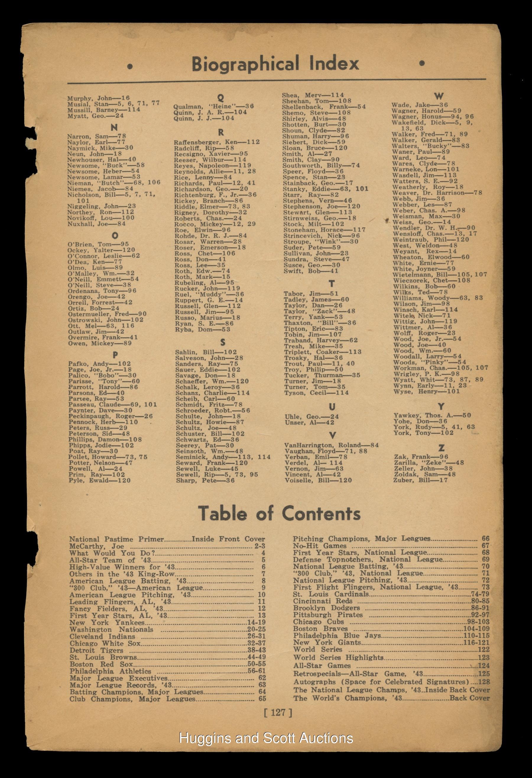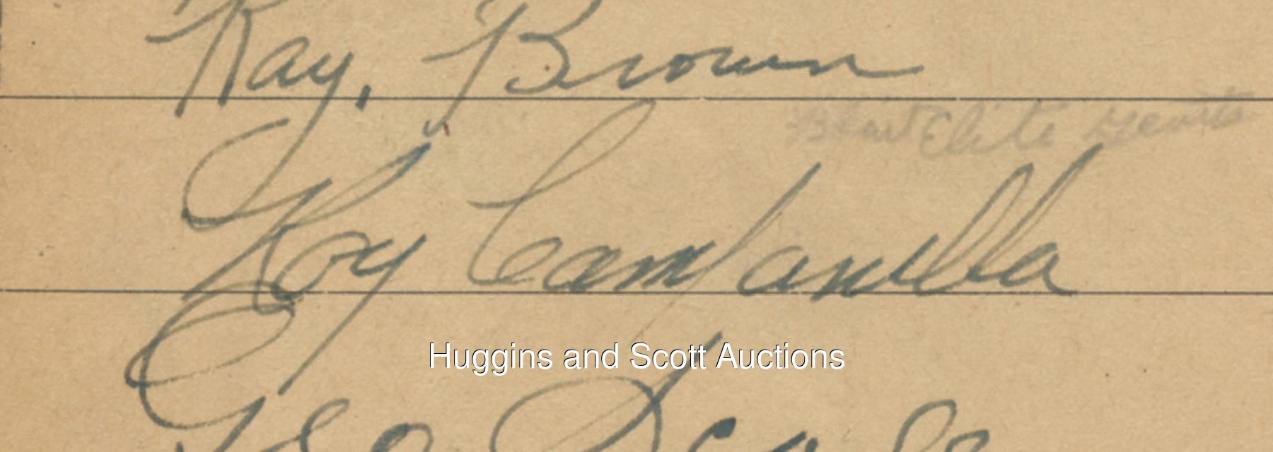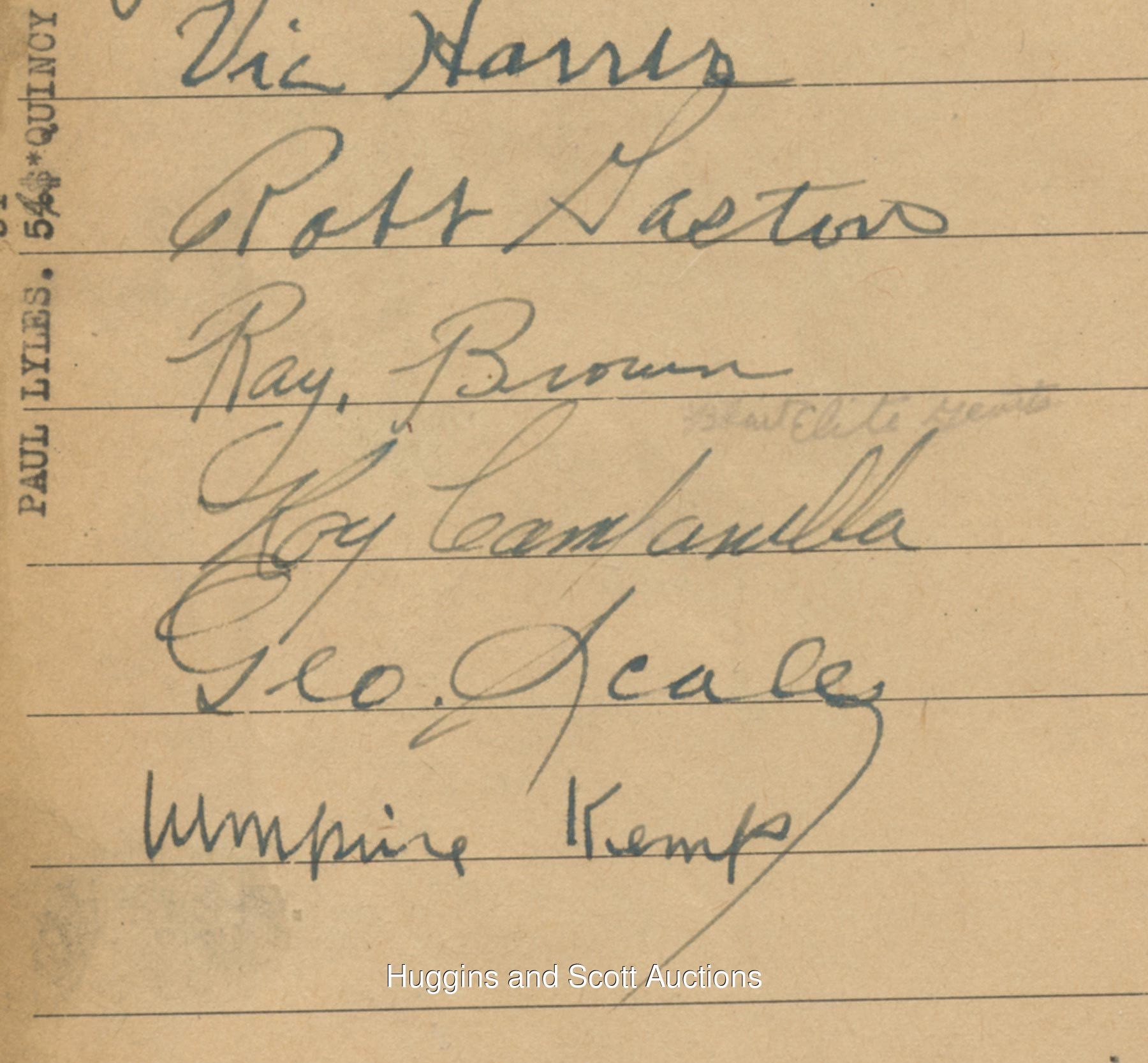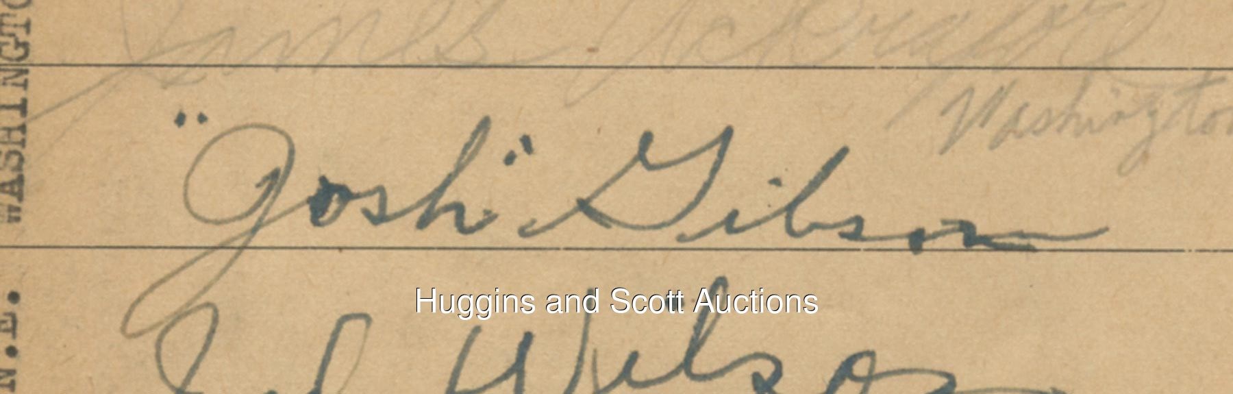 The numbers, records and accounts of games, seasons and even entire careers are skewed by numerous sources. Makeshift venues, second-rate equipment and less-than glamorous travel and boarding were realities. And as we grasp for truths regarding the Negro Leagues and their unheralded components, seldom, if ever, does it get more spectacular than the offered treasure: a published album page autographed by nine players from the 1944 season. Headlining the list is the ultra-rare penning of Josh Gibson, the equally fleeting signature of Jud Wilson and, with high probability, the earliest known Roy Campanella autograph in existence. Never has such a treasure surfaced and never have athletes endured as much hardship with so little reward. Discovered by our consignors in a Washington, D.C. row house among their father’s personal effects, this piece is equally sacred and scarce. It is without rival and ranks among the most amazing Negro League artifacts extant. It's with great pleasure that Huggins & Scott presents this exciting, fresh-to-the-hobby discovery and its never-before-seen constellation of Negro League legends. At a single glance, the 5-7/8 x 9” page is enticing merely because of its vintage appearance defined by age-induced toning along the borders. And it only gets better. Extracted from a 1944 Who's Who in Baseball annual (the remainder is offered separately in this auction as Lot #442), the obverse is a reminder of an era during which autographs were sought and given out of love for the game and its participants. The printed legend atop the page reads: “THE AUTOGRAPHS OF YOUR FAVORITES” with subtext proclaiming “They Will Be Glad To Sign This Page For You.” And they were. Executed on individual lines in black-ink steel tip fountain pen, the scriptings feature an inspiring lineup of Negro League legends. With high probability, the autographs were collected at a game between the Homestead Grays and Baltimore Elite Giants, as an unidentified graphite pencil signature has a “Washington Grays” inscription (the Grays split their home games between Pittsburgh and Washington, D.C. at that time). From there, the page is signed by: Josh Gibson (d.1947, “8-9” strength); Jud Wilson (d.1963, “8-9” strength); Vic Harris (“9-10” strength); Robert Gaston (“8-9” strength); Ray Brown (d.1965, “8” strength); Roy Campanella (“8” strength); George Scales (“8-9” strength) and Ducky Kemp Penalaver (signed “Umpire Kemp”; "9" strength).The Gibson signature is breathtaking in both its potency and rarity. Recent years have seen soaring auction prices for Gibson's signature alone, including over $80,000 in 2006 for an autographed photo postcard and just shy of $100,000 in 2009 for a 1941 contract. Gibson had been diagnosed with a brain tumor in 1943, declined surgery and endured headaches until his untimely passing in 1947. Despite his condition, “The Black Babe Ruth” posted an unfathomable .517 batting average in 1943. While accounts vary as to the lengths and number of Gibson’s home runs (the common assumption is that he hit nearly 800), testimony such as Bill Veeck’s comment that Gibson was “the greatest hitter he ever saw” tells us all we need to know. This rarefied relic also displays the etchings of six additional Negro League figures, headlined by Jud Wilson (d.1963) who is perhaps the most elusive twentieth century Hall of Fame autograph of them all. (In fact, in that same aforementioned 2006 auction, Wilson's autographed photo postcard garnered $32,000.) Represented as well is Josh Gibson's battery mate, fellow Hall of Famer Ray Brown (d.1965), a dominating hurler whose talents were mentioned in the same breath as those of Paige and Feller. Rounding out the Grays are Vic Harris (d.1978) and Robert Gaston (d. 2000), while Campy is accompanied by Baltimore Elite Giants teammate George Scales (d.1976). And last but not least, there is umpire Ducky Kemp—a former player himself who was reputed to be one of just three salaried Negro League umps during the early 1940s. With four Hall of Famers and one of only three salaried Negro League arbiters having decorated the page with bold signatures, this diamond heirloom is the subject of superlatives, trumping all other Negro League collectibles. Accompanying are full photo LOAs from James Spence Authentications and PSA/DNA.