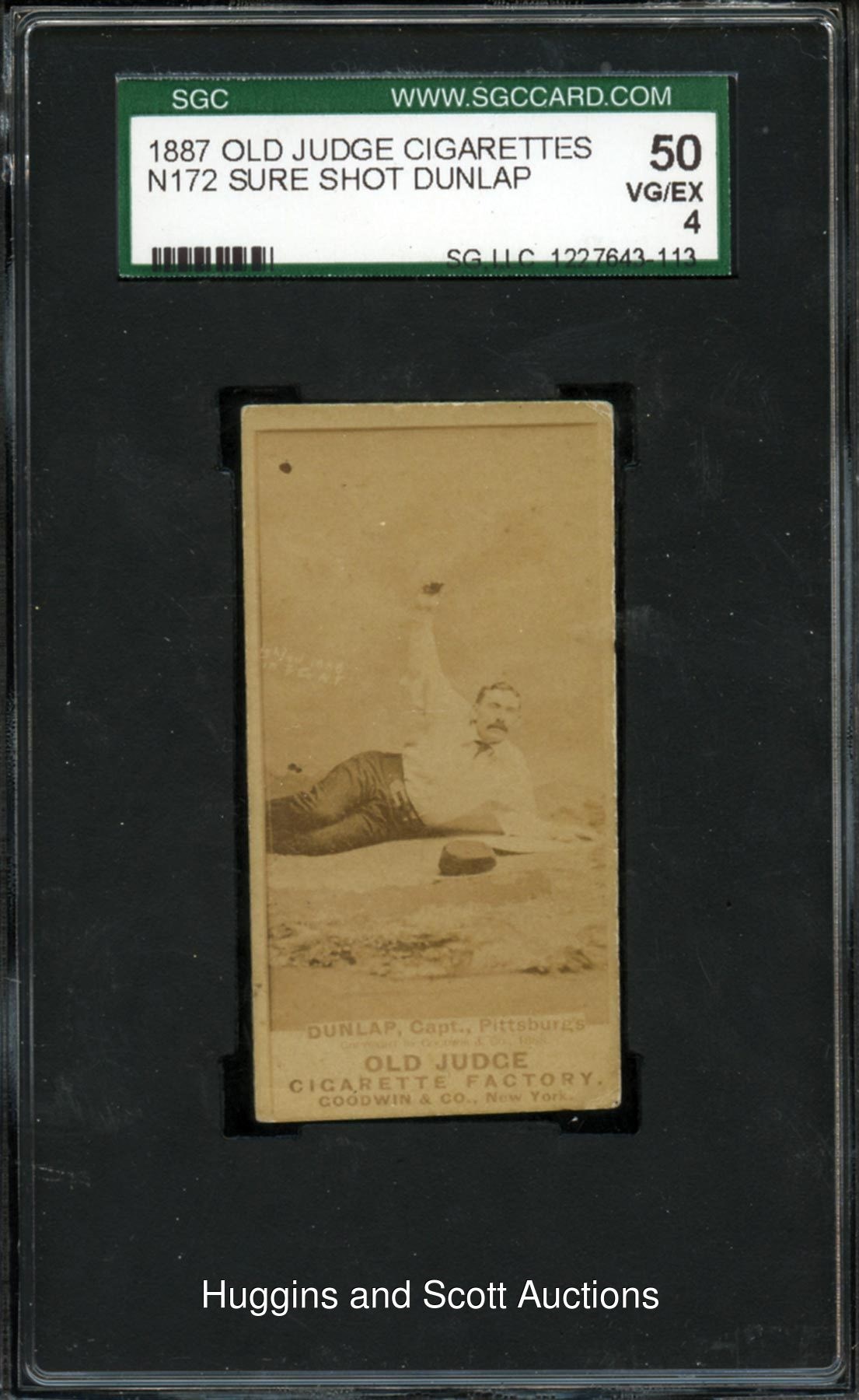 Graded 50 VG-EX 4 by SGC. Confirmed as pose #138-1 from the 1887 N172 Old Judge edition. Solid mid-grade specimen of "Sure Shot" Dunlap depicting the Pittsburg ball player as he heaves a slide for the bag. Despite a slight tilt, the crease-fee sepia obverse still presents nicely with a clean blank reverse.