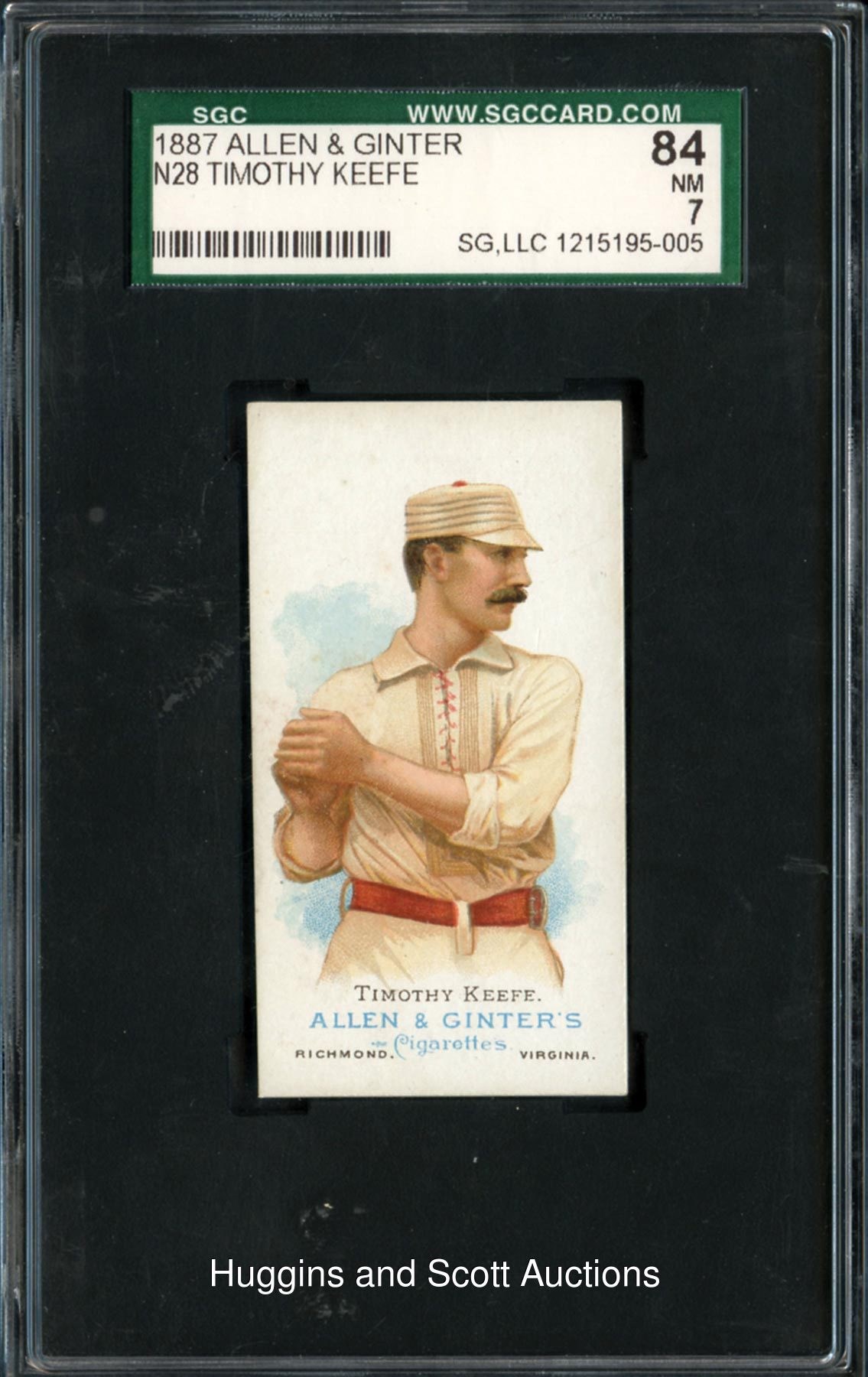 High-Grade Nineteenth Century Hall of Famer! Graded 84 NM 7 by SGC. For 14 playing seasons the mustachioed (Sir) Timothy Keefe stymied opposing batters with his knee-buckling repertoire and amassed 342 career victories. The 1887 N28 Allen & Ginter specimen depicts the Hall of Famer at the height of his prowess. This 128 year-old jewel displays four sharp corners, crisp edges, impeccable centering and a perfectly contrasted illustration. The checklist reverse escaped any pencil markings and exhibits bold printing. Of the 108 total copies adjudicated by the grading service, this relic survives as 1 of 9 at the grading level with only one better.