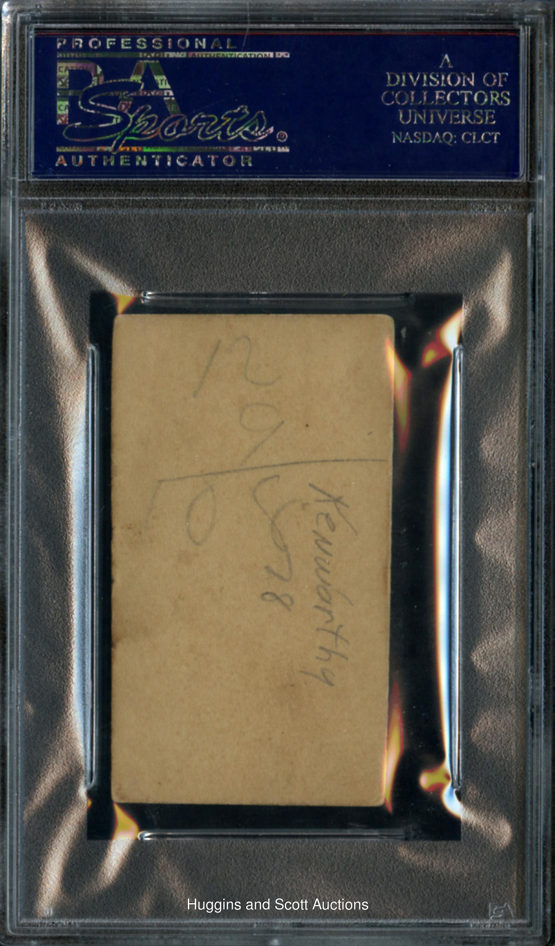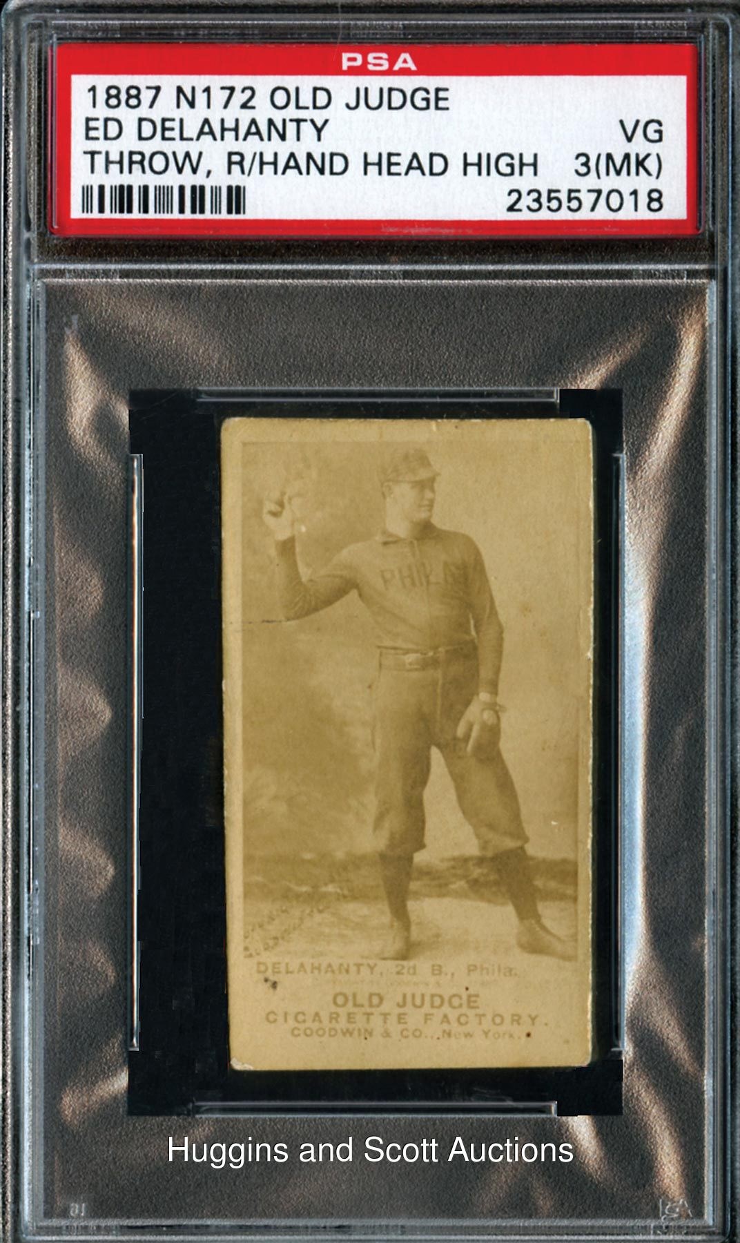 Only Confirmed PSA Graded Pose! Graded VG 3 with an (mk) qualifier by PSA. In an inauspicious start to his baseball career, 21 year-old Ed Delehanty batted a paltry .228 during his debut season with the Philadelphia Quakers of the National League. Fortunately, the Cleveland native righted the ship and became one of the most fearsome sluggers of the late nineteenth century. The fresh-faced second baseman is clearly portrayed on this coveted 1887 N172 Old Judge "throwing right, hand head high" pose. The Hall of Fame portrayal is crease-free with even corner wear and superficial perimeter soiling. Importantly, the 128 year-old sepia action pose is bright and remarkably clear. Neatly placed pencil notations are etched on the blank reverse. For connoisseurs of the N172 Old Judge designation this high-profile specimen will help set your collection apart.
