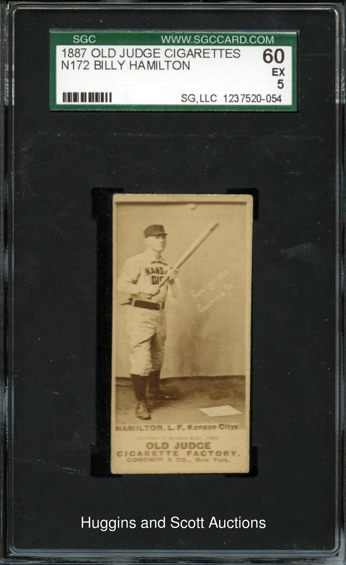 Nineteenth Century Hall of Famer! Graded 60 EX 5 and confirmed as pose #210-2 in the 1887 N172 Old Judge edition. The fresh-faced "Sliding" Billy Hamilton takes aim at a suspended baseball as a member of the Kansas City Cowboys on this 128 year-old tobacco card. With strong corners, virtually untouched edges and decent centering, this remarkably clear rendition of the base caper presents on par with its technical appraisal. Of the 20 total copies assessed by the grading service, this particular sample survives as 1 of 3 at the tier with none better. Hamilton was inducted into the National Baseball Hall of Fame by the Veteran's Committee in 1961.