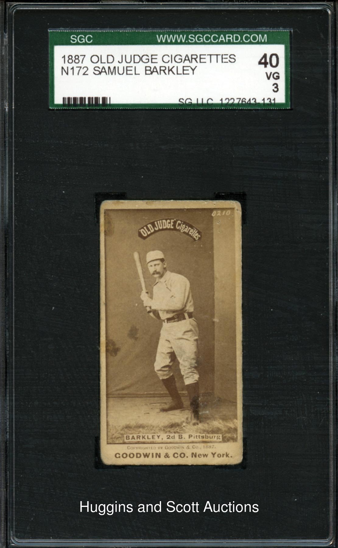 Graded 40 VG 3 by SGC. Although he passed away more than a century ago, Samuel Barkley of Pittsburg lives on with the offered 1887 N172 Old Judge artifact. This mid-grade and crease-free pose #19-6 presents at the peak of its technical judgment.