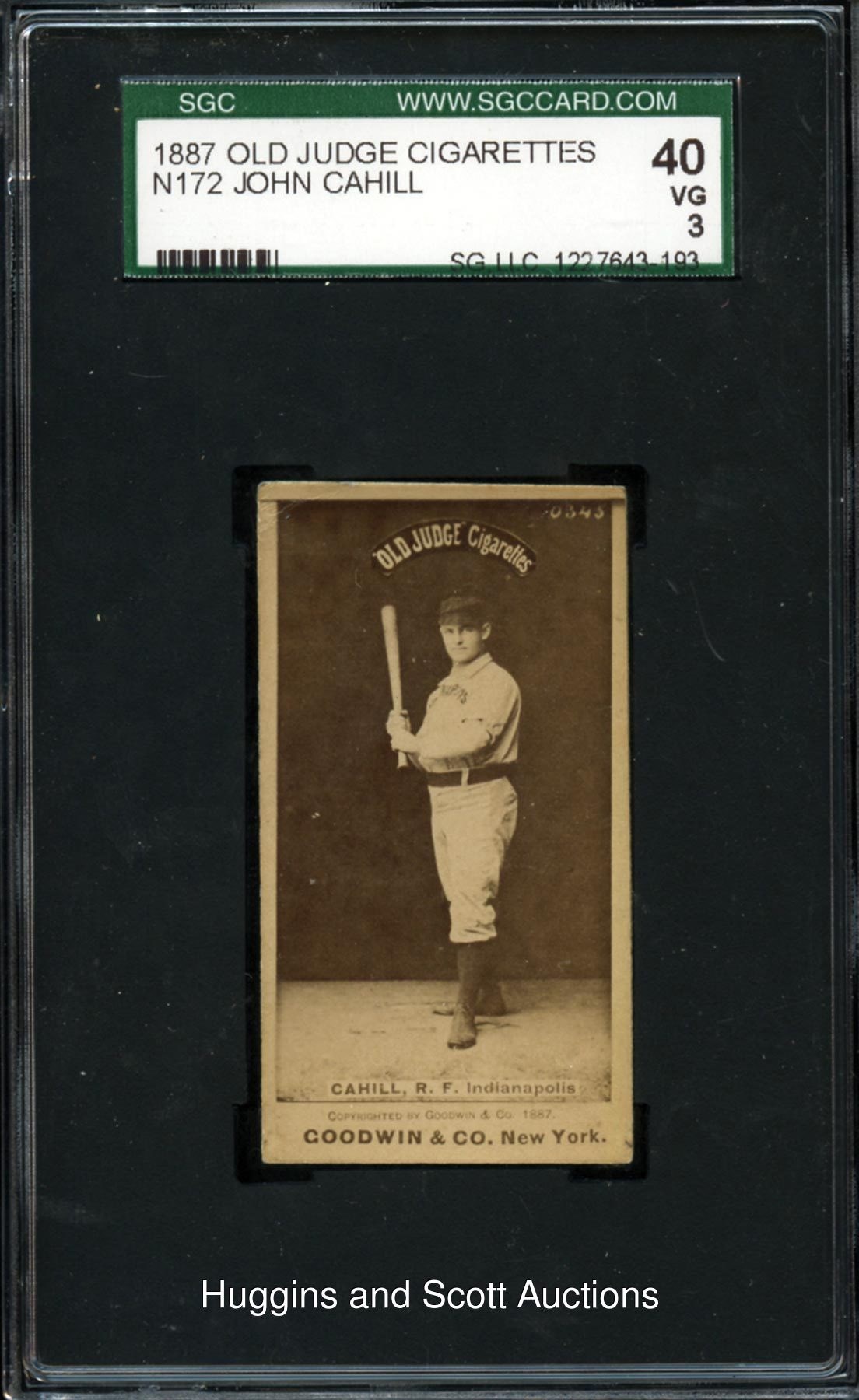 Graded 40 VG 3 by SGC. The ill-fated John Cahill (d.1901) of the Indianapolis Hoosiers is portrayed in crystal clear detail on this 1887 N172 Old Judge sample. Mid-grade Type that presents at the peak of its technical grade. Confirmed as pose #61-2 in the formidable set.