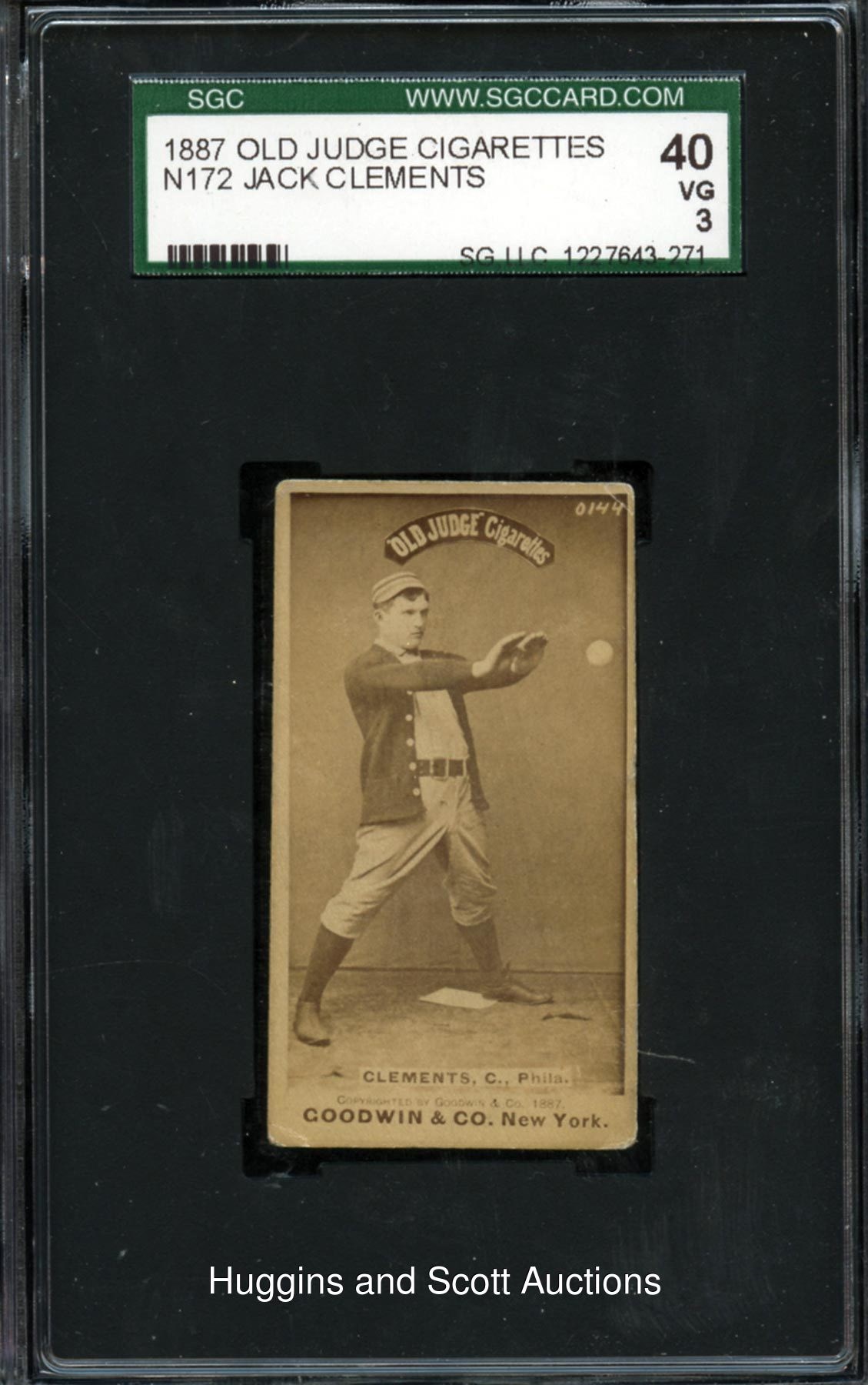 Graded 40 VG 3 by SGC. Confirmed as pose #79-2 from the 1887 N172 Old Judge issue. Barehanded backstop Jack Clements stands ready for the offered nineteenth century tobacco card. This 128 year-old antiquity presents at the peak of the opined technical grade.